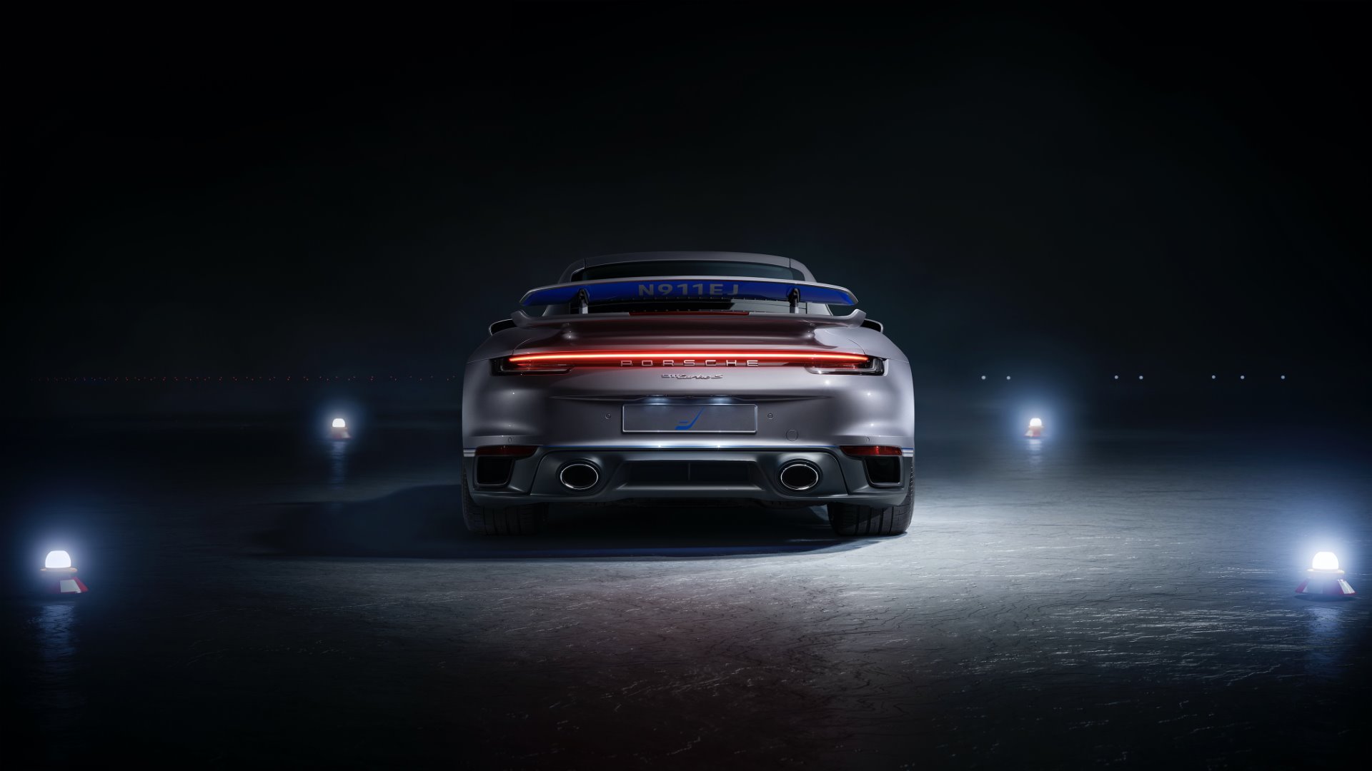 The Duet logo is used on the exterior and in the interior of both products: it is embossed on the head restraints, for example, and also features on the limited-edition badge. Other design details on this very special 911 Turbo S establish a link to aviation: the individual registration of the respective jet can be found on the underside of the rear wing and on the sides of the vehicle key. The door sill trims feature “No step” lettering illuminated in red. The dial on the stopwatch from the Sport Chrono package has a printed-on artificial horizon.