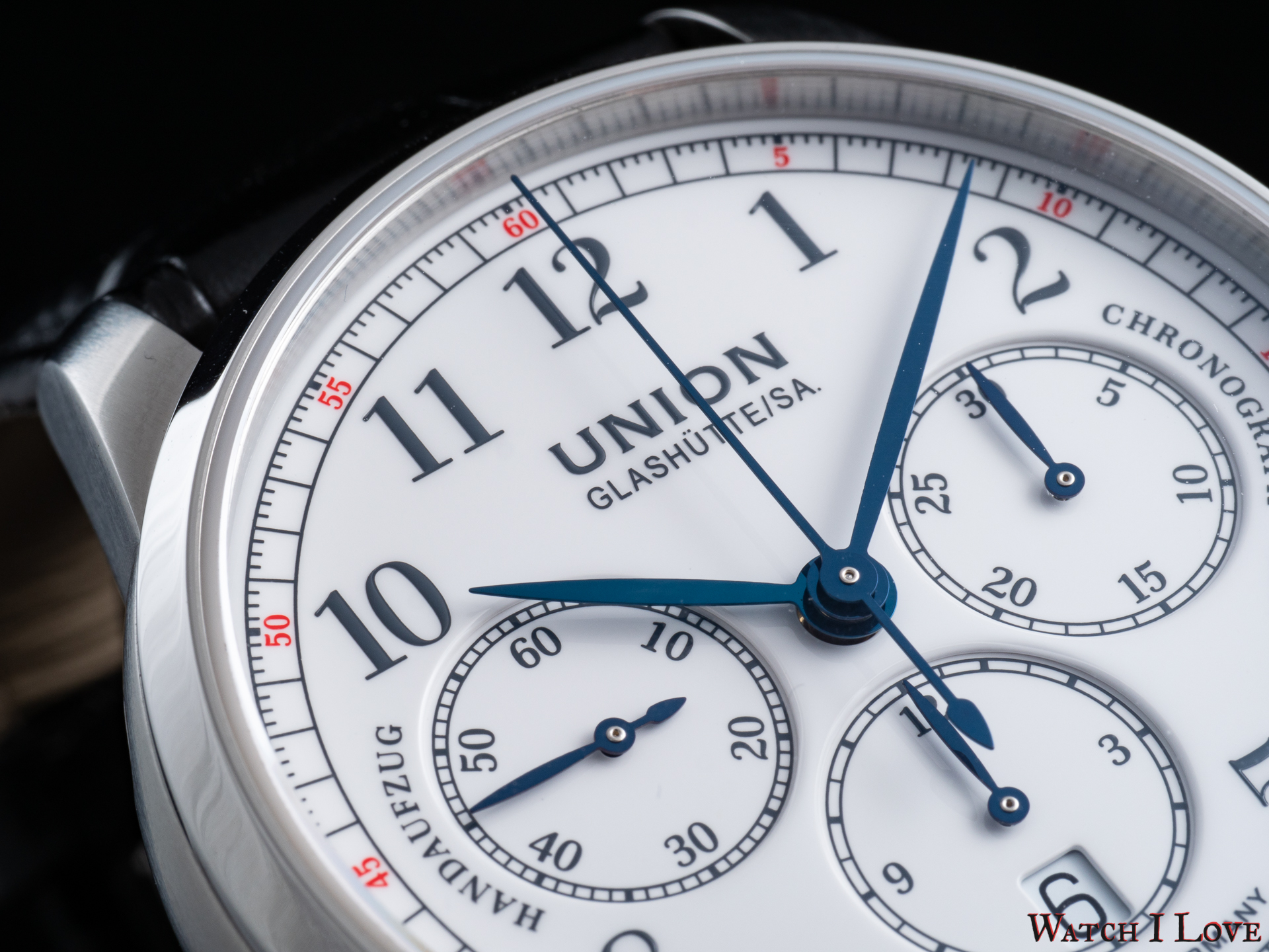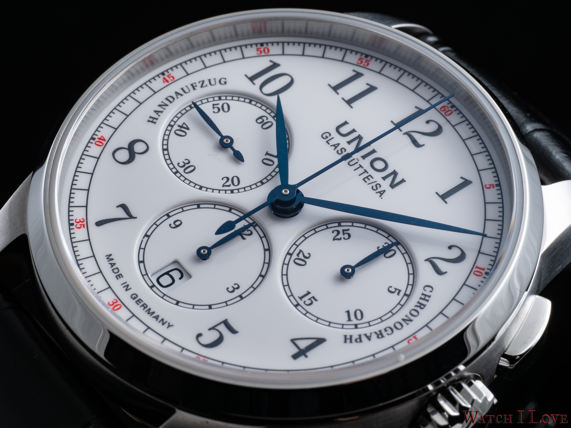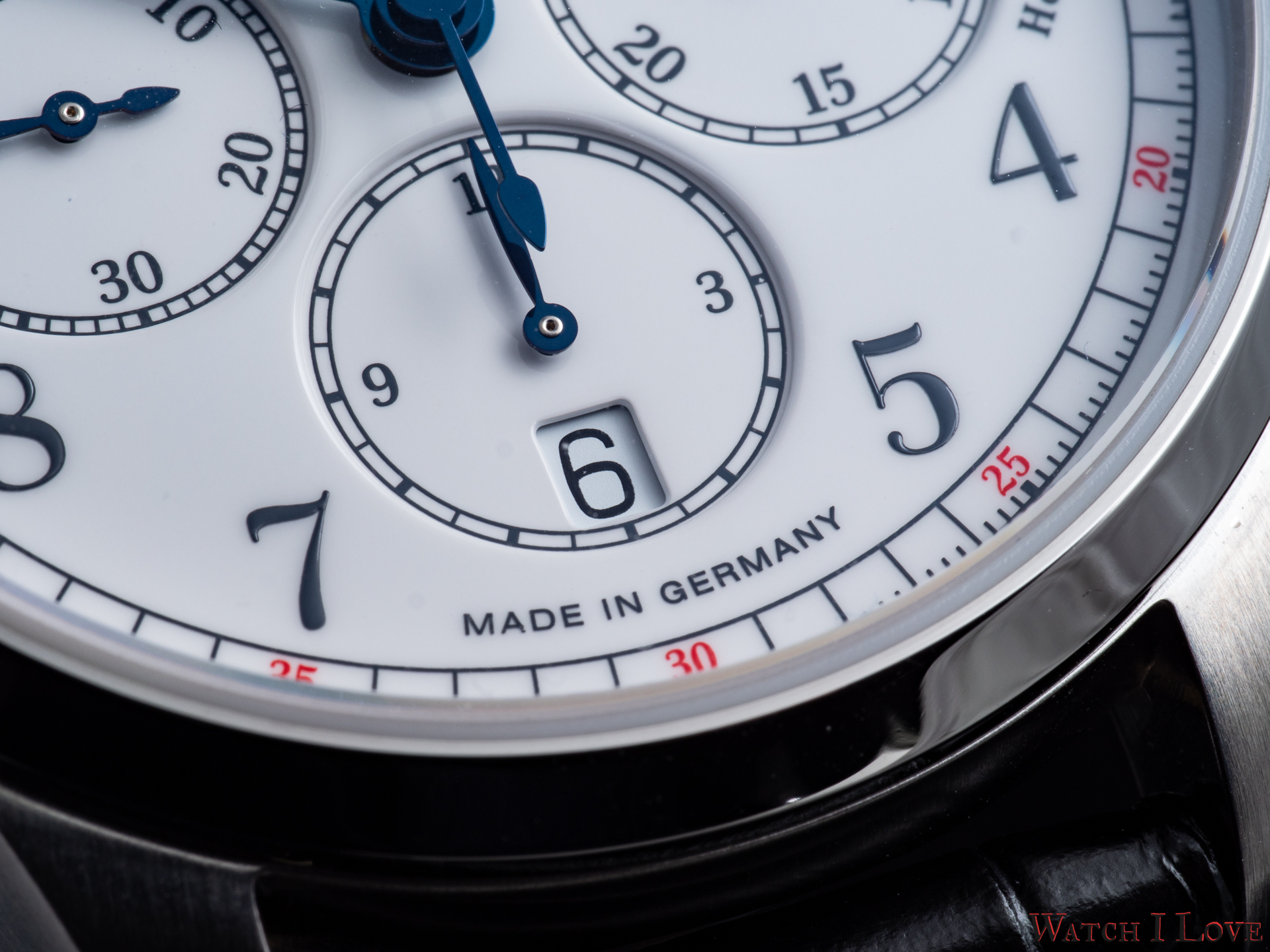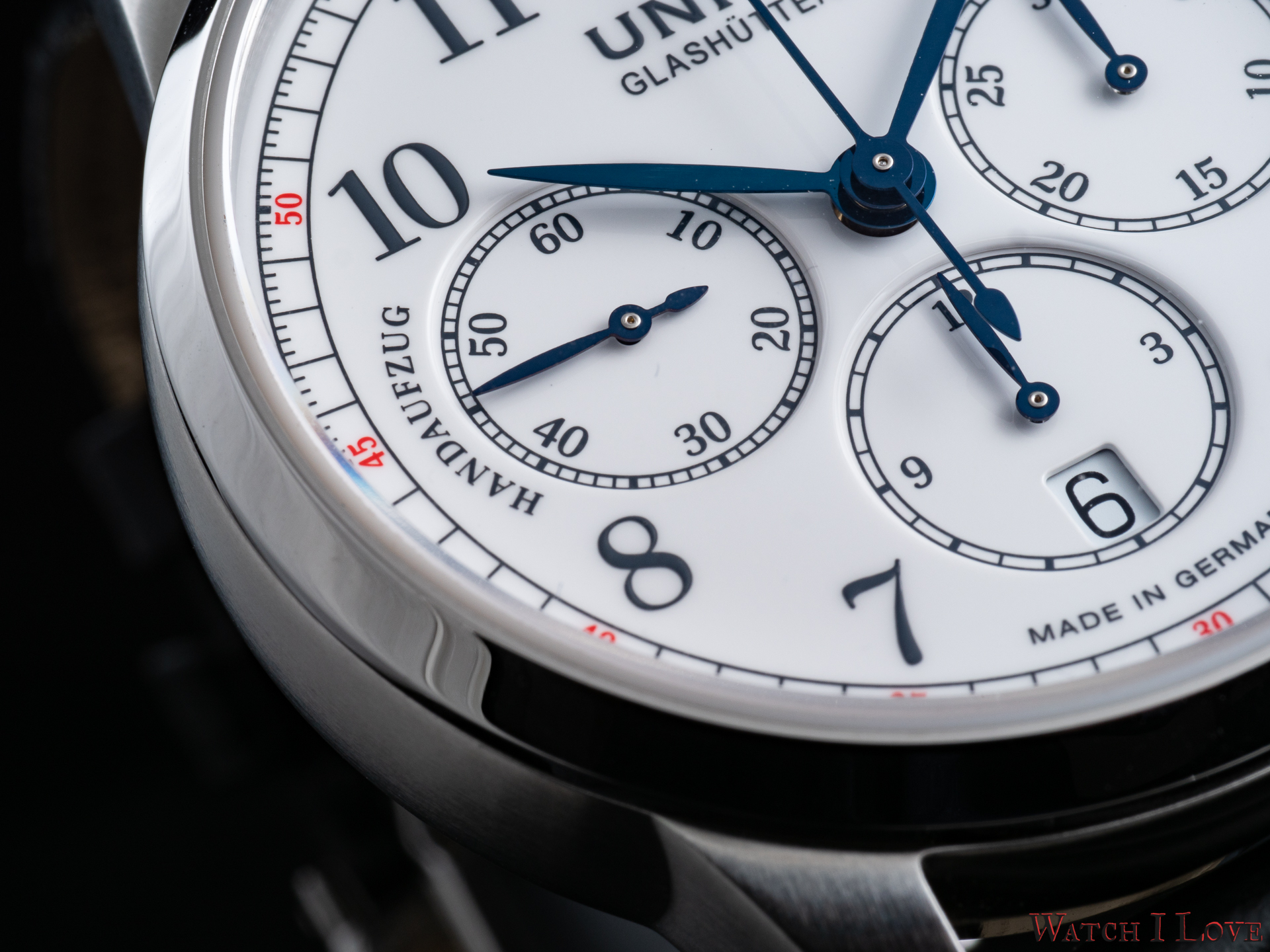 The running seconds are displayed in a subdial at 9 o’clock. In the same area was printed the “Handaufzug” – hand-wound, as a mark of the calibre’s type. This mark is symmetrically balanced on the right side by the “Chronograph” mark. And all is well balanced by the “Made in Germany” printed on the lower side of the dial.