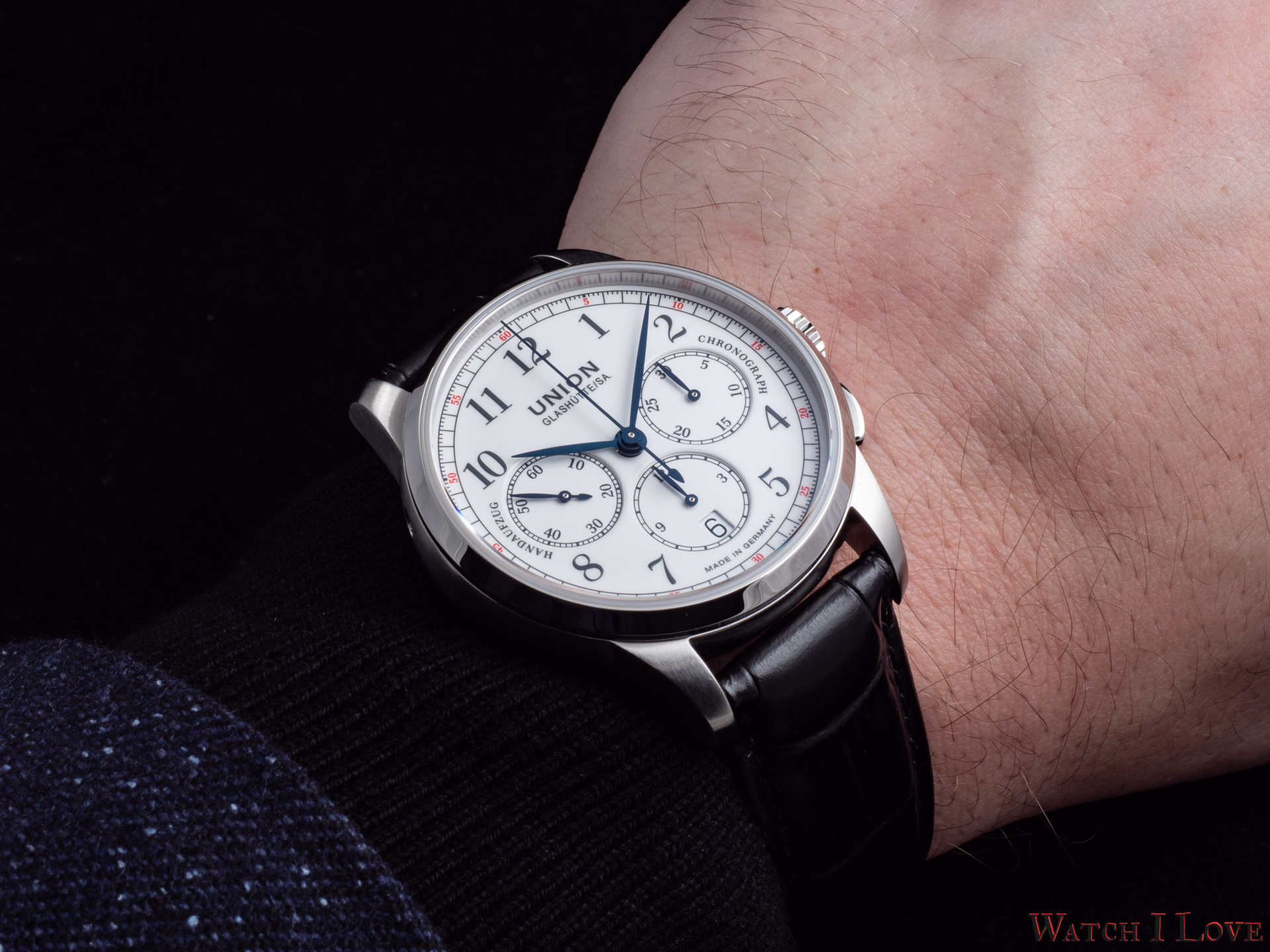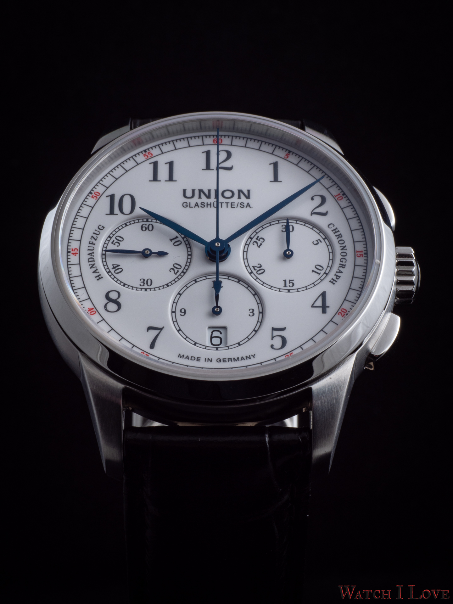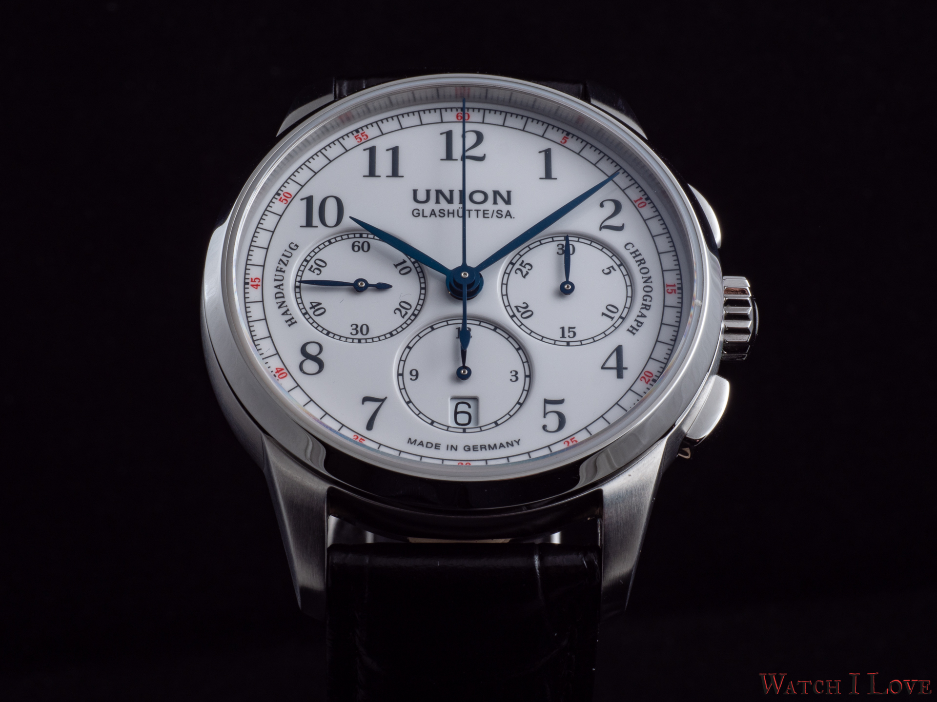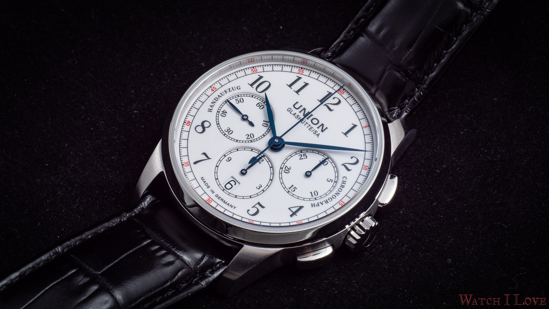 The running seconds are displayed in a subdial at 9 o’clock. In the same area was printed the “Handaufzug” – hand-wound, as a mark of the calibre’s type. This mark is symmetrically balanced on the right side by the “Chronograph” mark. And all is well balanced by the “Made in Germany” printed on the lower side of the dial.