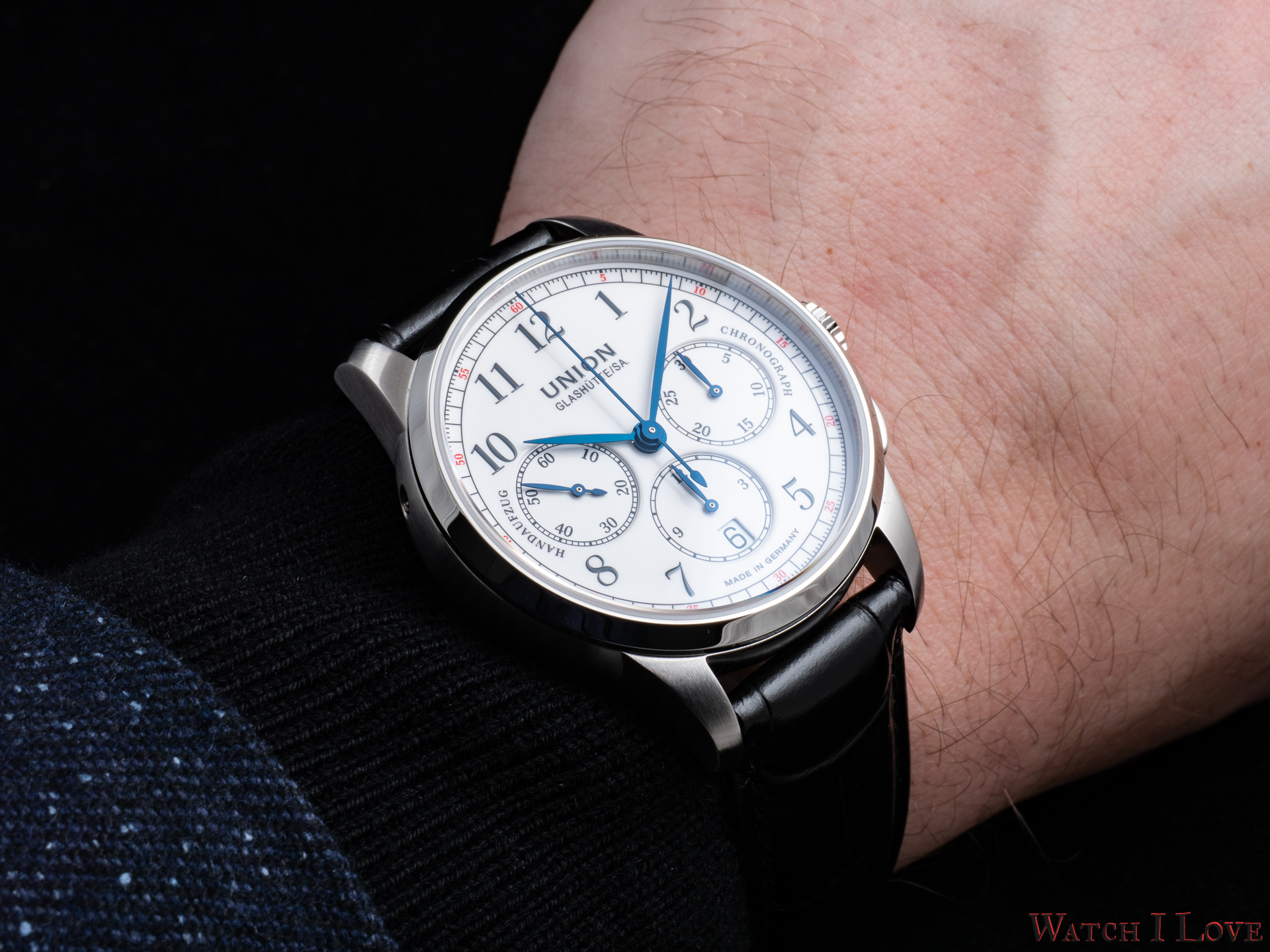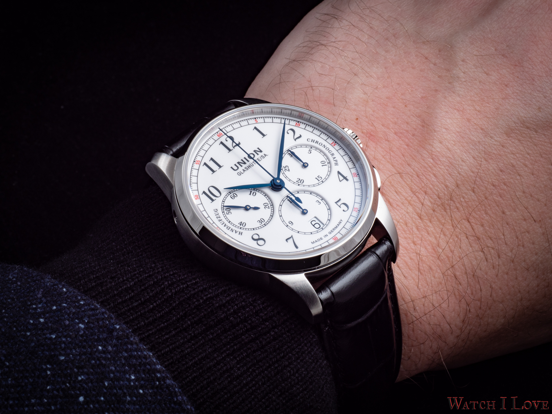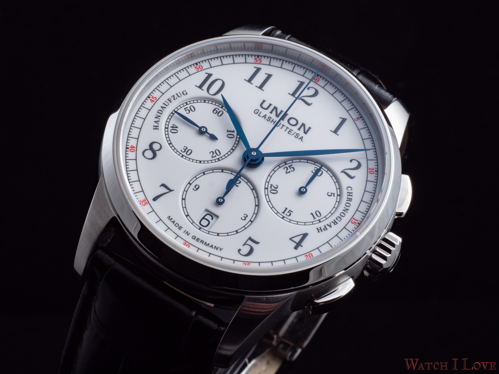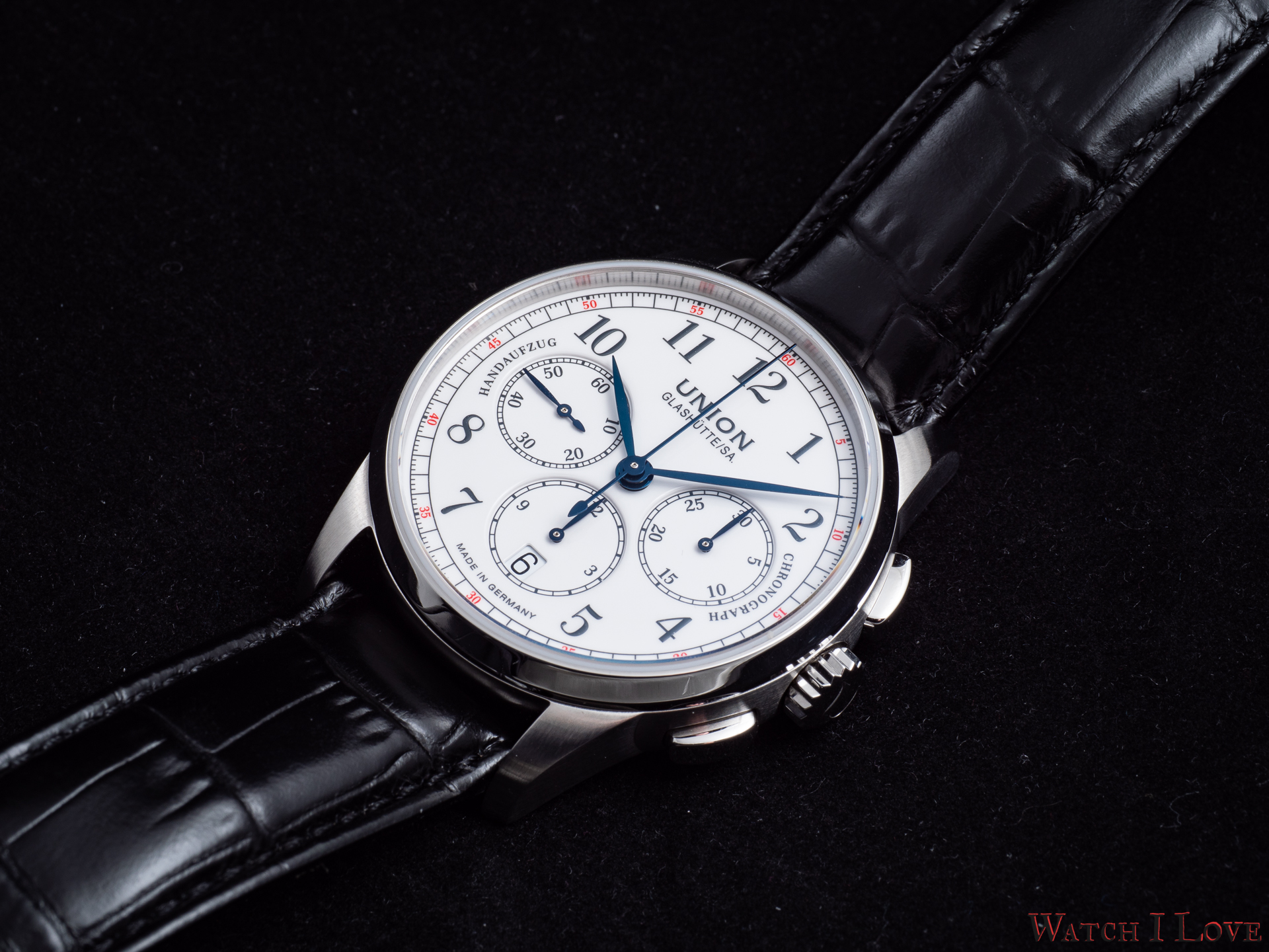 The running seconds are displayed in a subdial at 9 o’clock. In the same area was printed the “Handaufzug” – hand-wound, as a mark of the calibre’s type. This mark is symmetrically balanced on the right side by the “Chronograph” mark. And all is well balanced by the “Made in Germany” printed on the lower side of the dial.