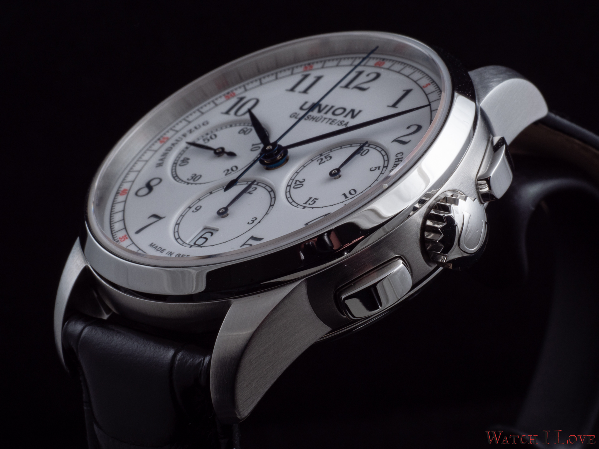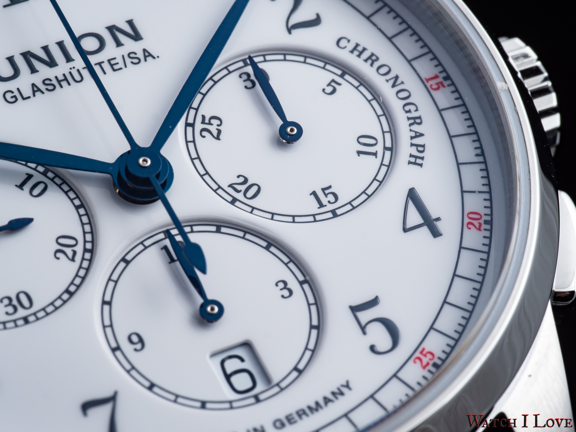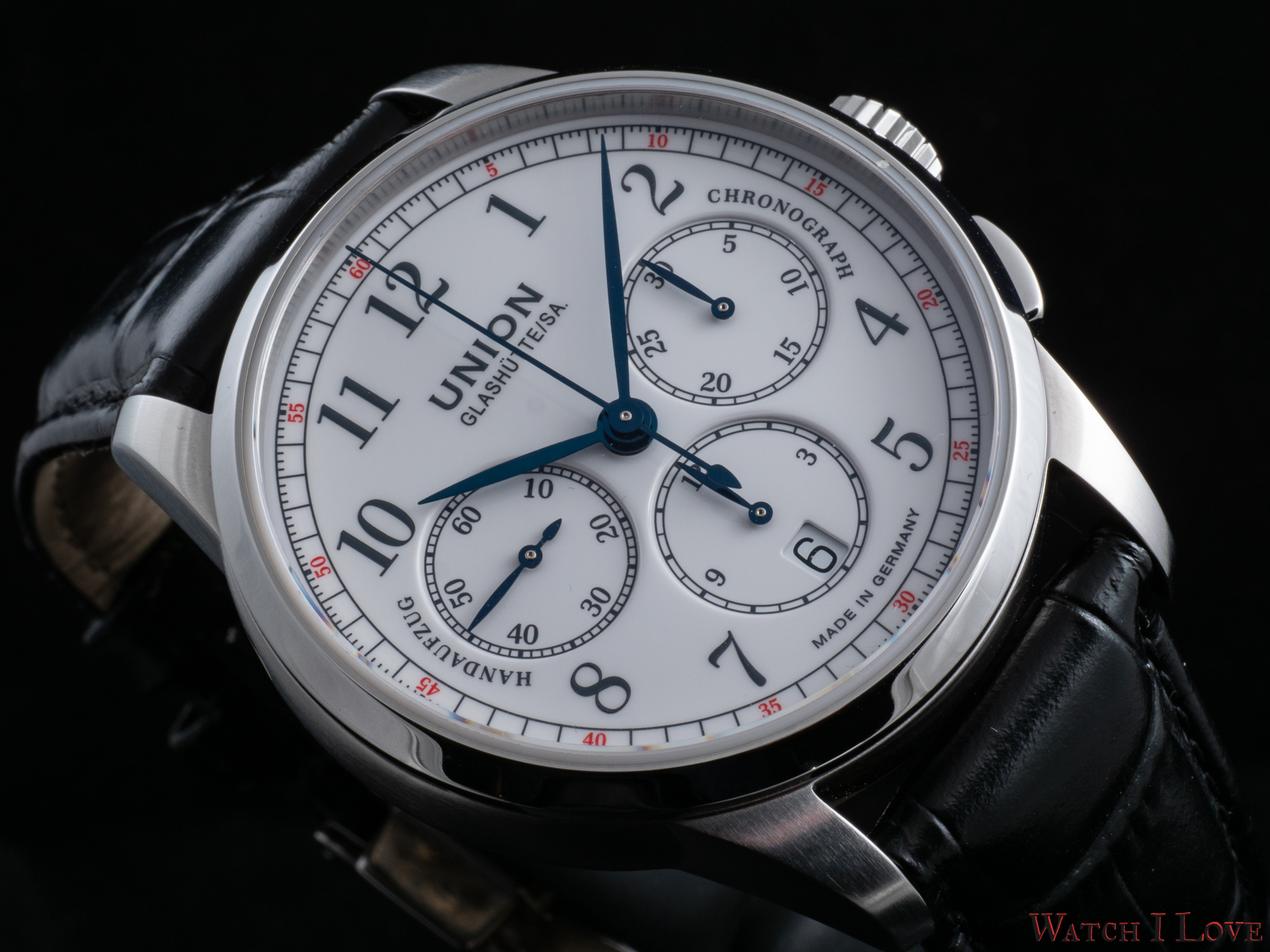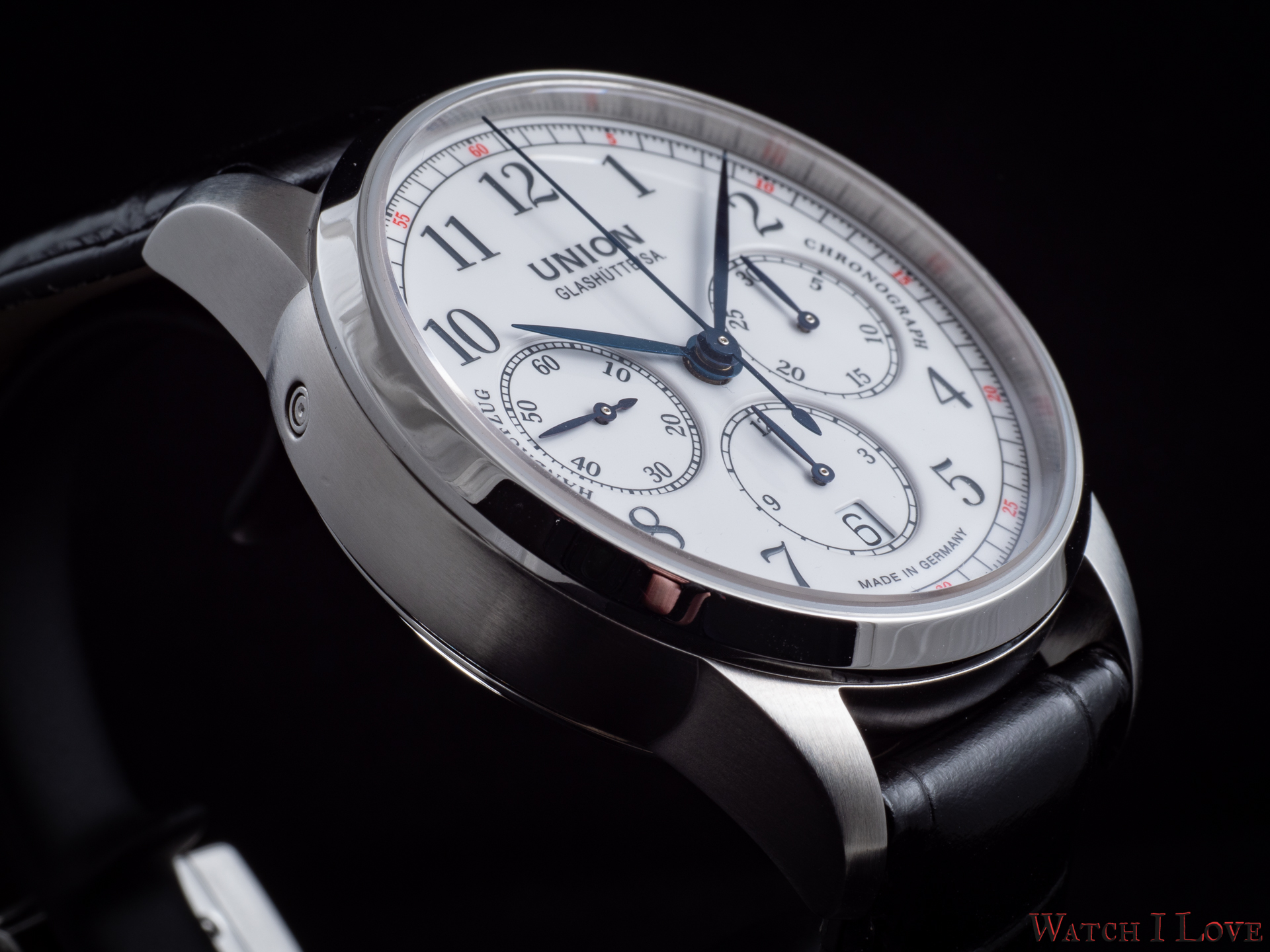 The running seconds are displayed in a subdial at 9 o’clock. In the same area was printed the “Handaufzug” – hand-wound, as a mark of the calibre’s type. This mark is symmetrically balanced on the right side by the “Chronograph” mark. And all is well balanced by the “Made in Germany” printed on the lower side of the dial.