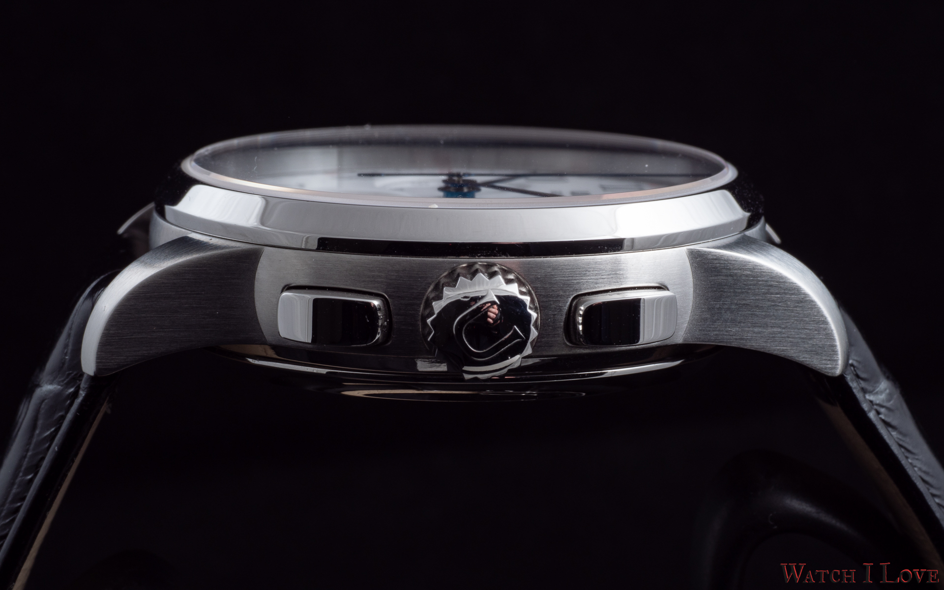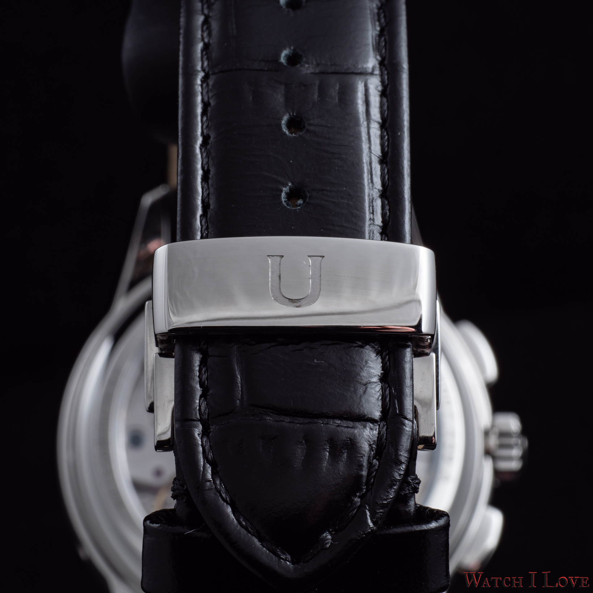 On the right side, we find the traditional “U” decorated crown and the chronograph’s polished rectangular pushers. The watch is covered with a straight sapphire crystal with a chamfered edge. The crystal makes a nice combination with the raised and bevelled bezel.