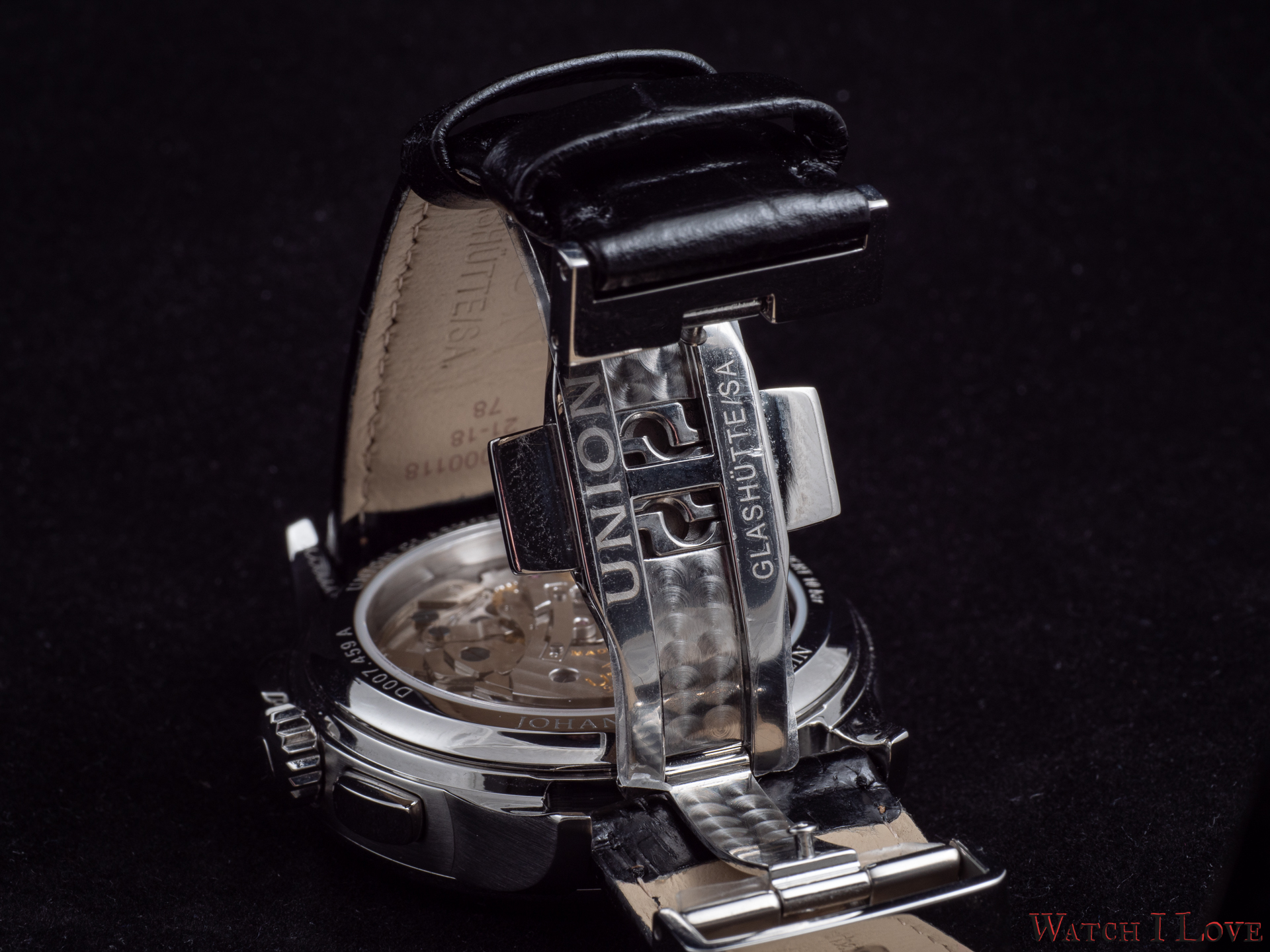 Another exterior element that worth mentioning is the folding clasp that received an extra decoration – hand-made perlage. On the exterior buckle can be observed again the “U” logo of Union Glashütte. The back is covered by a see-through case back.