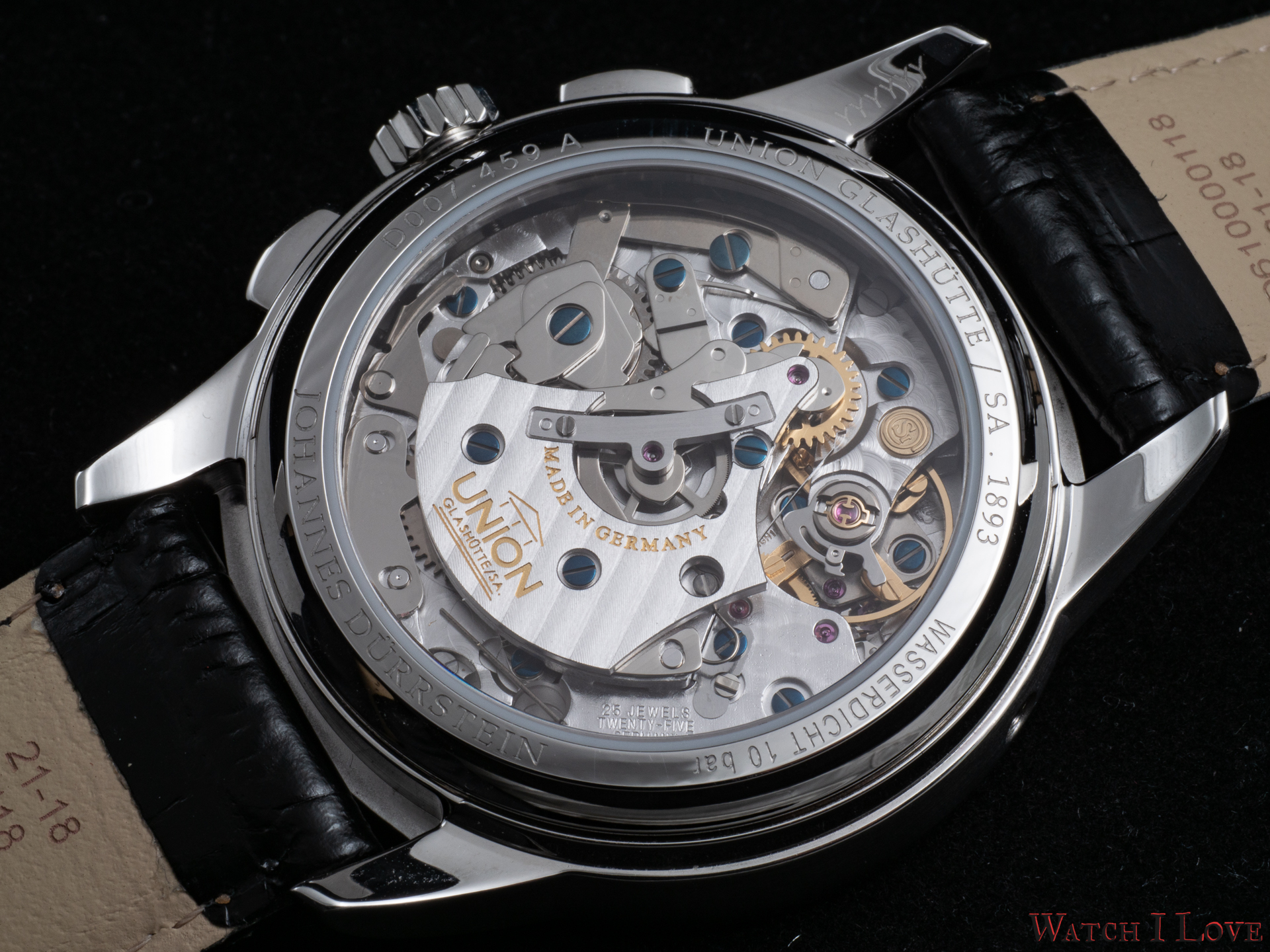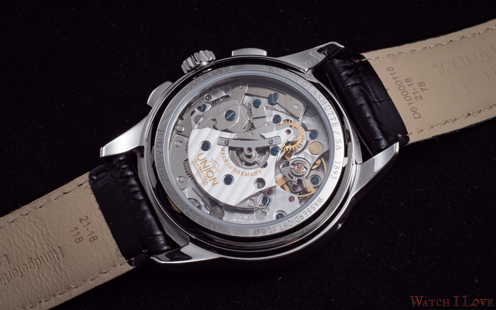 Union Glashütte 1893 Johannes Dürrstein Edition Chronograph is powered by the Calibre UNG-59.SI. The movement is a 4 Hz manual wound with an impressive power reserve of 60 hours. The “Si” comes from the silicon balance spring that has amagnetic properties.