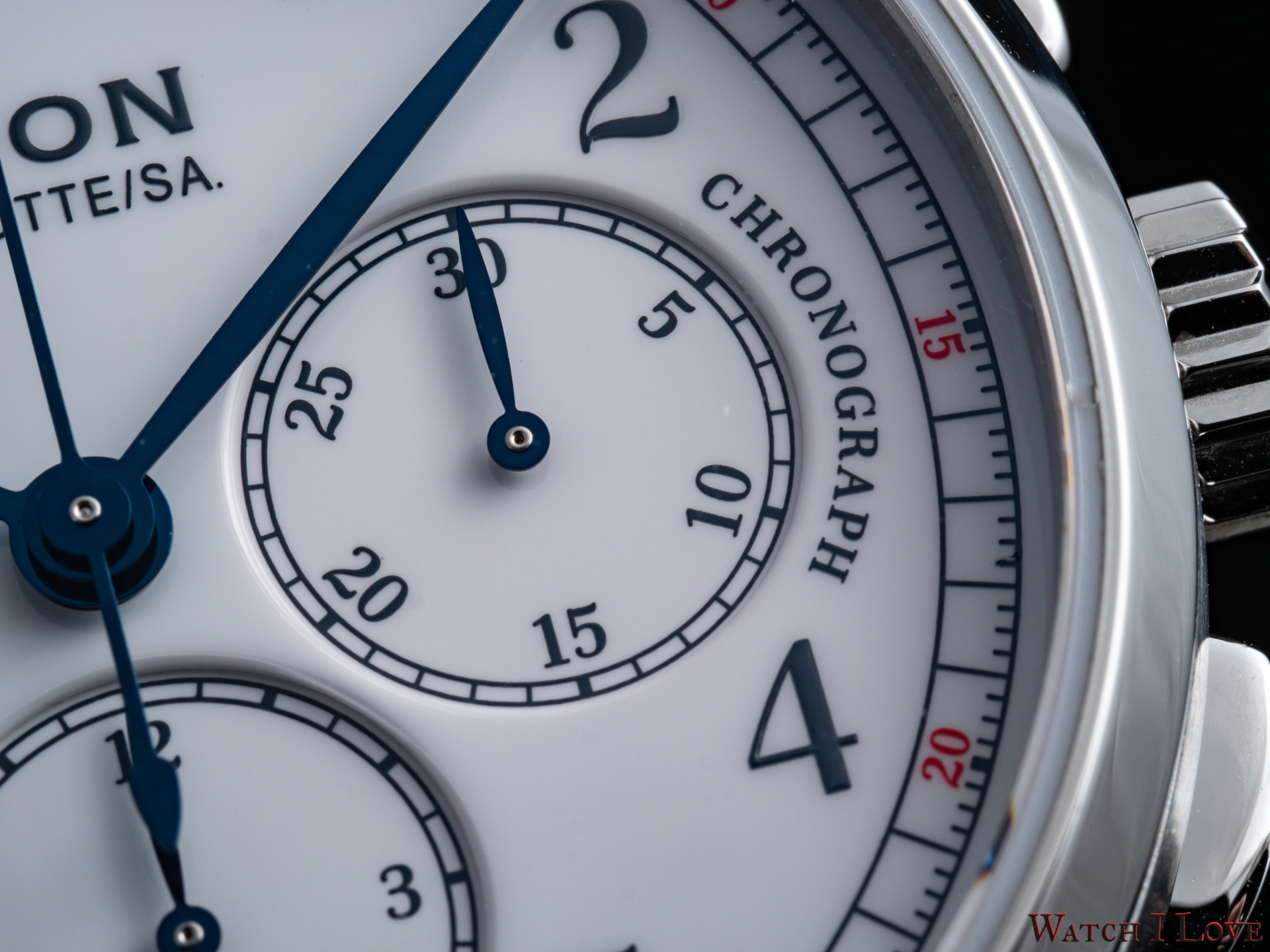 The top of the dial proudly wears the name of the brand. You might easily notice the beautiful font used for lettering. Note the reflection of the hand on the enamel dial.
