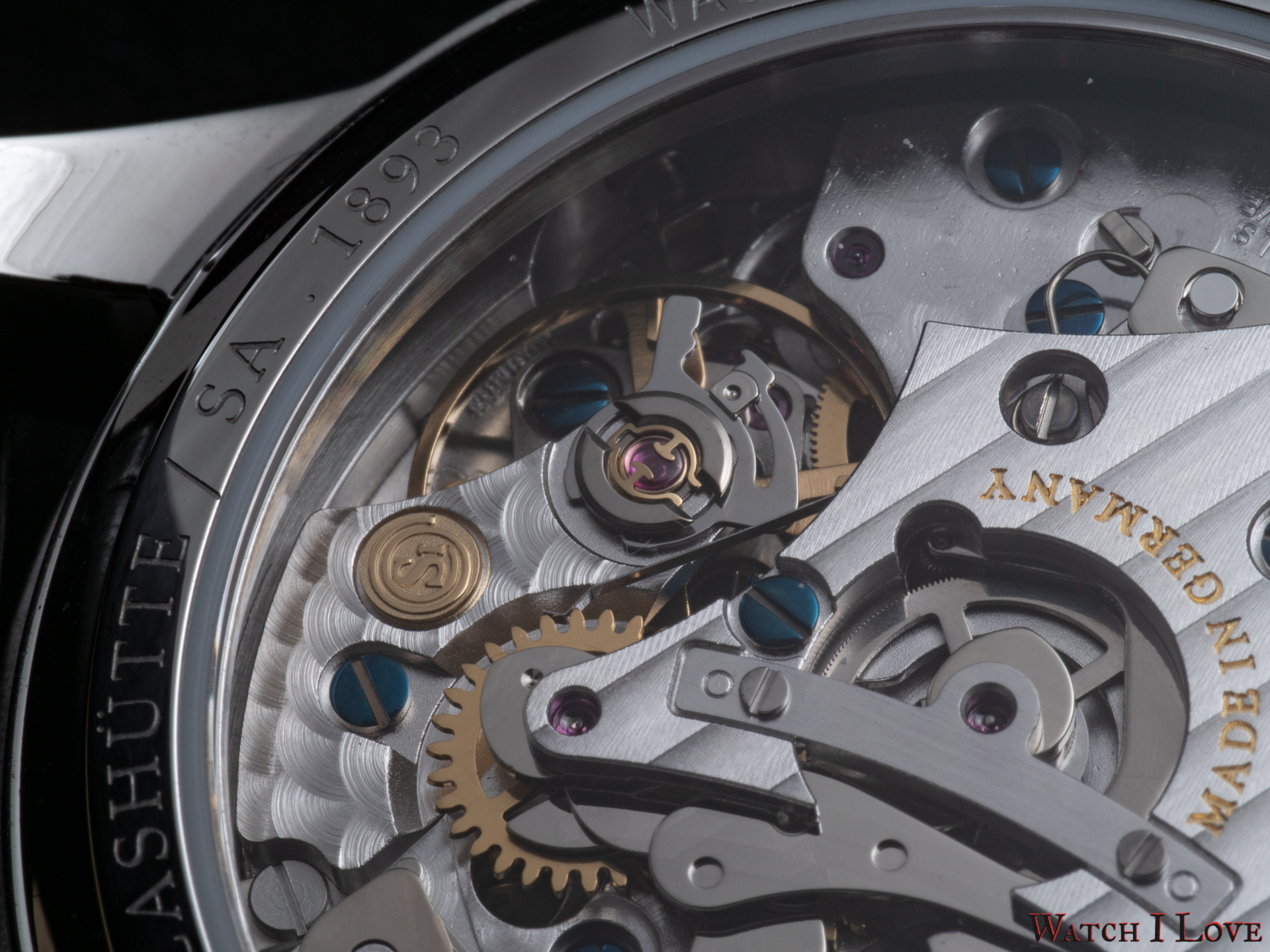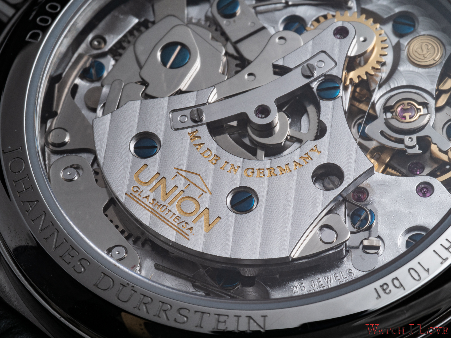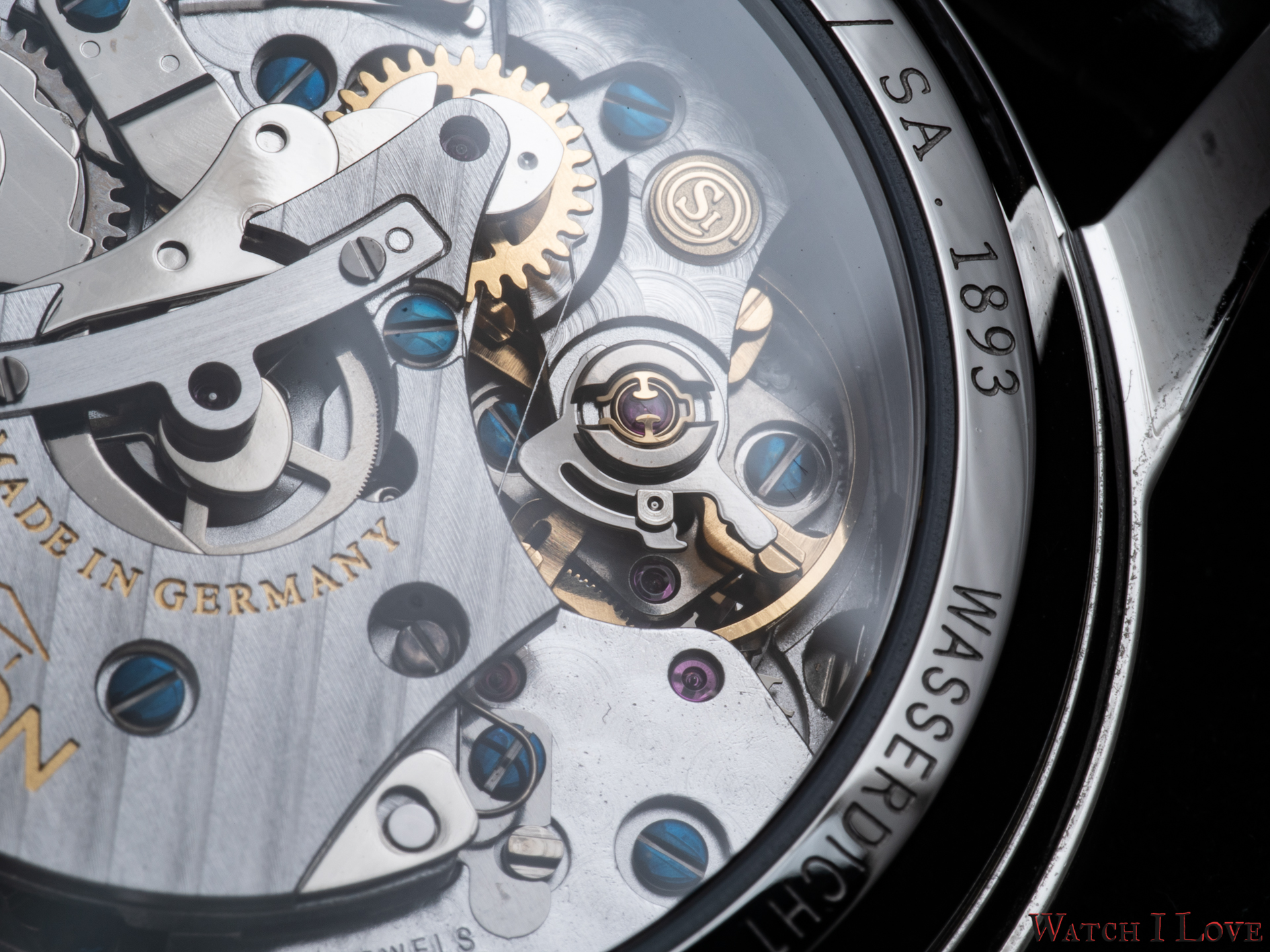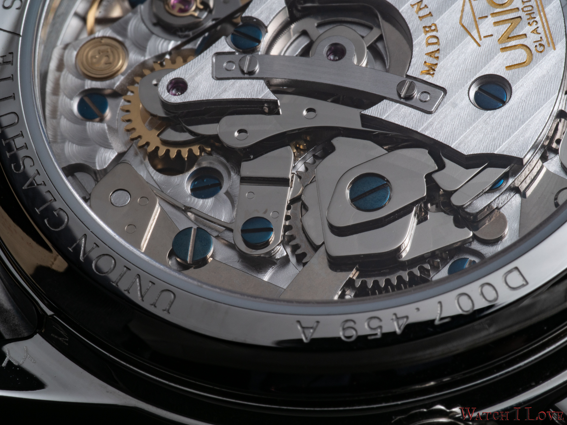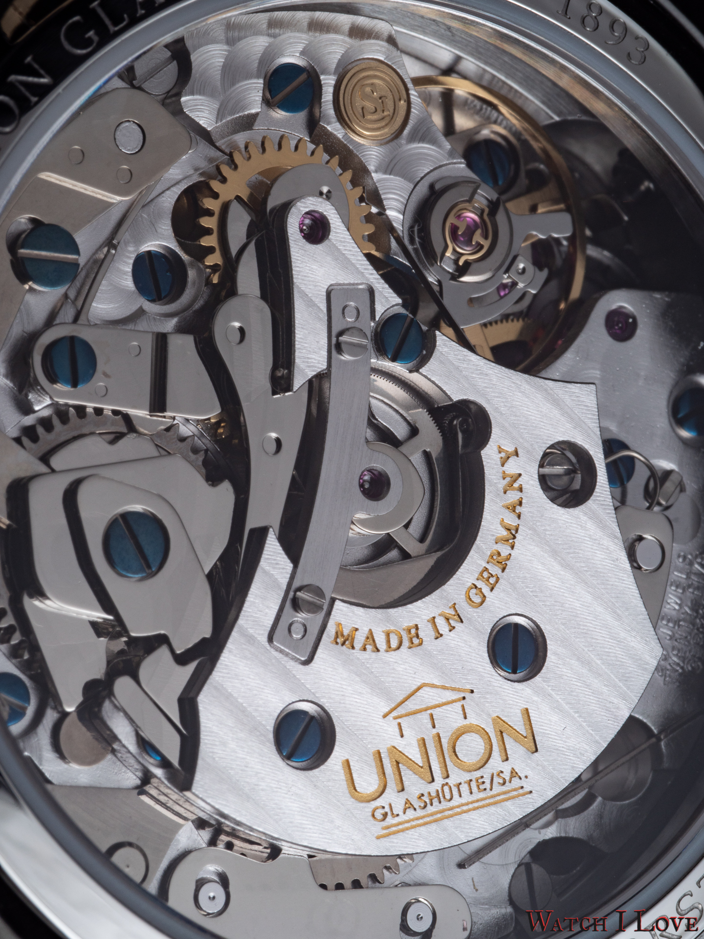 The view of the back reveals the attention that Union Glashütte gives it to the movement’s decoration. The bridges are designed and produced in house. The rest of the components are entirely decorated by the brand. It can be easily noticed the Glashütte stripes and the perlage. The blue screws contrast the gilded gear wheels, the balance wheels and the main bridge engravings. While it is not the most compelling calibre architecture but considering the under 3k € price tag (2.827 € incl. 16 % VAT), the watch offers a nicely adorned movement.