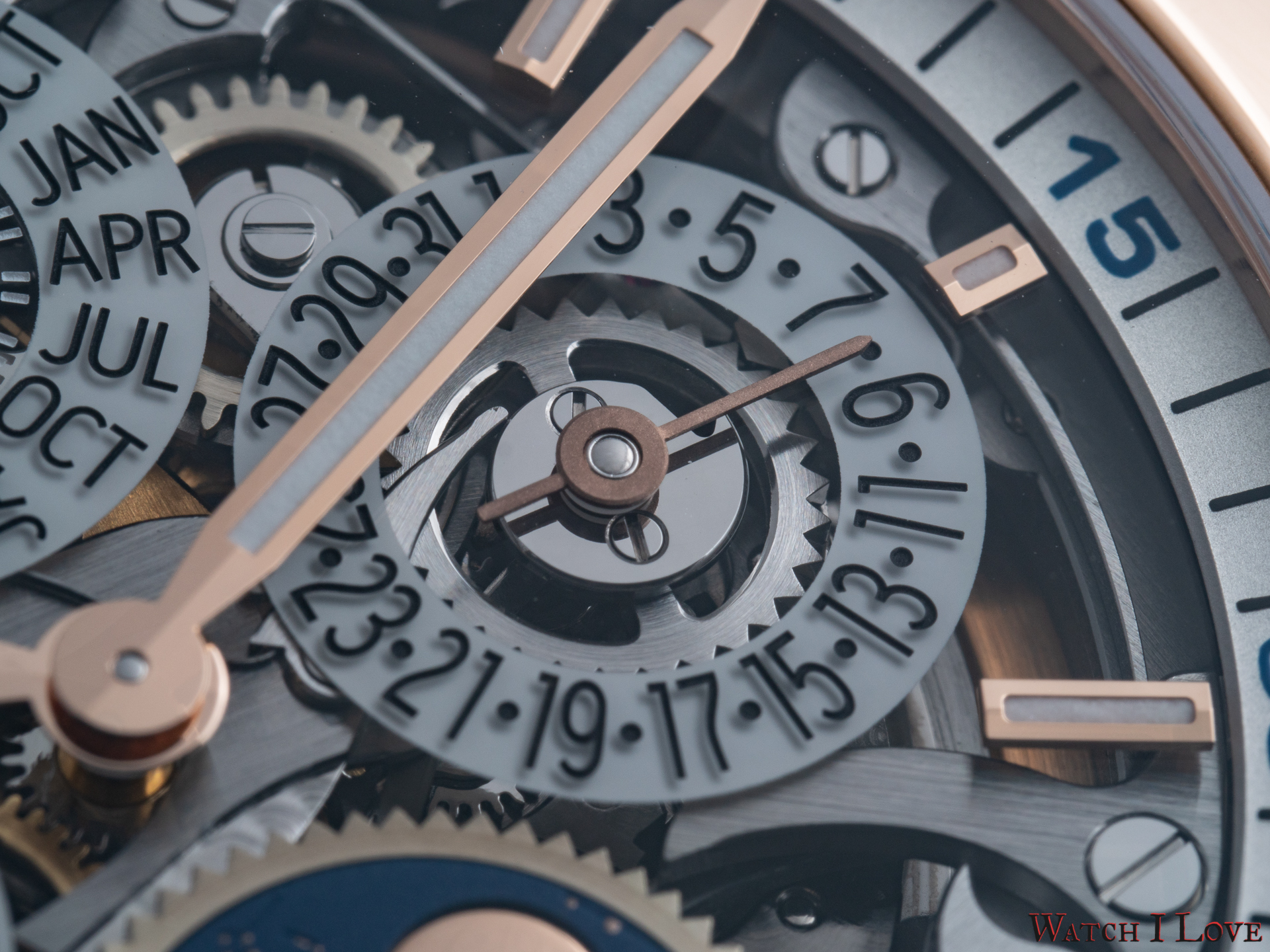 The date can be found on the 3 o’clock position. Those familiar with the functionality of the perpetual calendars will recognise the arm responsible for the date jumps in the month with 30 days or less.