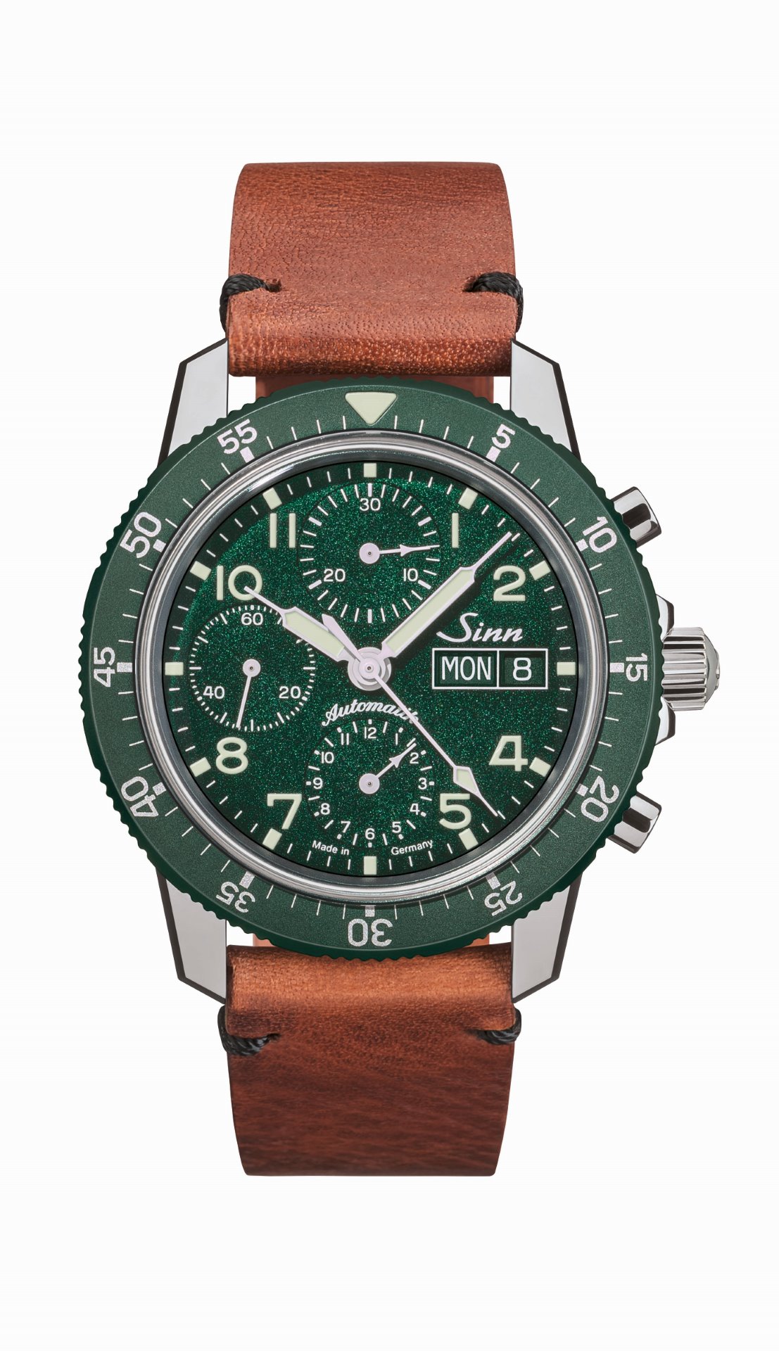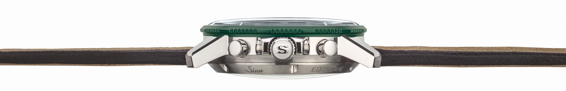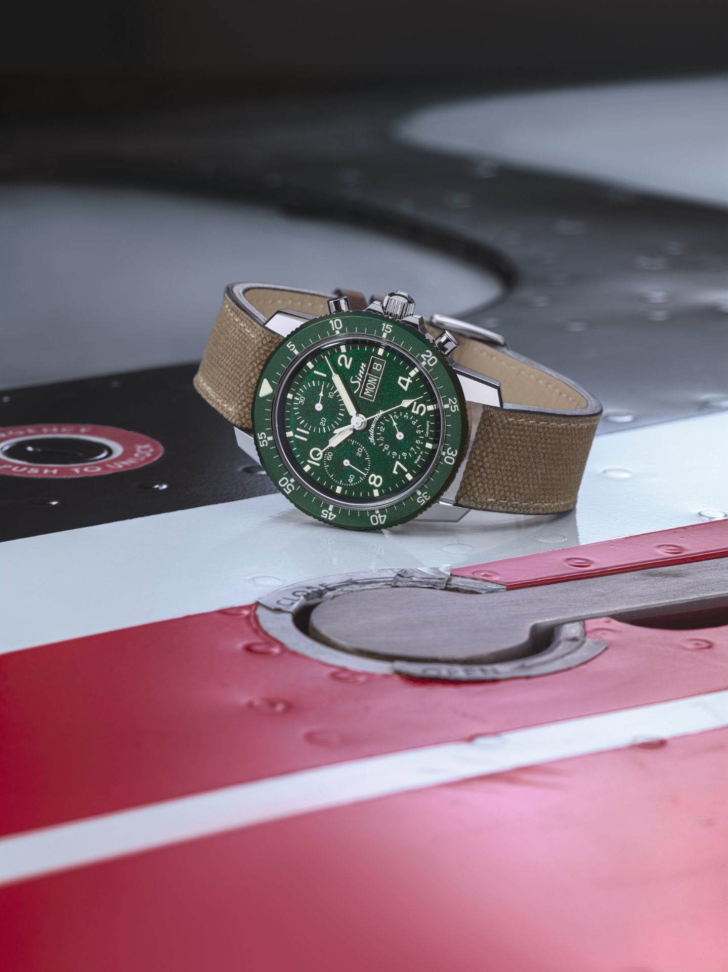 Sinn 103 Sa G is a traditional pilot chronograph with an extraordinary design. Its eye-catching features include the dial in shimmering metallic-green, the green bidirectional rotating pilot’s bezel in anodised aluminium and the day and date display, also in green. This colour scheme is applied consistently throughout, providing the timepiece with an aesthetic balance.