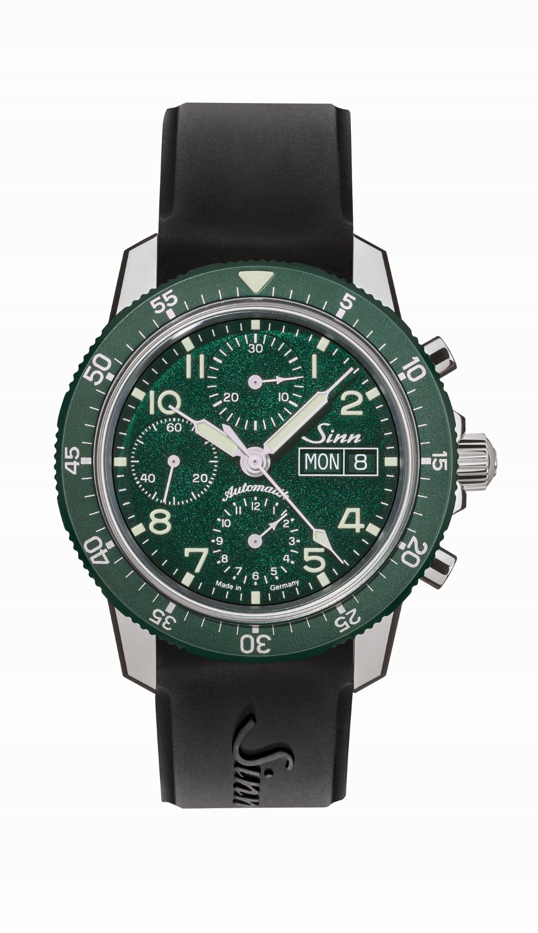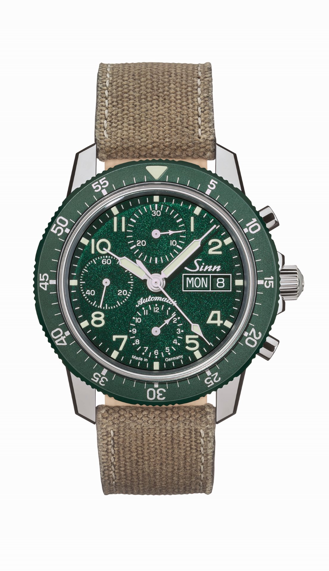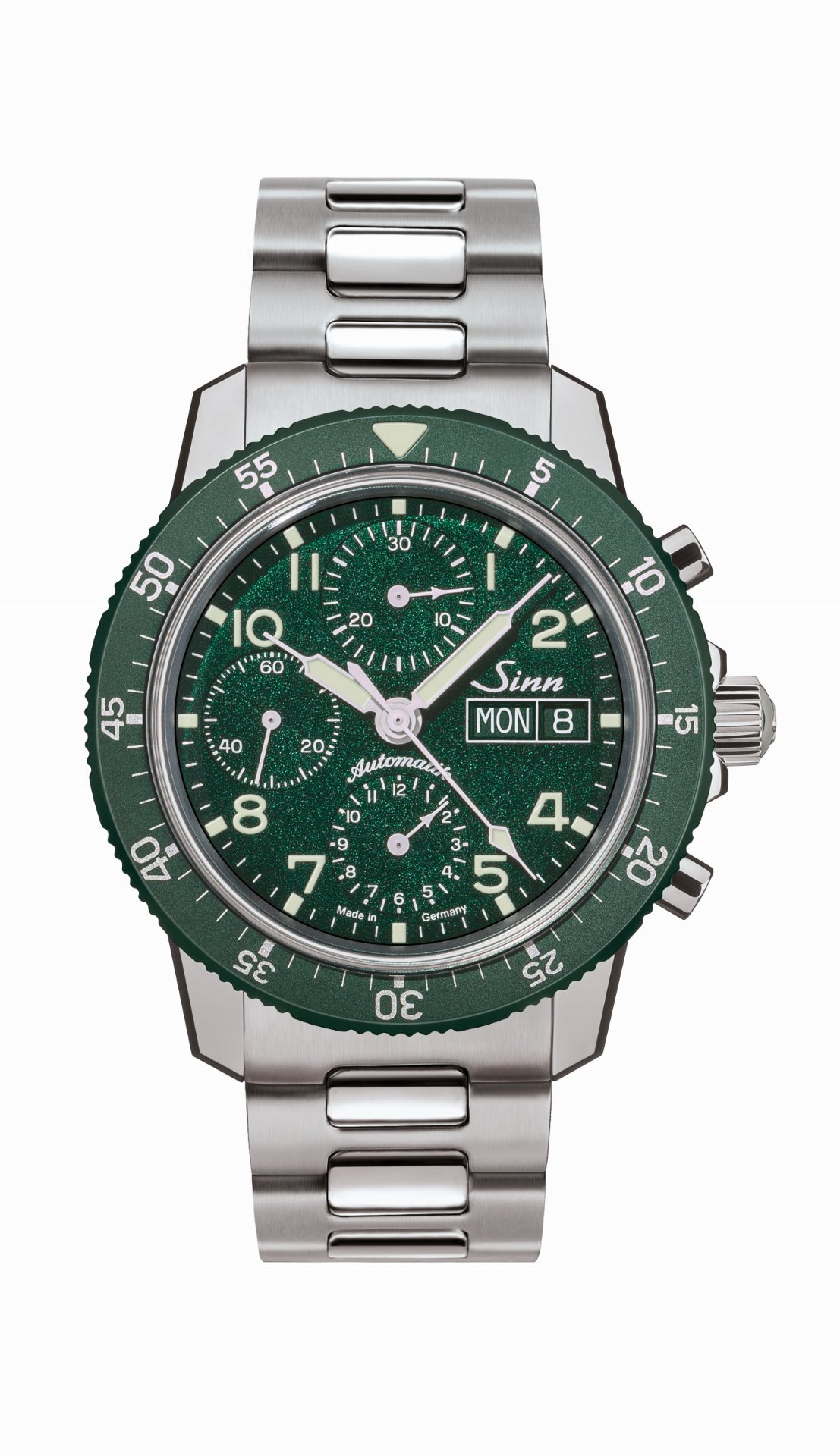 Sinn 103 Sa G is a traditional pilot chronograph with an extraordinary design. Its eye-catching features include the dial in shimmering metallic-green, the green bidirectional rotating pilot’s bezel in anodised aluminium and the day and date display, also in green. This colour scheme is applied consistently throughout, providing the timepiece with an aesthetic balance.
