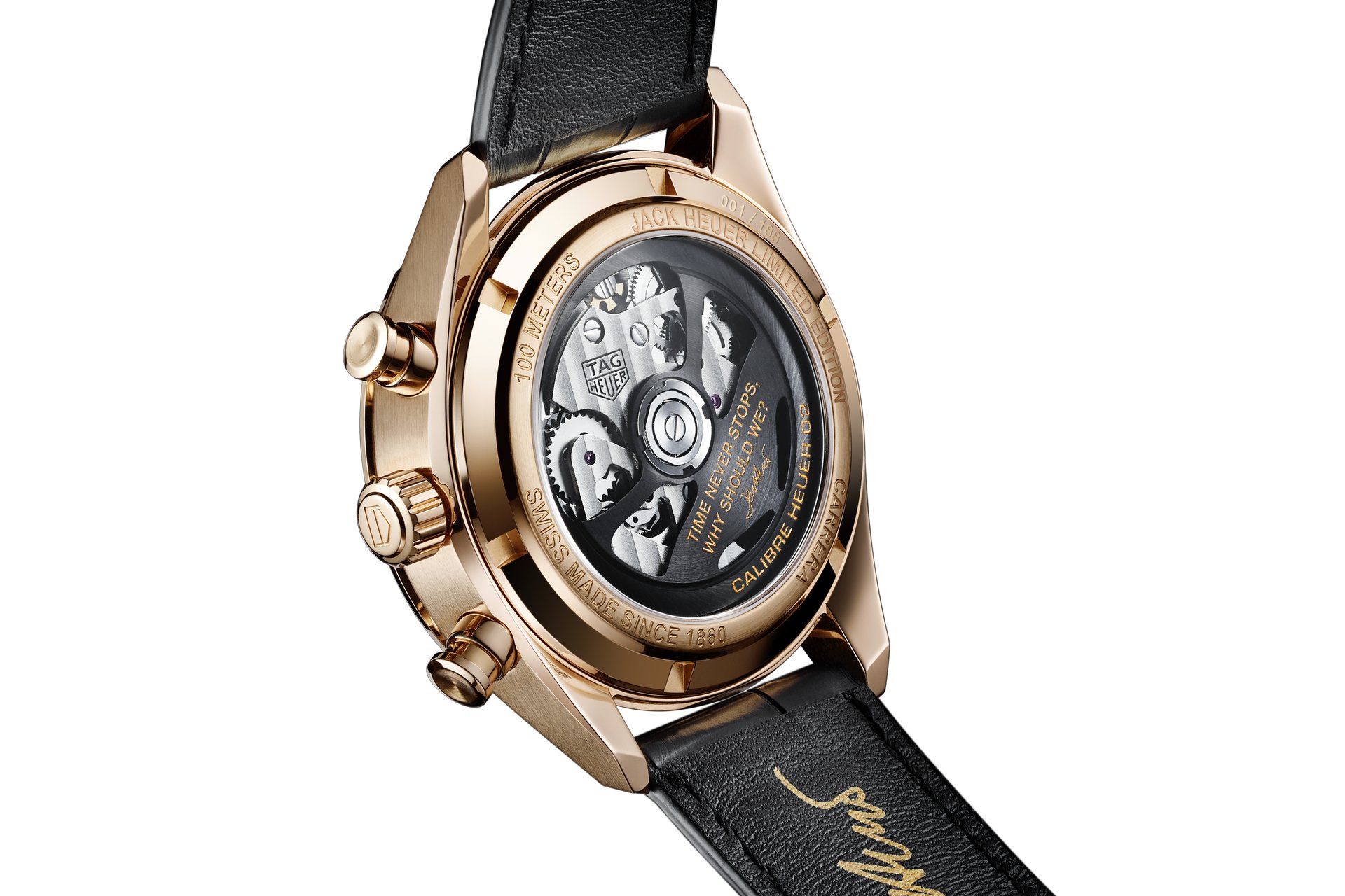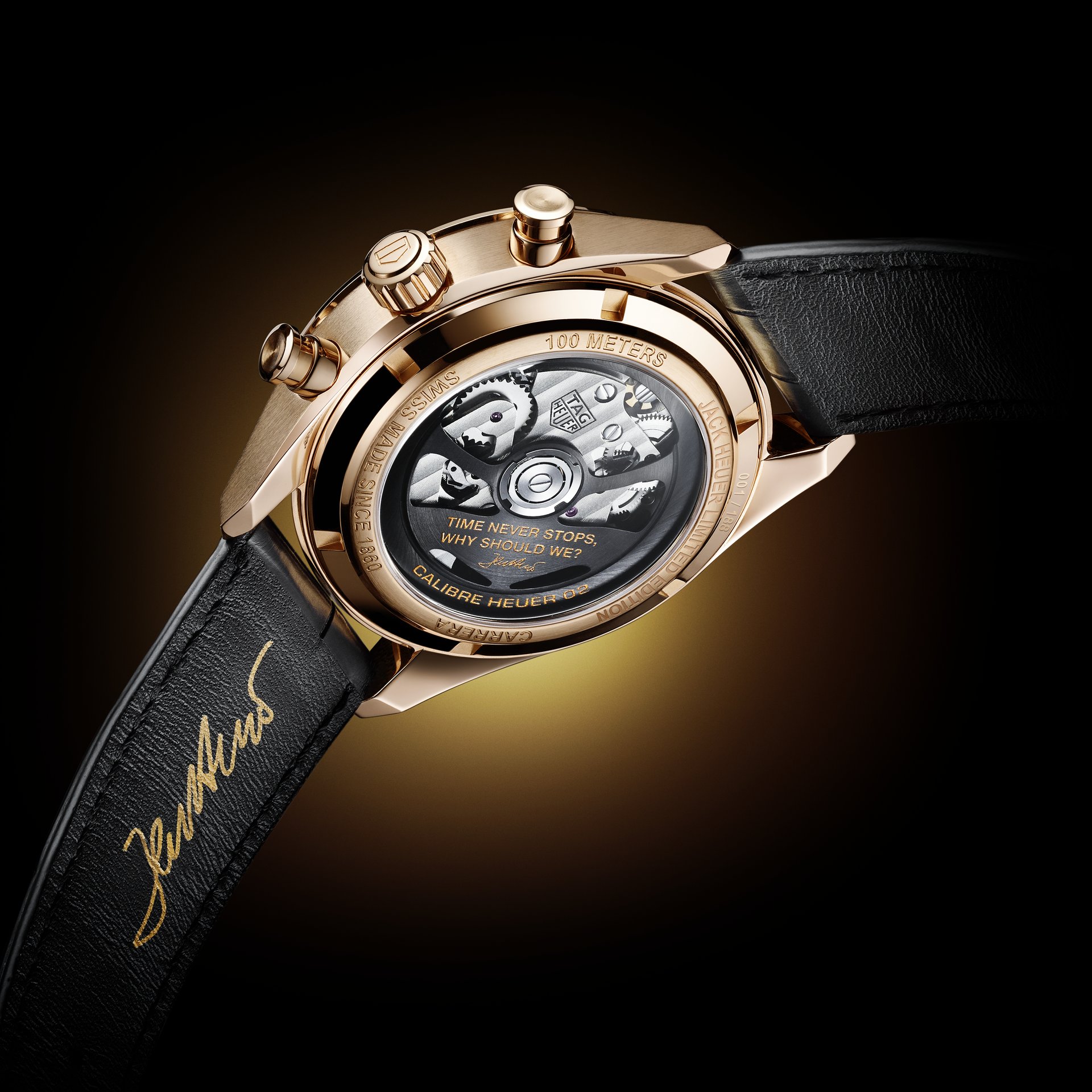 Inspired by Jack’s favourite Heuer watch (the iconic vintage Heuer Carrera 1158CHN), the details of the TAG Heuer Carrera Chronograph Jack Heuer Birthday Gold Limited Edition, which is limited to 188 watches, recall the story of Jack and TAG Heuer. With its sleek design and highly legible dial, the elegant chronograph pays tribute to the Heuer style, as well as Jack Heuer’s love of detail and precision. It is made from 18K rose gold, his favourite material, and one that he specially chose for the watches he gifted to racing drivers to confer the highest value upon their precious good luck tokens. This new watch features Jack’s motto “Time never stops, why should we?” on the oscillating mass of its in-house manufacture Heuer 02 movement, and bears the double symbol of infinity on the dial and his signature on the strap.