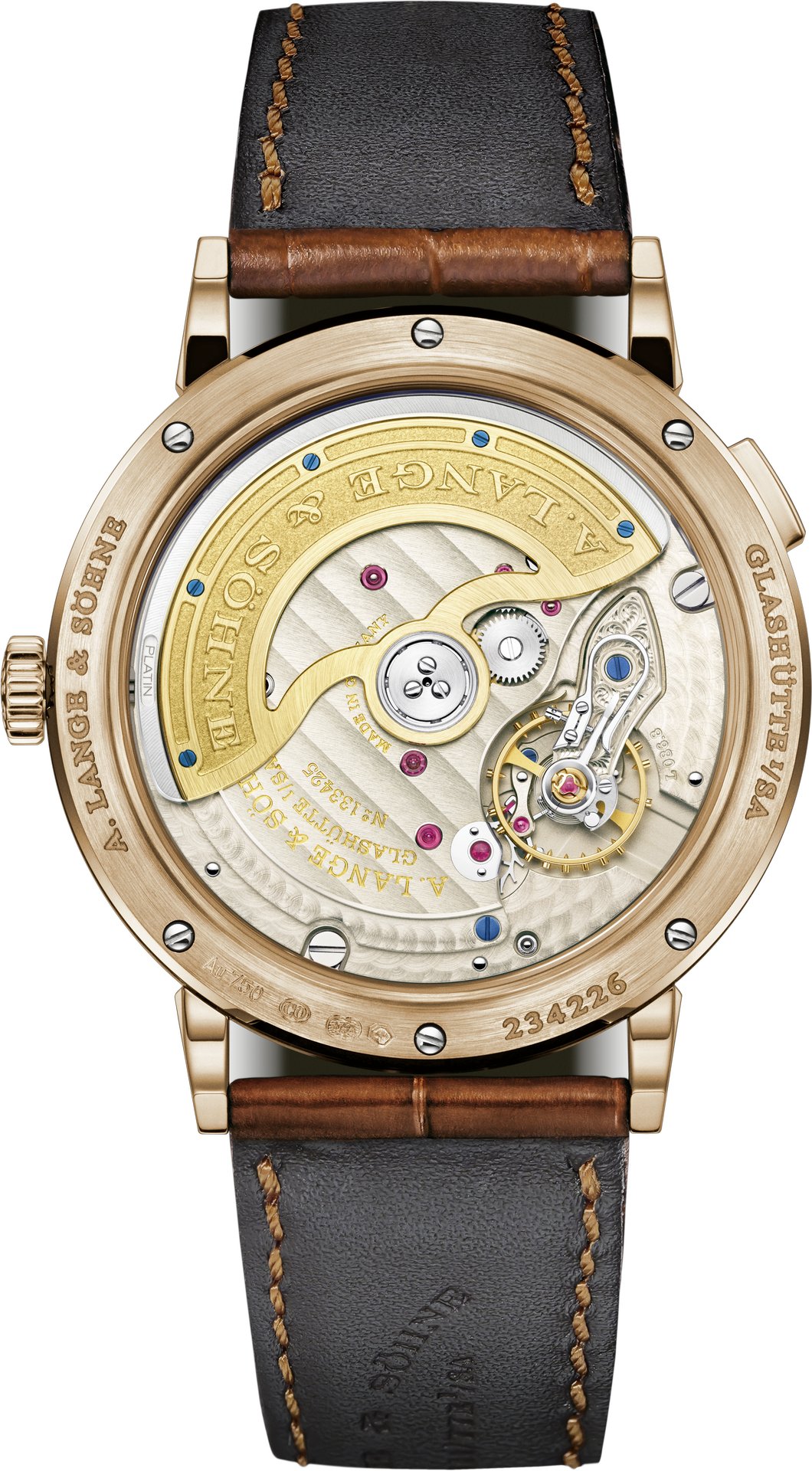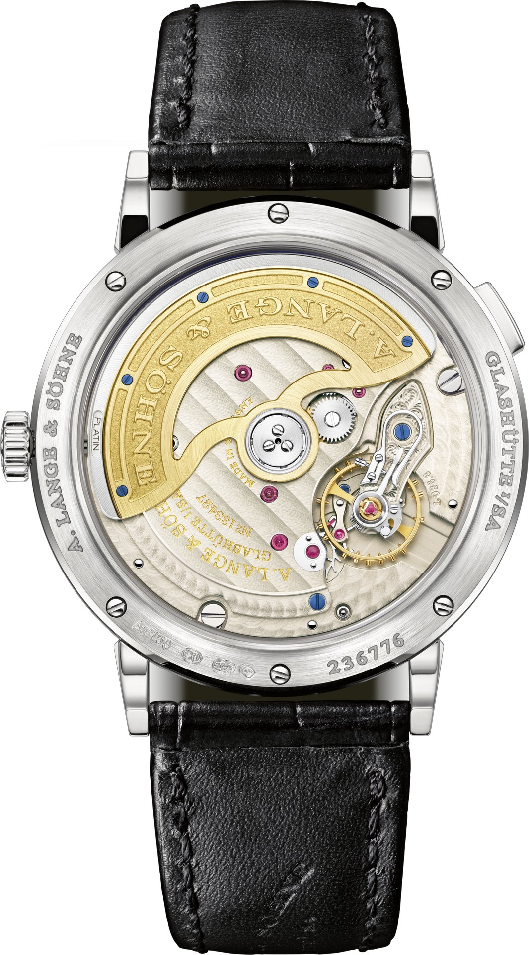 Movement: Lange manufacture calibre L086.8, self-winding, crafted to the most exacting Lange quality standards, decorated and assembled by hand; precision-adjusted in five positions; plates made of untreated German silver; balance cock engraved by hand