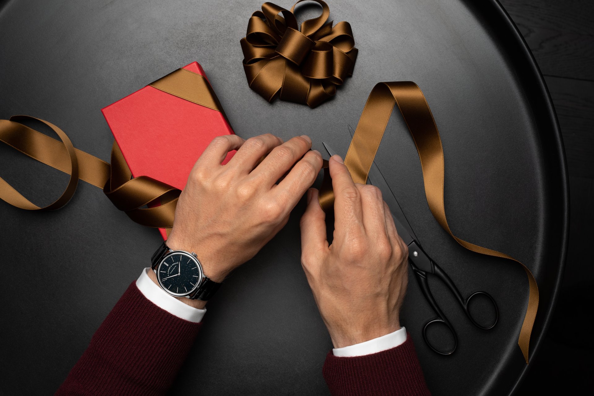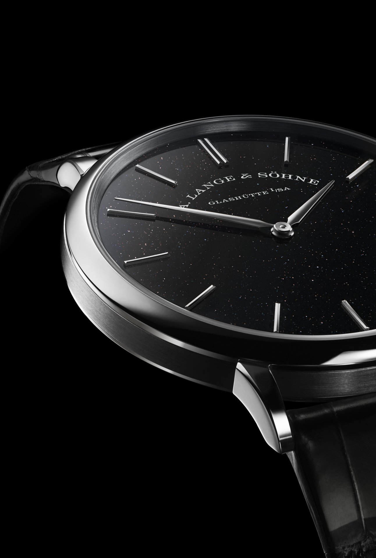 The solid-silver dial, coated with subtly shimmering black gold flux, makes the new A. Lange & Söhne SAXONIA THIN sparkle on the wrist. But it takes a closer look to recognise the reason. Tiny spangles distributed across the deep-black surface reflect the light to produce a copper-coloured sheen. A shiny black leather strap with a prong buckle in 18-carat white gold accentuates the distinctiveness of the timepiece.