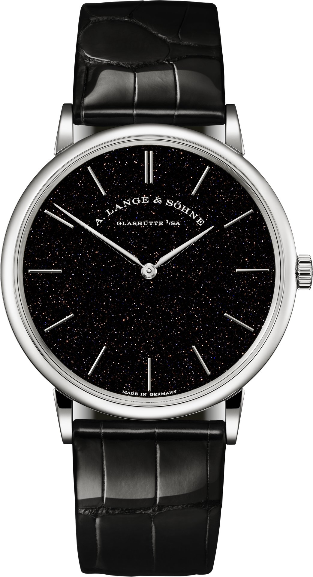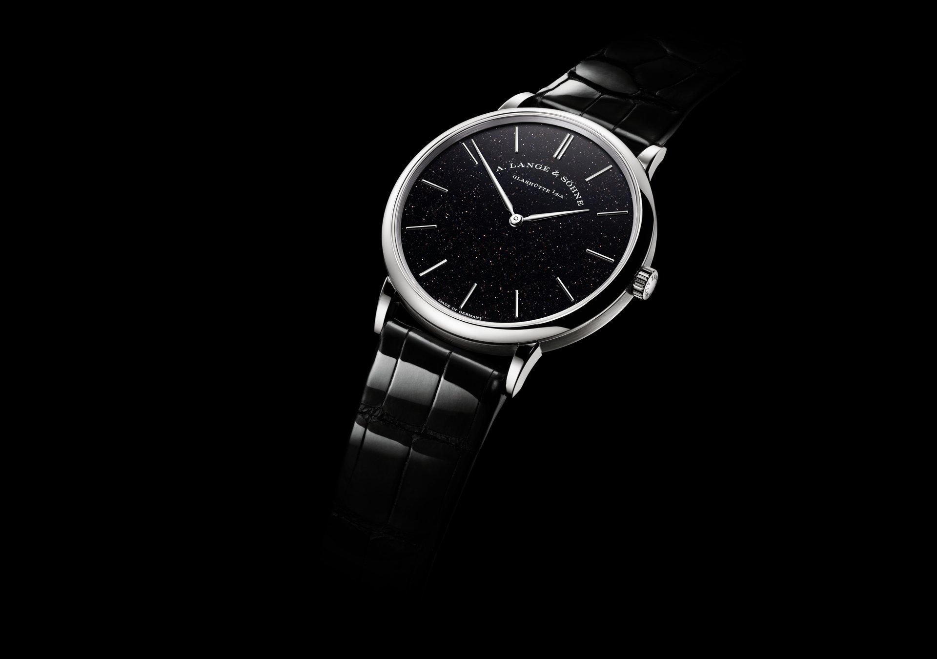 The new SAXONIA THIN presented by A. Lange & Söhne is a special white-gold version in a limited 50-watch edition. Its gently shimmering dial in solid silver is coated with black gold flux that contains tiny copper-coloured particles, which make the deep-black surface sparkle. A shiny black leather strap with a prong buckle in 18-carat white gold accentuates the radiant prominence of the timepiece.