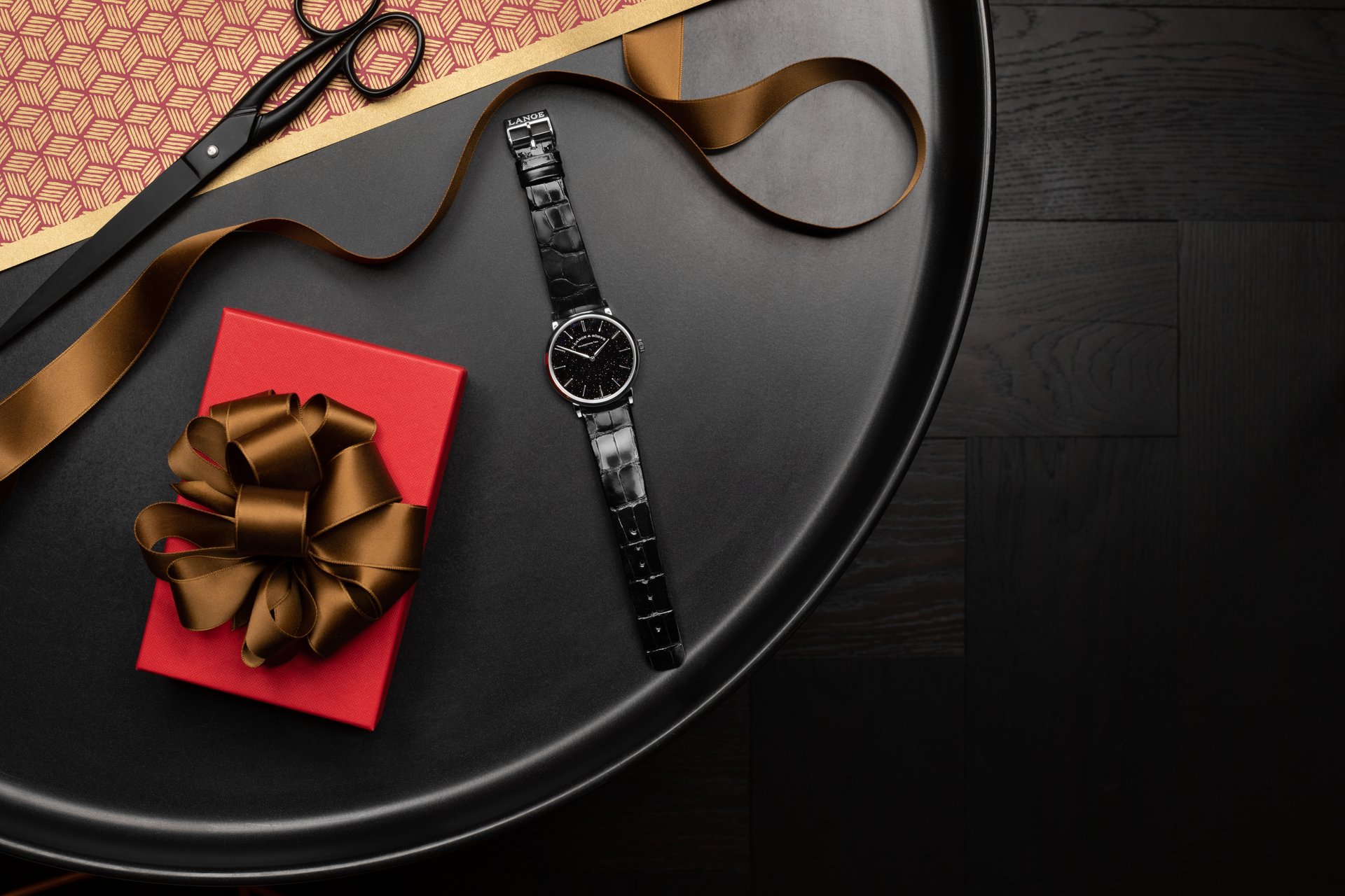 This rare black gold-flux version is a premiere in an A. Lange & Söhne watch. It follows a SAXONIA THIN model presented in 2018 that was graced with a blue-red sparkling dial achieved with blue gold flux. The production process for gold flux was discovered in Venice in the 17th century. It is a type of glass with copper constituents. While it is being heated, the copper forms microscopically small crystals. To attain a homogeneous surface, it must be cast onto the silver dial with extreme caution.