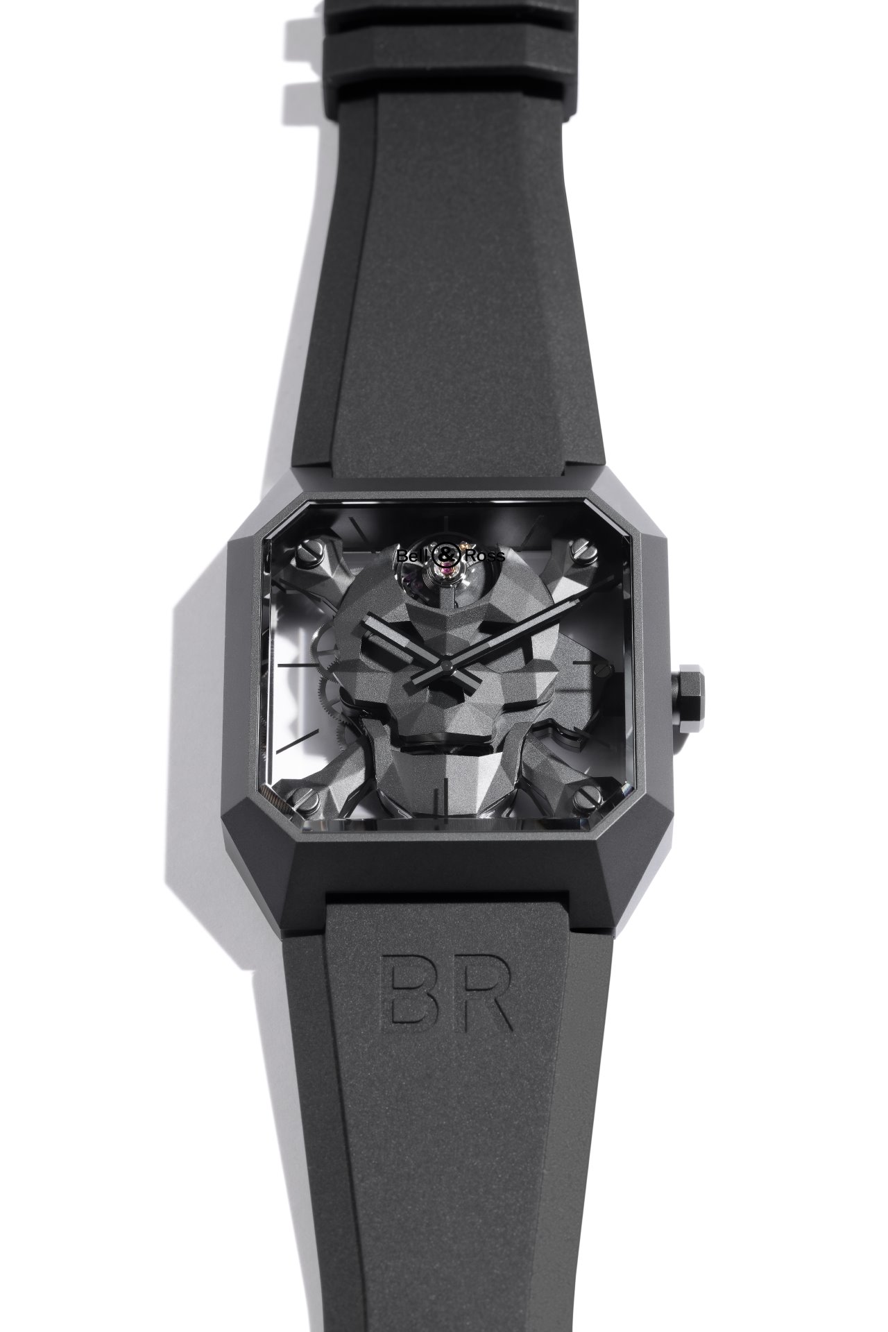 Mexican tradition celebrates the Day of the Dead in the month of November, and it is a time for mocking death by wearing the famous calaveras, brightly coloured decorated skulls. This irony is expressed by the BR 01 CYBER SKULL in revealing a mischievous smile when its mouth is opened. It has a timelessness displayed in its faceted relief, conveying an ancient symbol in an ultra-contemporary style.