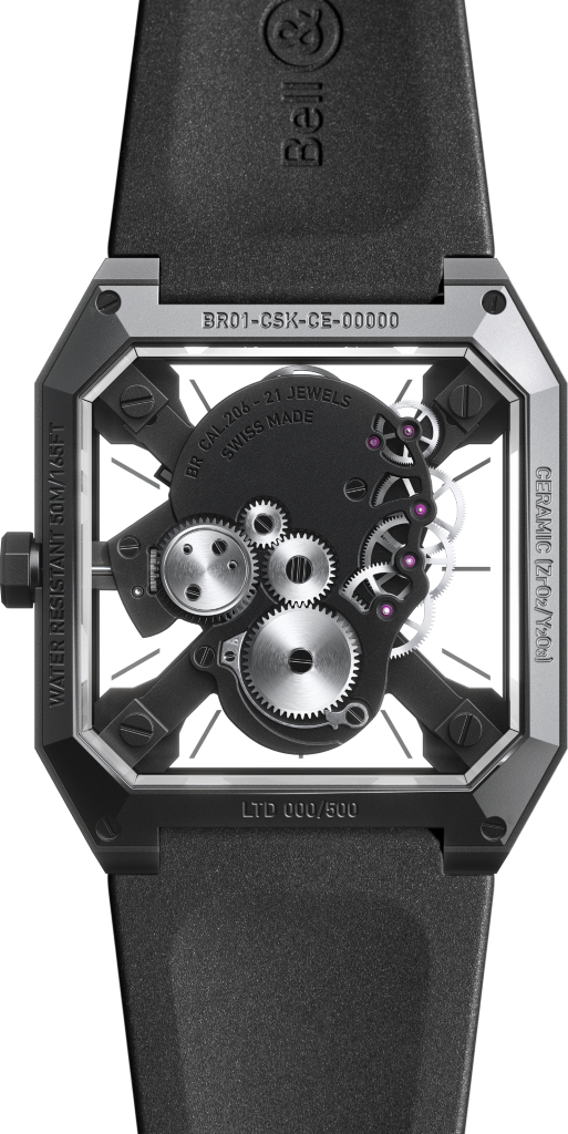 Bell & Ross chose ceramic to create this BR 01 CYBER SKULL, a high-tech material that is solid yet lightweight, both for the case and the decoration. Compounded by the brute force of the material, the aesthetic force of the timepiece merges technologies together. Fired at an extremely high temperature, the ceramic acquires a density and resistance not dissimilar to black matte, a colour that cannot be achieved with traditional watchmaking materials. Grinding using diamond powder meant the facets could be resurfaced, in the same way jewellers cut a precious stone.