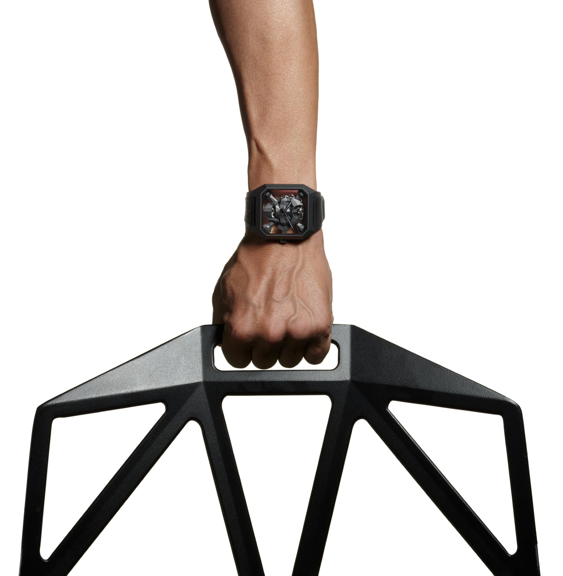 Its case is inspired by the original BR 01 but its contours have been revised with sharp edges that give it an ultra-contemporary look. The CYBER SKULL also plays with light and transparency. In some ways, it is similar to the architecture of today. Avant-garde buildings play with the sky, they reflect it to make sure they blend in.