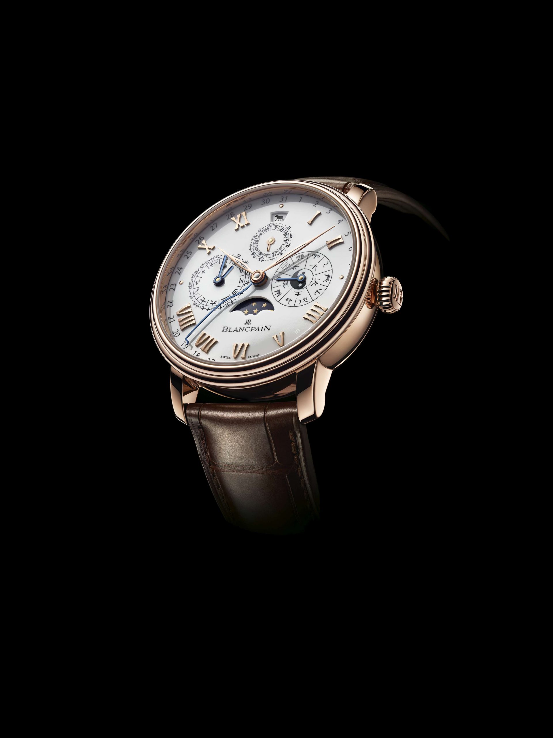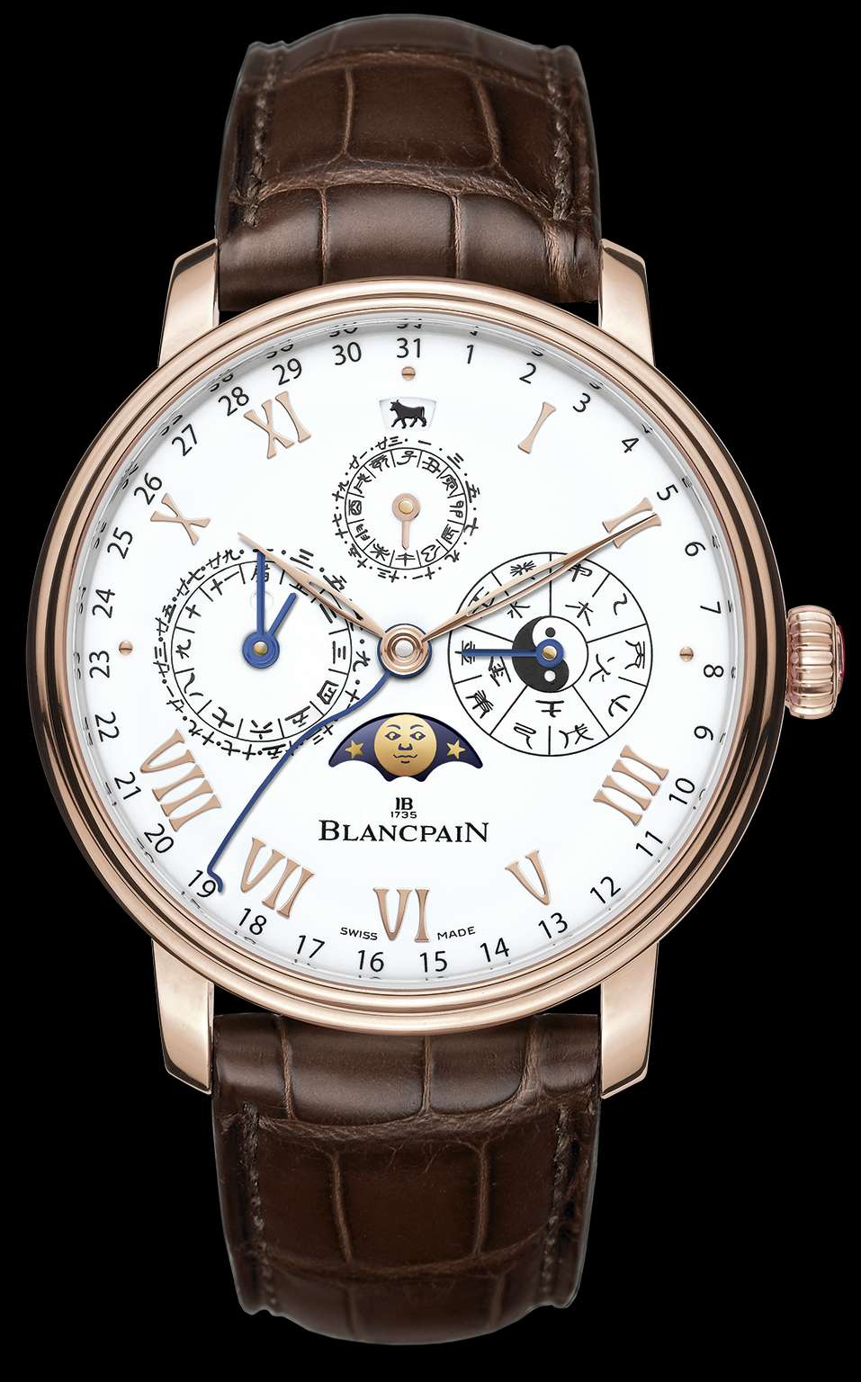 Despite their complex combination, these functions are clearly displayed on a dial with Roman gold numerals and hollowed-out sage leaf-shaped hands. The ox, the animal of the year 2021, appears in an aperture at 12 o’clock above the double-hour counter. Symmetrically positioned at 3 o’clock and 9 o’clock, two subdials respectively indicate the celestial stems and the five elements, as well as pointer-type month and date indications and leap months through a round aperture. In a manner typical of Blancpain’s Complete Calendar watches, the moon phases that determine the months of the Chinese calendar can be read off at 6 o’clock, while a blued serpentine hand sweeps over the date numerals around the dial circumference.