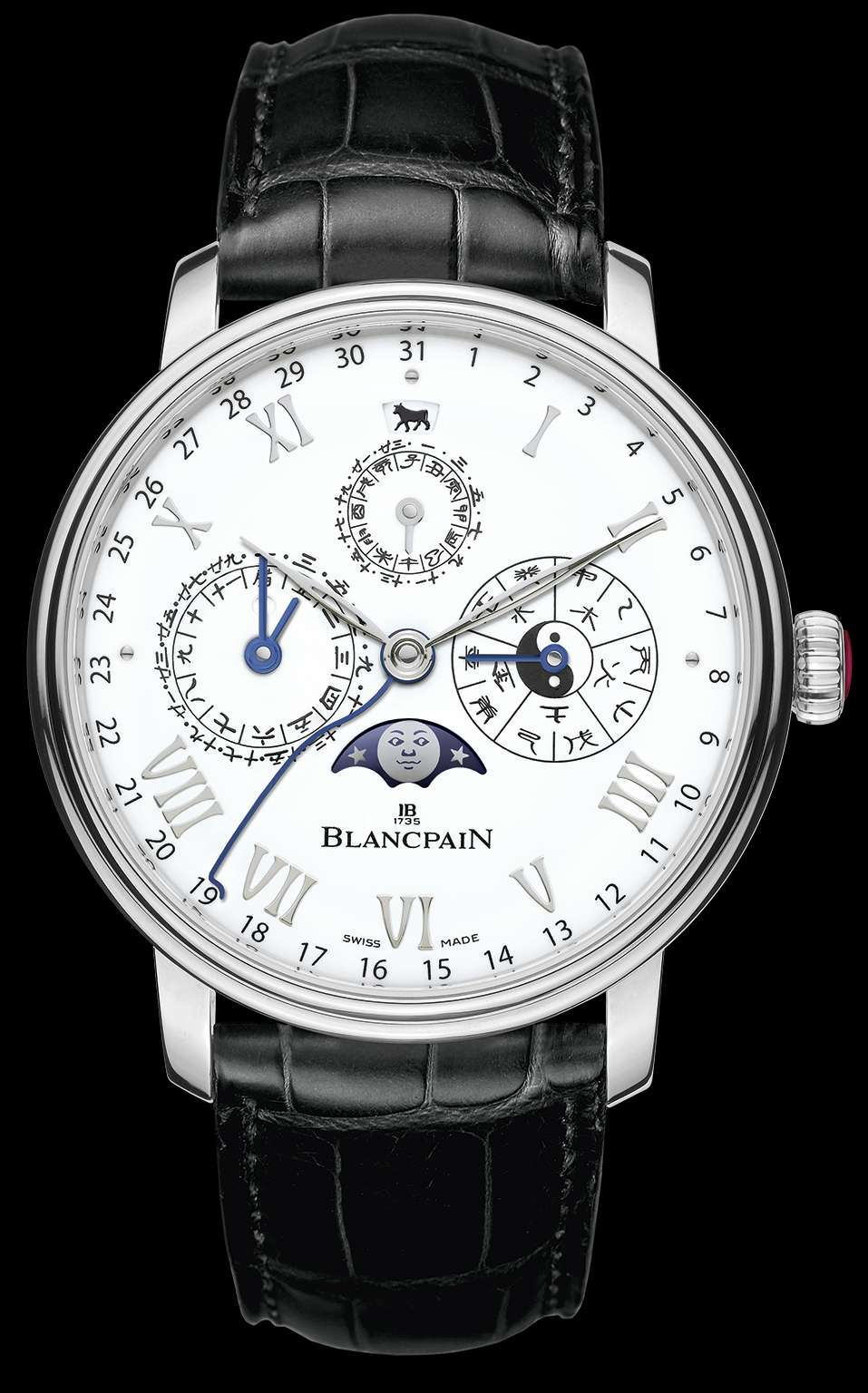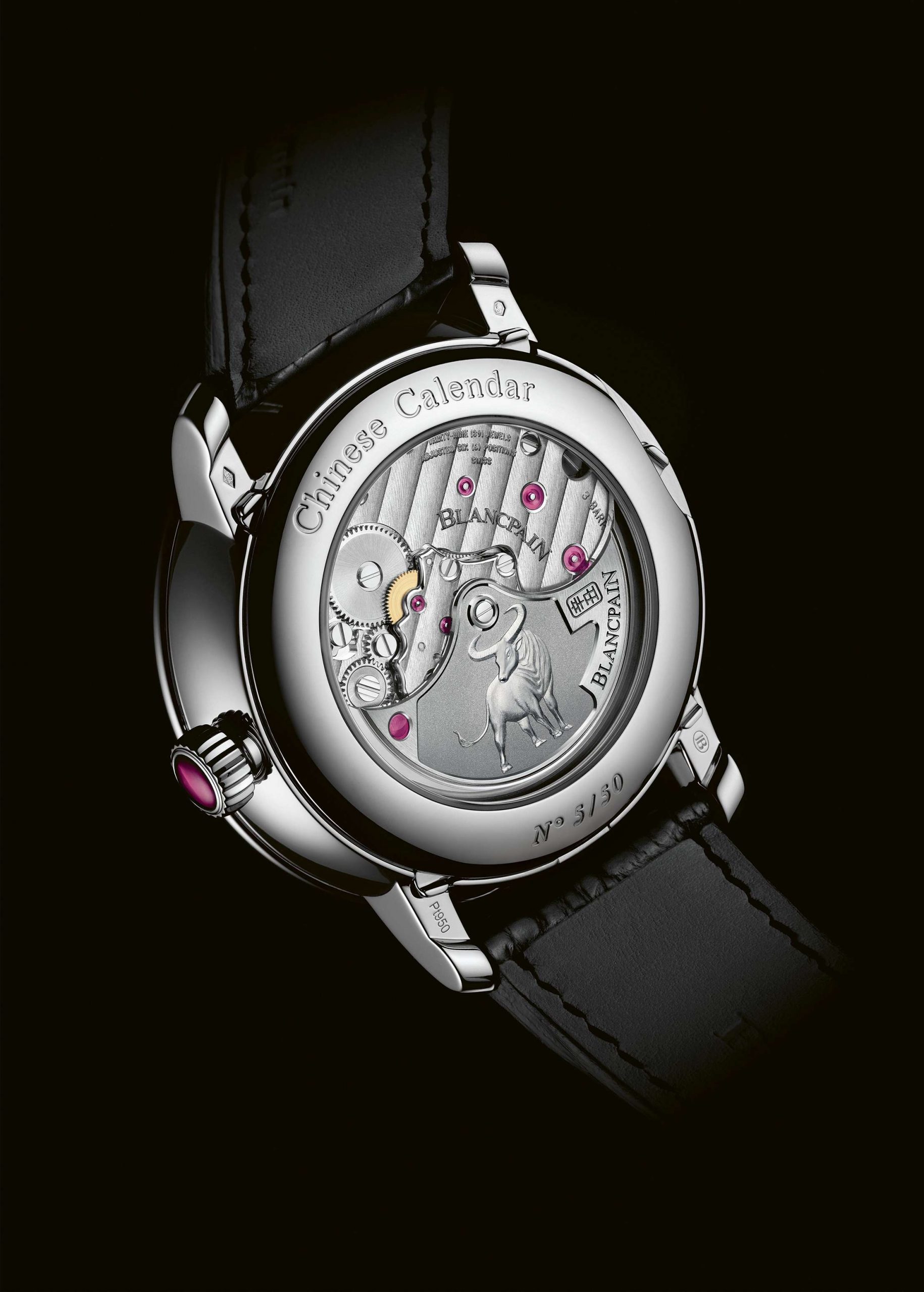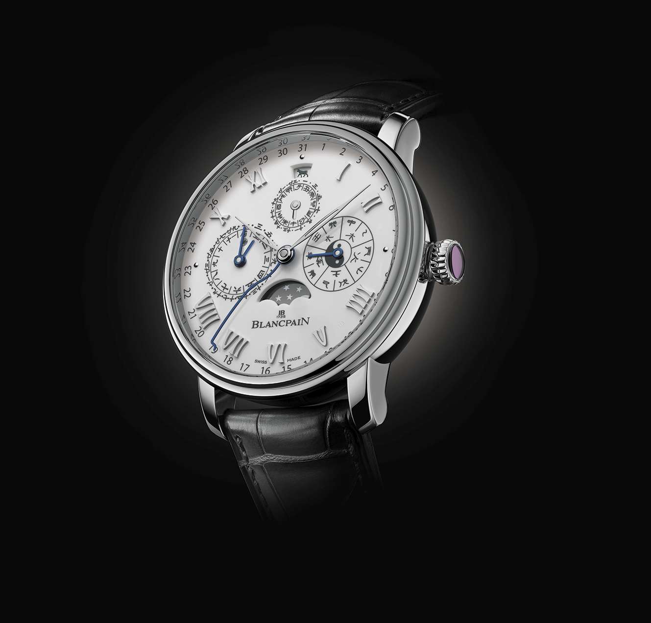 Unlike the Gregorian calendar, whose unit of measurement is based on the solar day, the traditional lunisolar Chinese calendar is based on the lunar cycle as well as exact astronomical observations of the sun’s longitude. Thus, in addition to the hours and minutes, date and moon phases, Blancpain’s Traditional Chinese Calendar watch offers the main indications of the traditional Chinese calendar: double hours, days, months and leap months, zodiac signs, five elements and ten heavenly stems. The latter, combined with the 12 earthly branches – symbolised by the animals of the zodiac – produce 60 different pairs forming the sexagesimal cycle of the Chinese time measurement system.