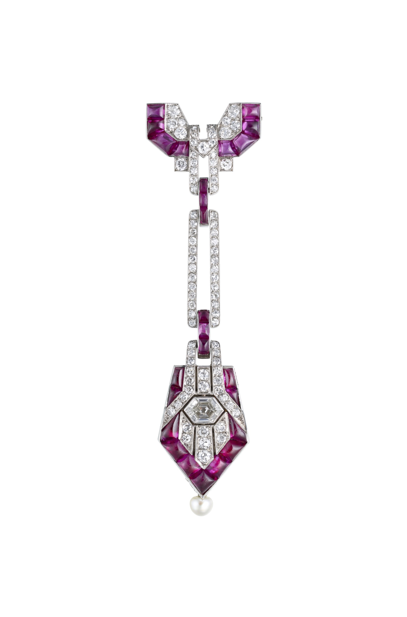 Luncheon – Platinum ladies’ brooch watch, set with diamonds and rubies, suspended from a diamond-set chain– 1925