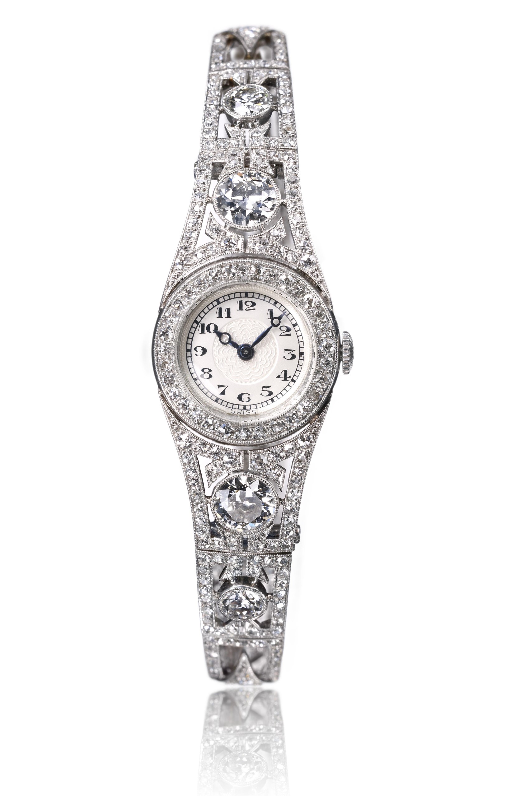 At the beginning of the 20th century, when opulent Art Nouveau shapes remained as appealing as ever, the wristwatches that were beginning to assert themselves on women’s wrists provided a special means of expression as jewellery telling the time. Especially so when it came to evening watches such as this Vacheron Constantin gold and platinum model that is entirely arrayed in precious stones – from the bezel adorned with brilliant-cut bead-set diamonds to the bracelet richly decorated with antique-cut bezel-set diamonds. This gala watch with its understated design delicately asserts its softly scrolling patterns thanks to the expert hands of the gemsetter.