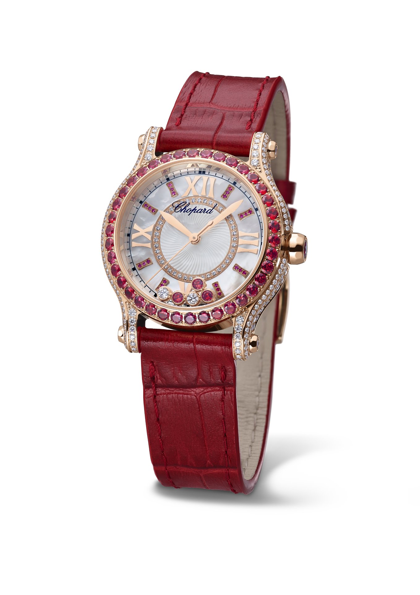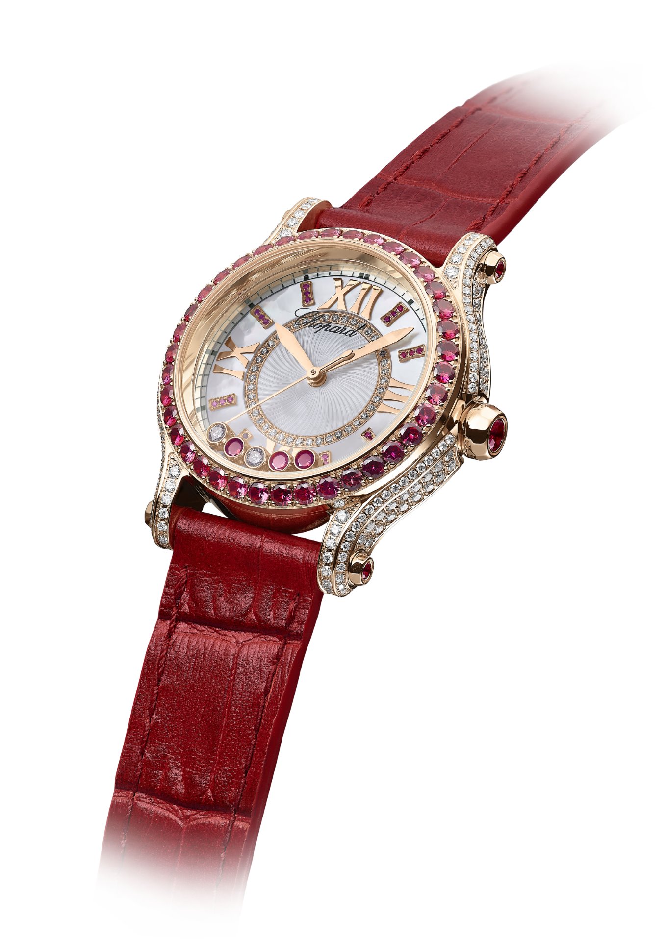 Happiness suits it. With its precious dancing gems, Happy Sport appears to transform the passing of time into an eternal race towards exhilaration and panache. It was thus entirely natural for Chopard to invite rubies to waltz with its traditional dancing diamonds on the dial of this watchmaking icon. These precious, timeless stones were chosen for their flamboyant red hue symbolising prosperity, joy and fulfilment. With a 30mm-diameter case size ensuring a perfect fit on a slender wrist, two new timepieces equipped with two dancing diamonds and three dancing rubies are thus joining the collection.
