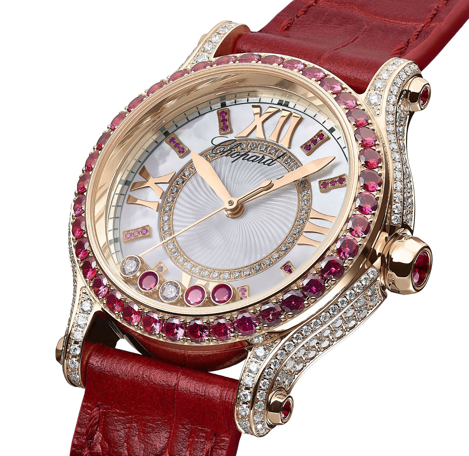 The first variation is made of ethically sourced 18-carat rose gold in line with Chopard’s commitment to promoting sustainable luxury. The sides of the case are entirely set with diamonds, while the crown, bezel and cabochons feature intense red rubies. The iridescent dial is in white textured mother-of-pearl – a noble material whose natural waves are reminiscent of its extraction from the heart of shells – featuring a centre adorned with a refined guilloché pattern and micro-setting.