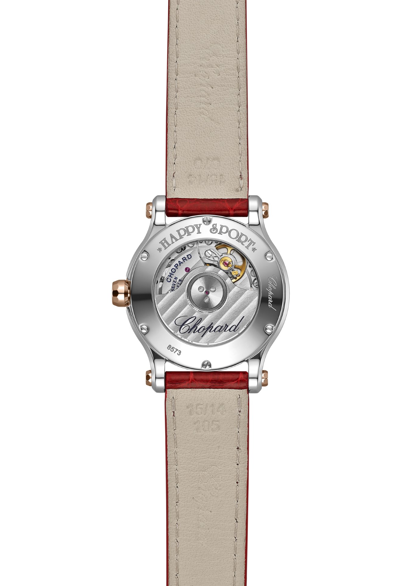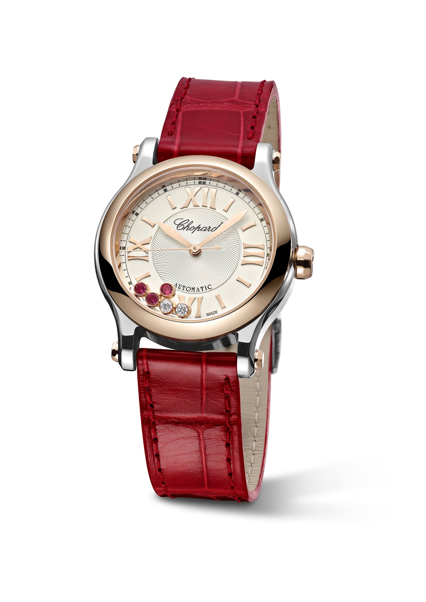 The second watch of this happy duo opts for a casual chic look with a steel case combined with a bezel, crown and cabochons in polished ethical 18-carat rose gold. The crown is set with another ruby, echoing the dancing gems on the dial and the glossy red alligator leather strap fitted on these two new Happy Sport watches.