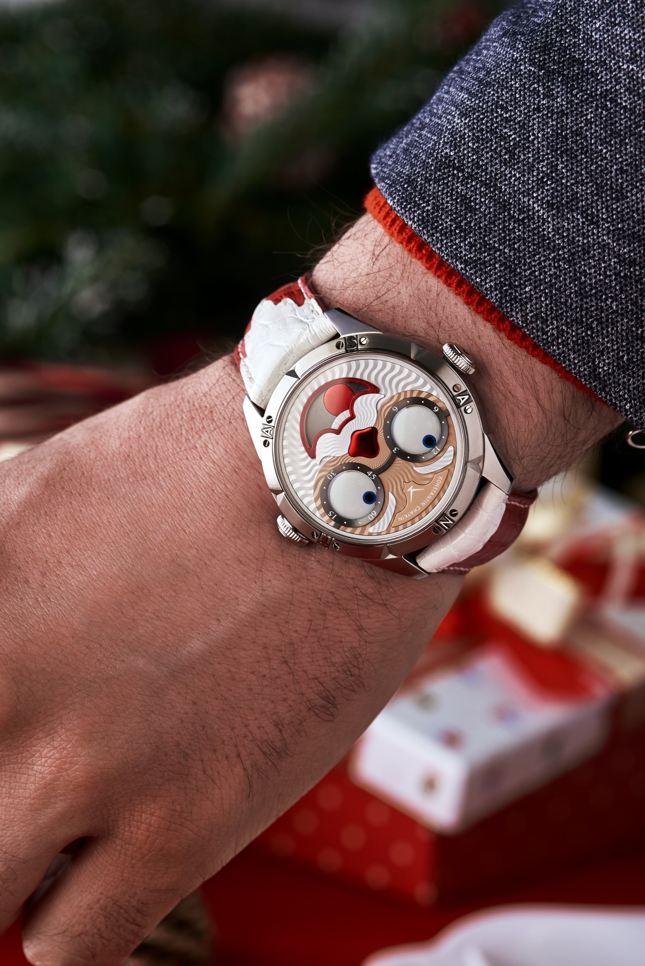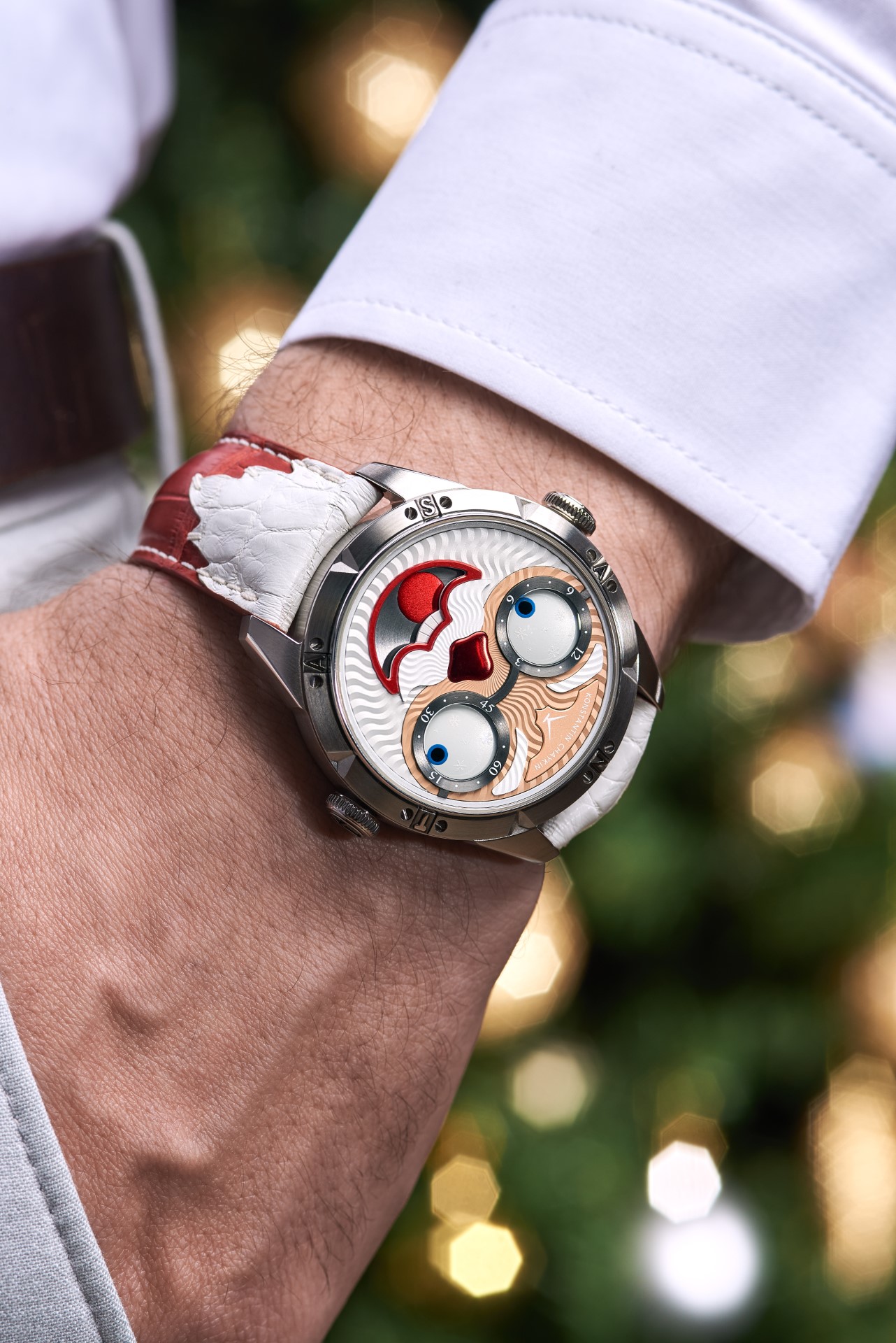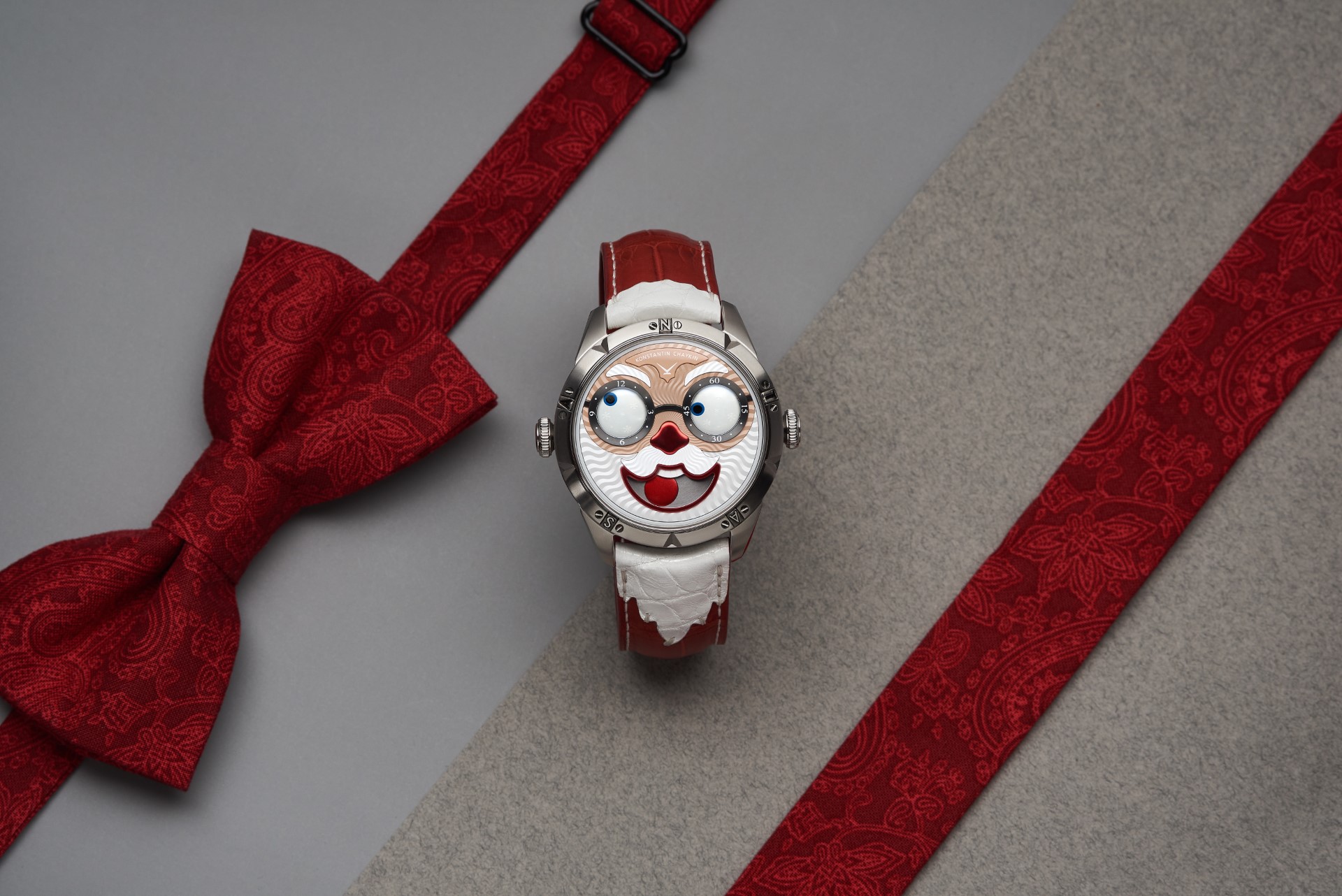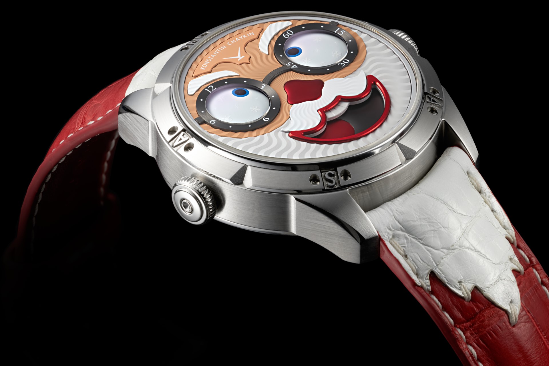 Hidden inside is a soft red leather case, in which Santa delivers his presents (though of course, Santa’s bag is a little bigger). This will come in handy if you need to take your copy of the Santa watch on a trip. It’s mandatory, if we’re talking about Santa, for red to be used in the strap specially created by Konstantin Chaykin for this watch. The new Santa Strap continues the tradition of collectible straps, established by the Russian master with the invention of the Joker Tie-strap (2018). The one-of-a-kind Santa Strap is decorated with white appliqués, giving the look of Santa’s beard and hair. This perfectly matches watches with the joker-indication module, though in a regular watch such a strap would look too pretentious.
