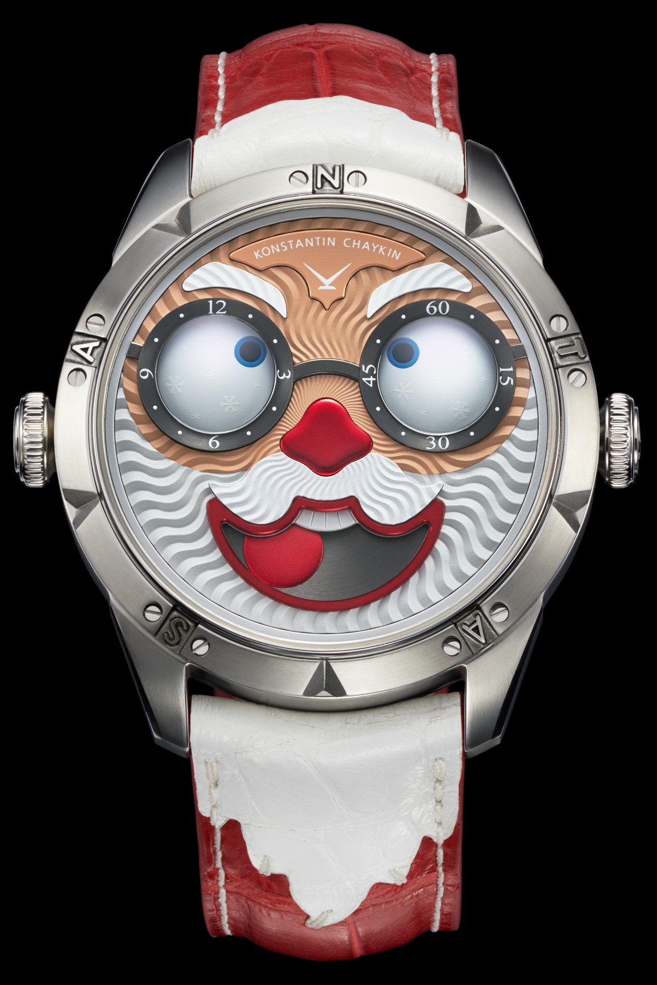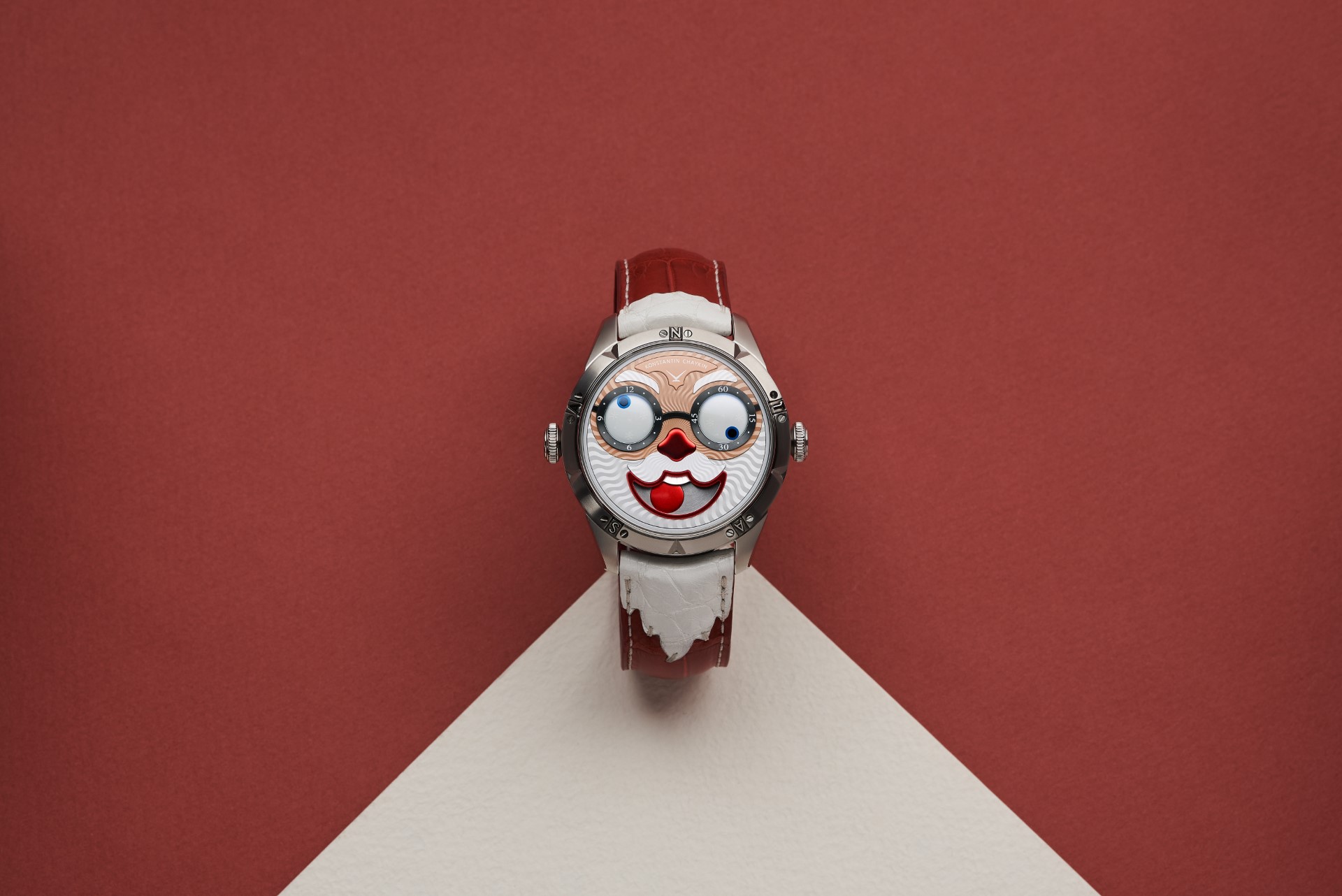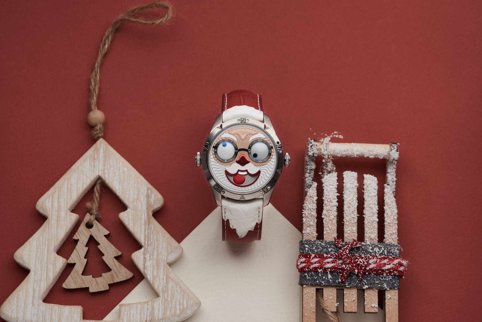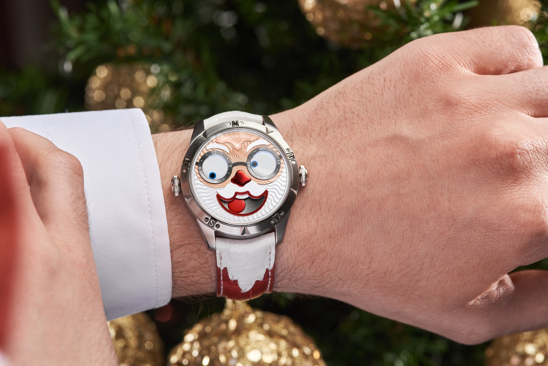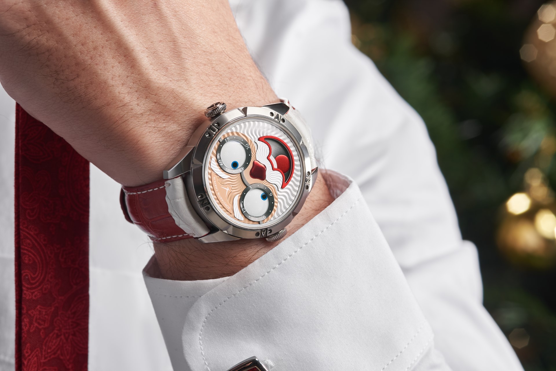 Hidden inside is a soft red leather case, in which Santa delivers his presents (though of course, Santa’s bag is a little bigger). This will come in handy if you need to take your copy of the Santa watch on a trip. It’s mandatory, if we’re talking about Santa, for red to be used in the strap specially created by Konstantin Chaykin for this watch. The new Santa Strap continues the tradition of collectible straps, established by the Russian master with the invention of the Joker Tie-strap (2018). The one-of-a-kind Santa Strap is decorated with white appliqués, giving the look of Santa’s beard and hair. This perfectly matches watches with the joker-indication module, though in a regular watch such a strap would look too pretentious.