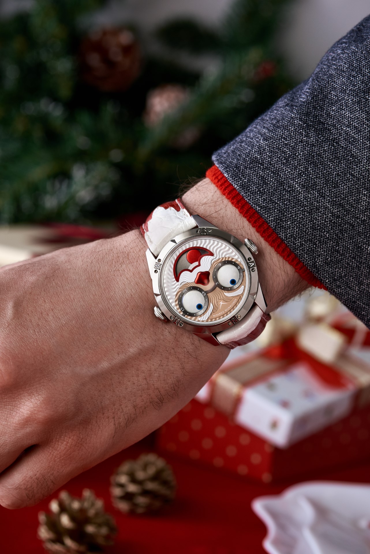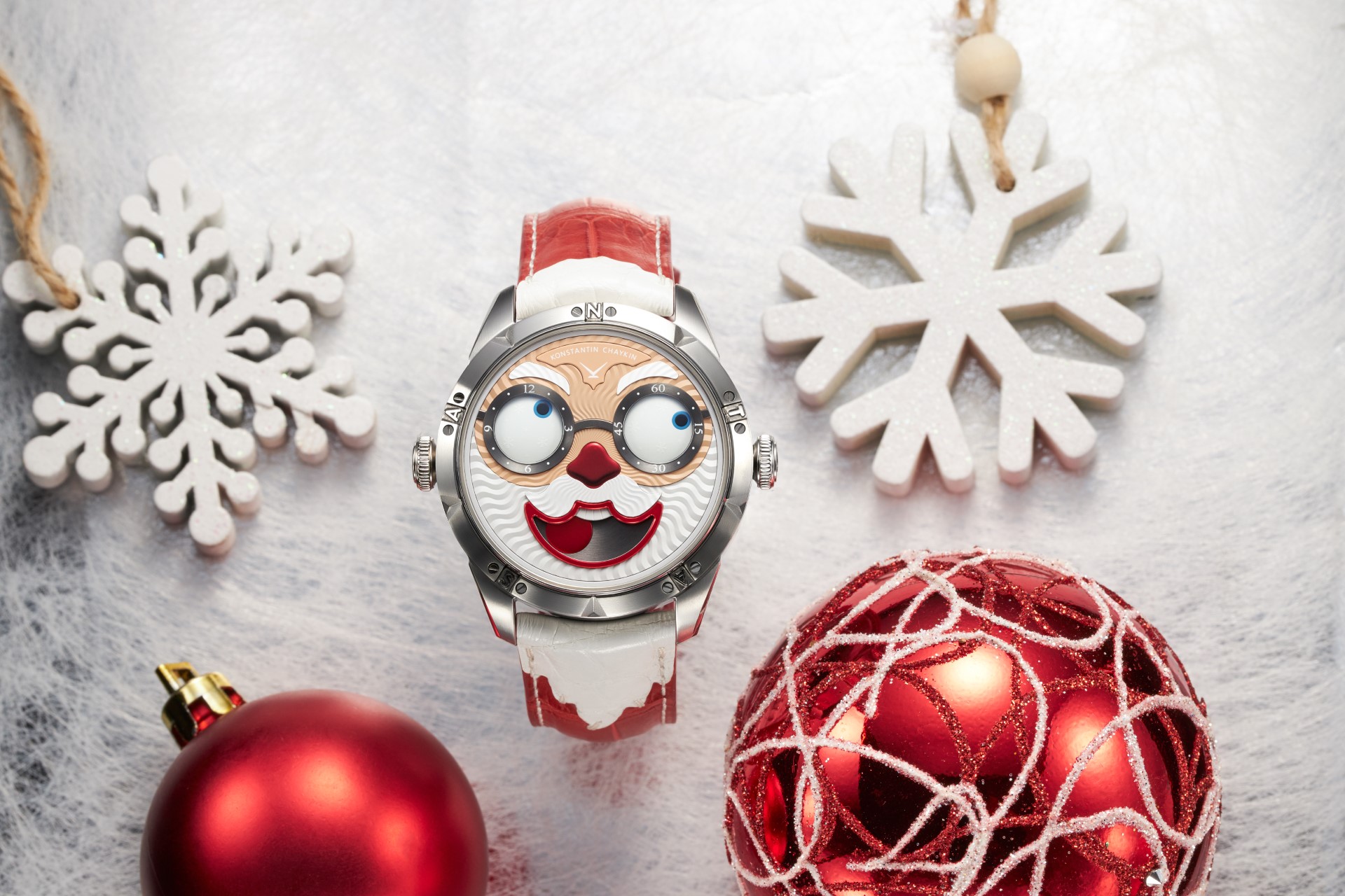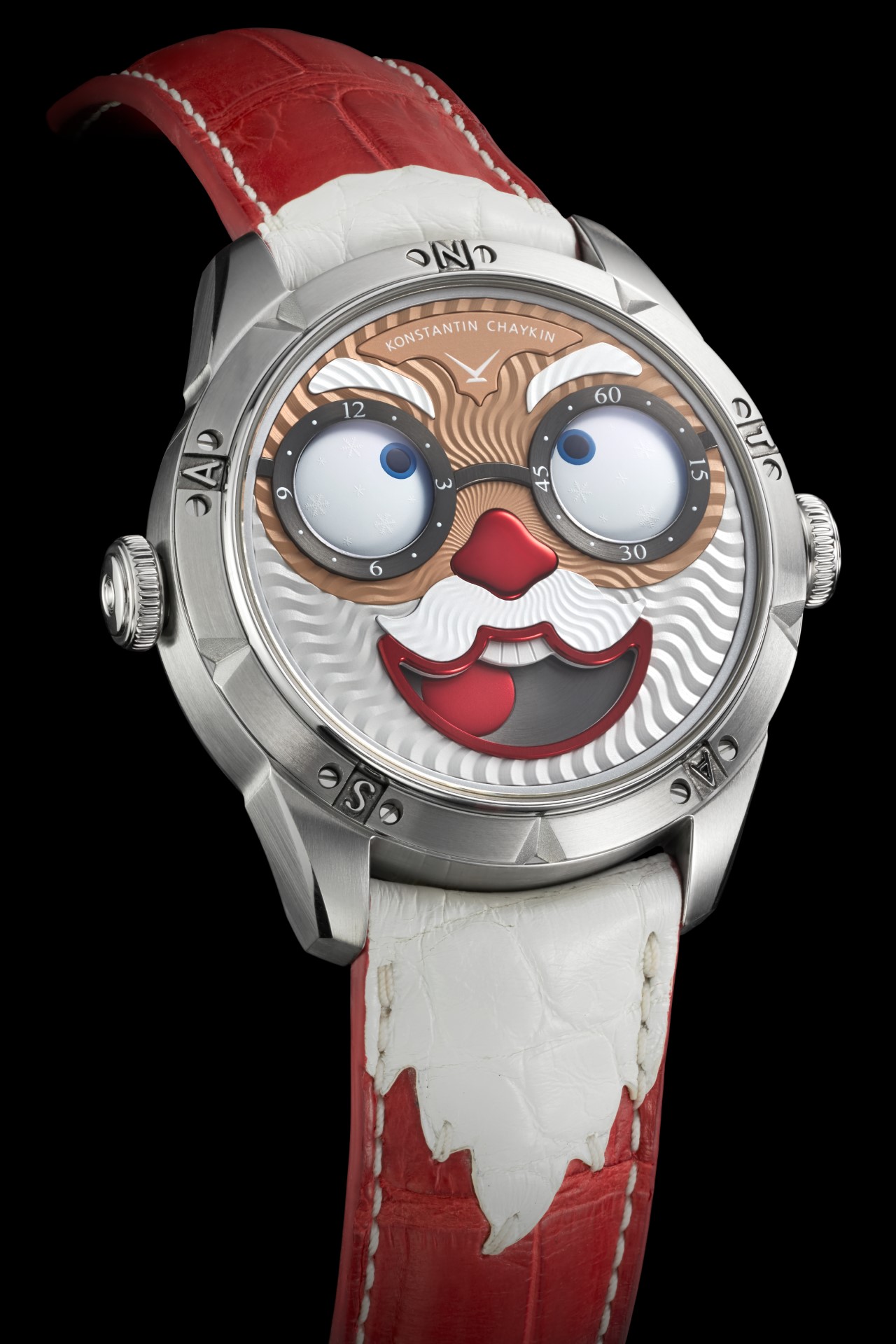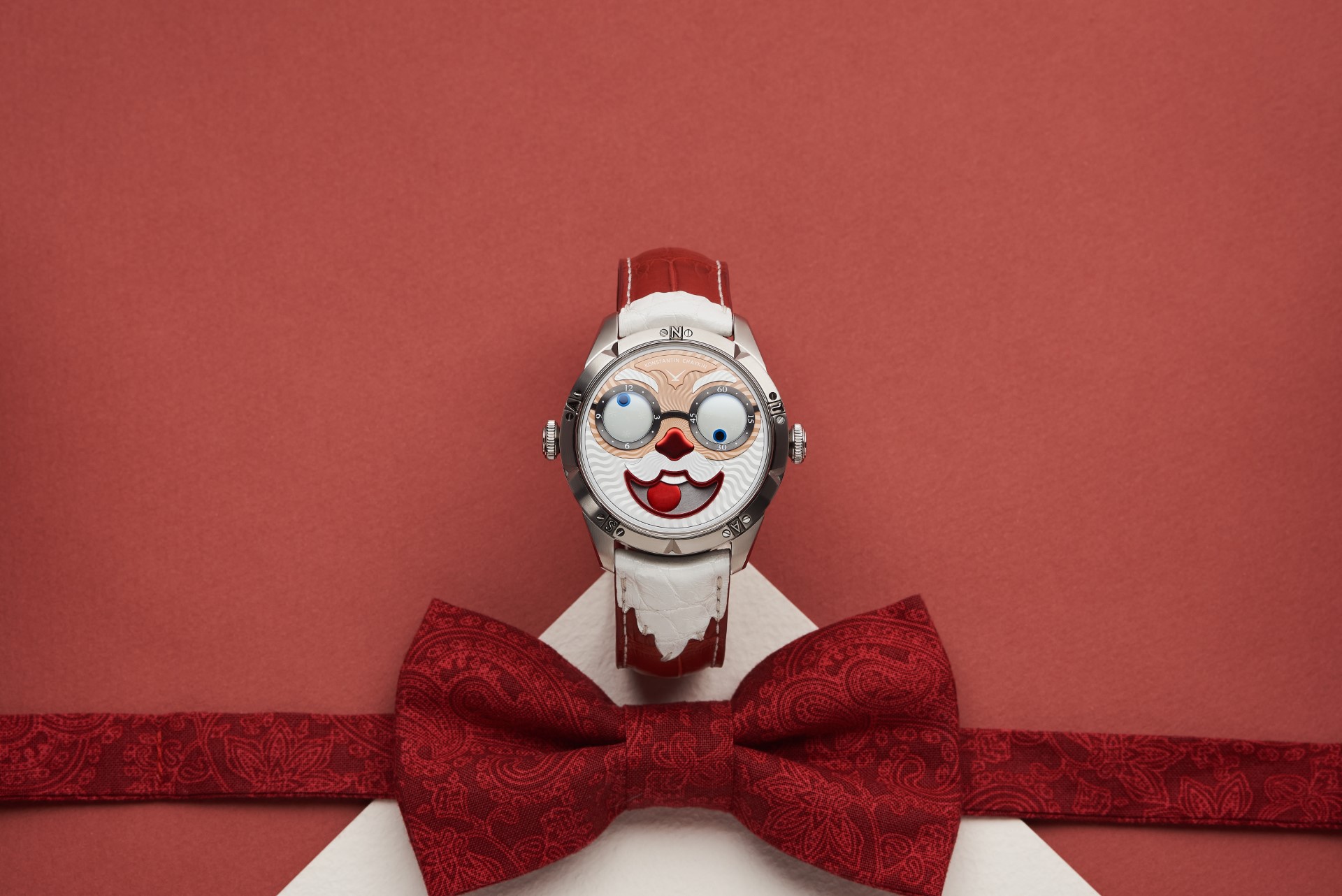 Hidden inside is a soft red leather case, in which Santa delivers his presents (though of course, Santa’s bag is a little bigger). This will come in handy if you need to take your copy of the Santa watch on a trip. It’s mandatory, if we’re talking about Santa, for red to be used in the strap specially created by Konstantin Chaykin for this watch. The new Santa Strap continues the tradition of collectible straps, established by the Russian master with the invention of the Joker Tie-strap (2018). The one-of-a-kind Santa Strap is decorated with white appliqués, giving the look of Santa’s beard and hair. This perfectly matches watches with the joker-indication module, though in a regular watch such a strap would look too pretentious.