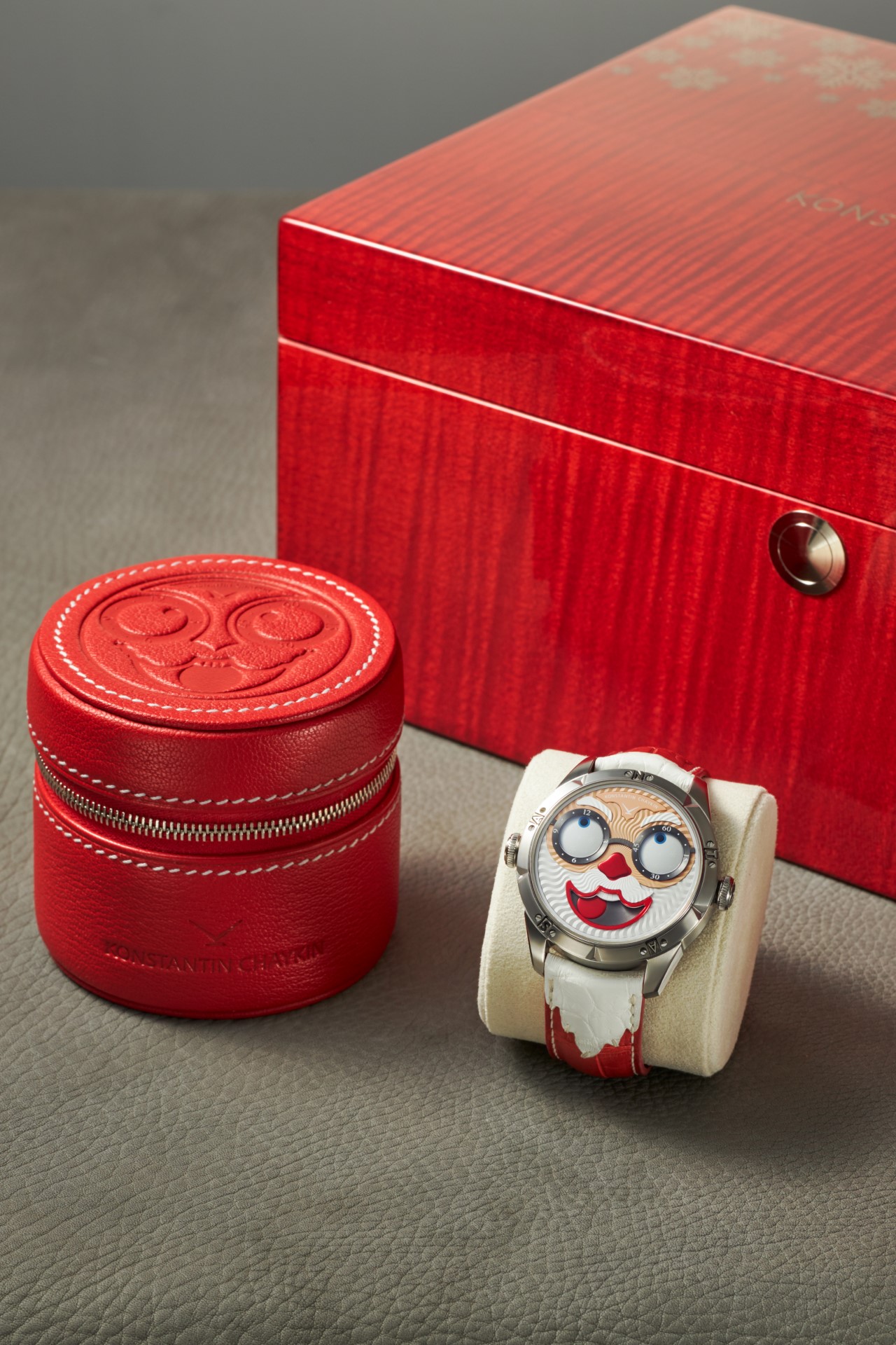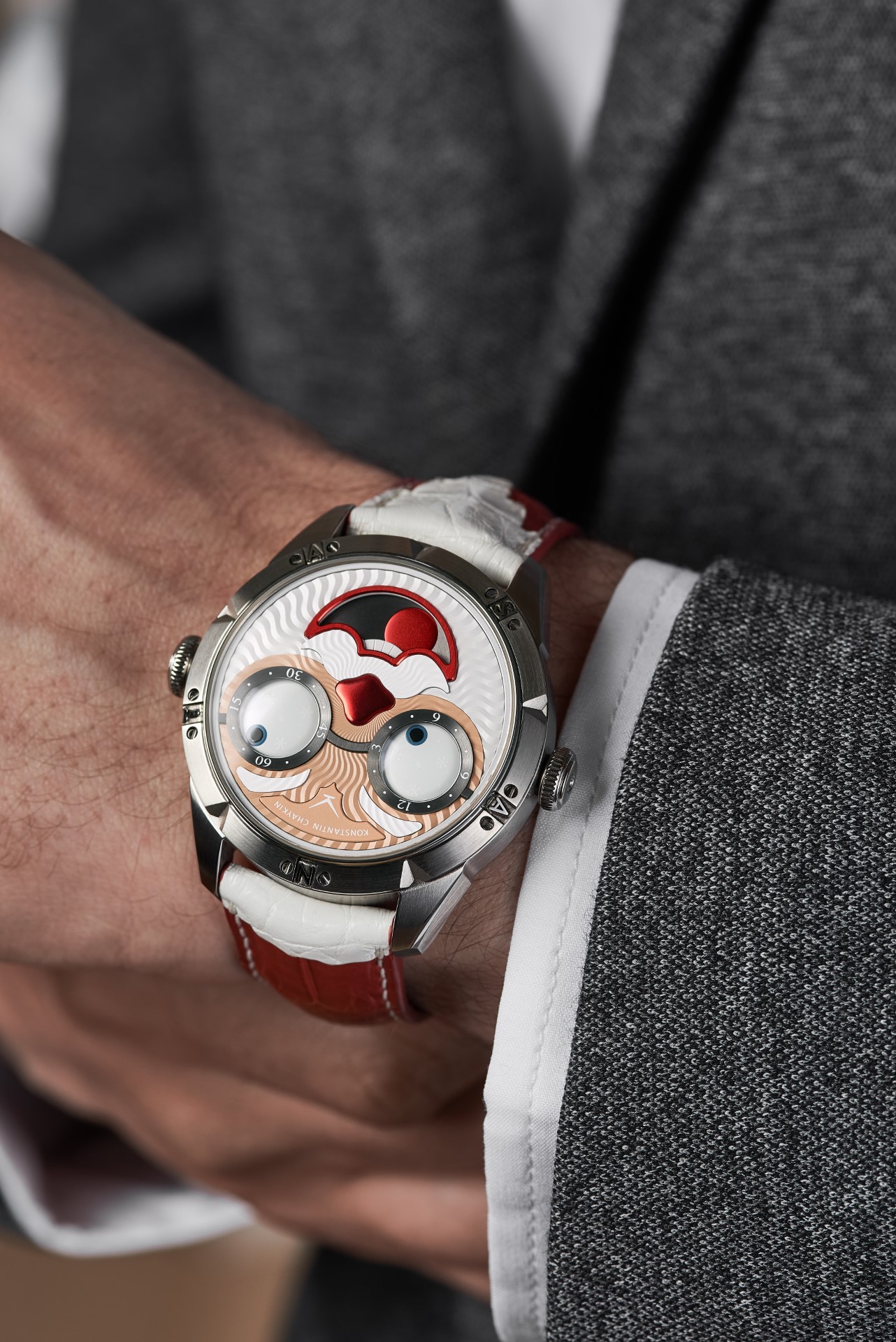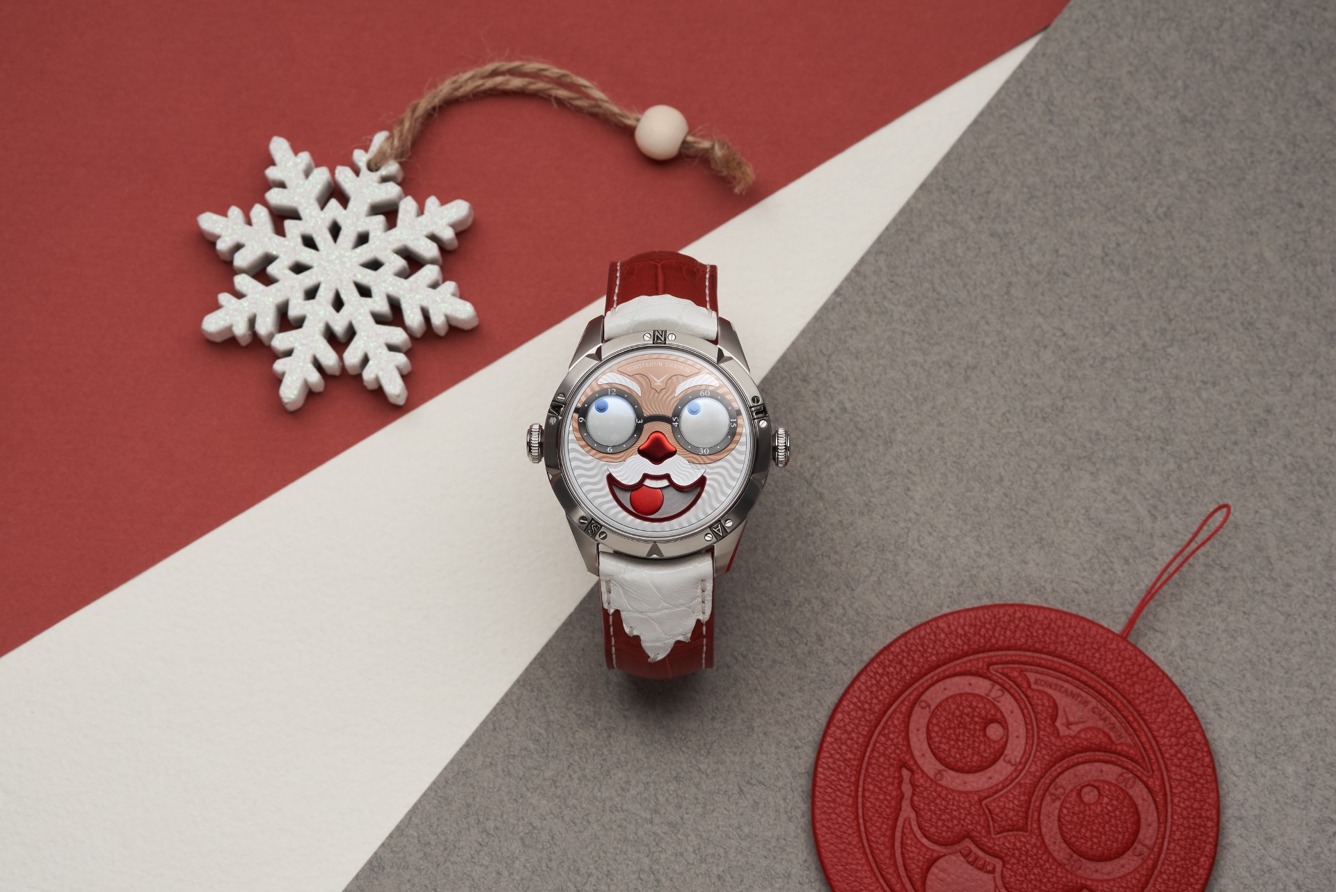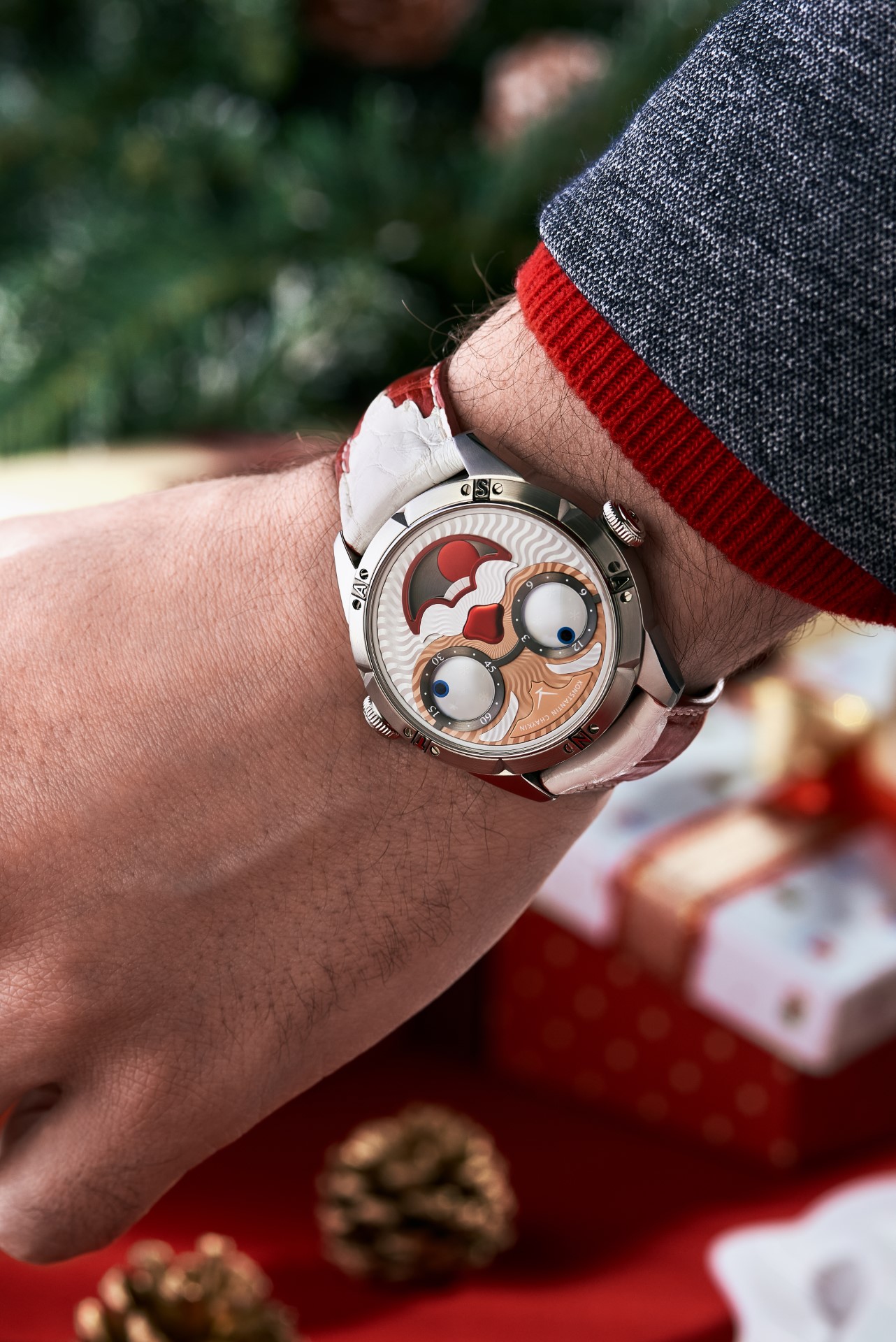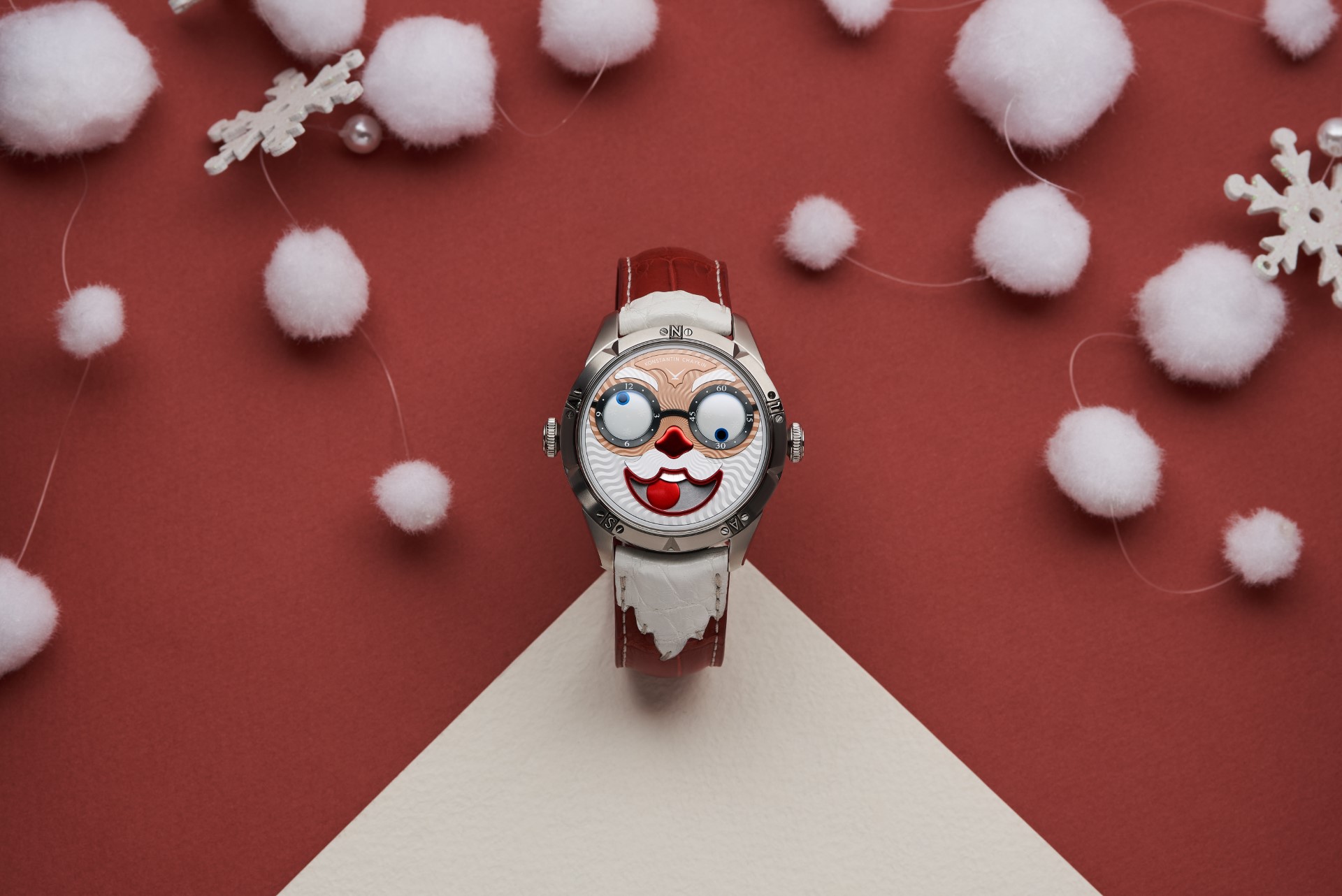 Hidden inside is a soft red leather case, in which Santa delivers his presents (though of course, Santa’s bag is a little bigger). This will come in handy if you need to take your copy of the Santa watch on a trip. It’s mandatory, if we’re talking about Santa, for red to be used in the strap specially created by Konstantin Chaykin for this watch. The new Santa Strap continues the tradition of collectible straps, established by the Russian master with the invention of the Joker Tie-strap (2018). The one-of-a-kind Santa Strap is decorated with white appliqués, giving the look of Santa’s beard and hair. This perfectly matches watches with the joker-indication module, though in a regular watch such a strap would look too pretentious.