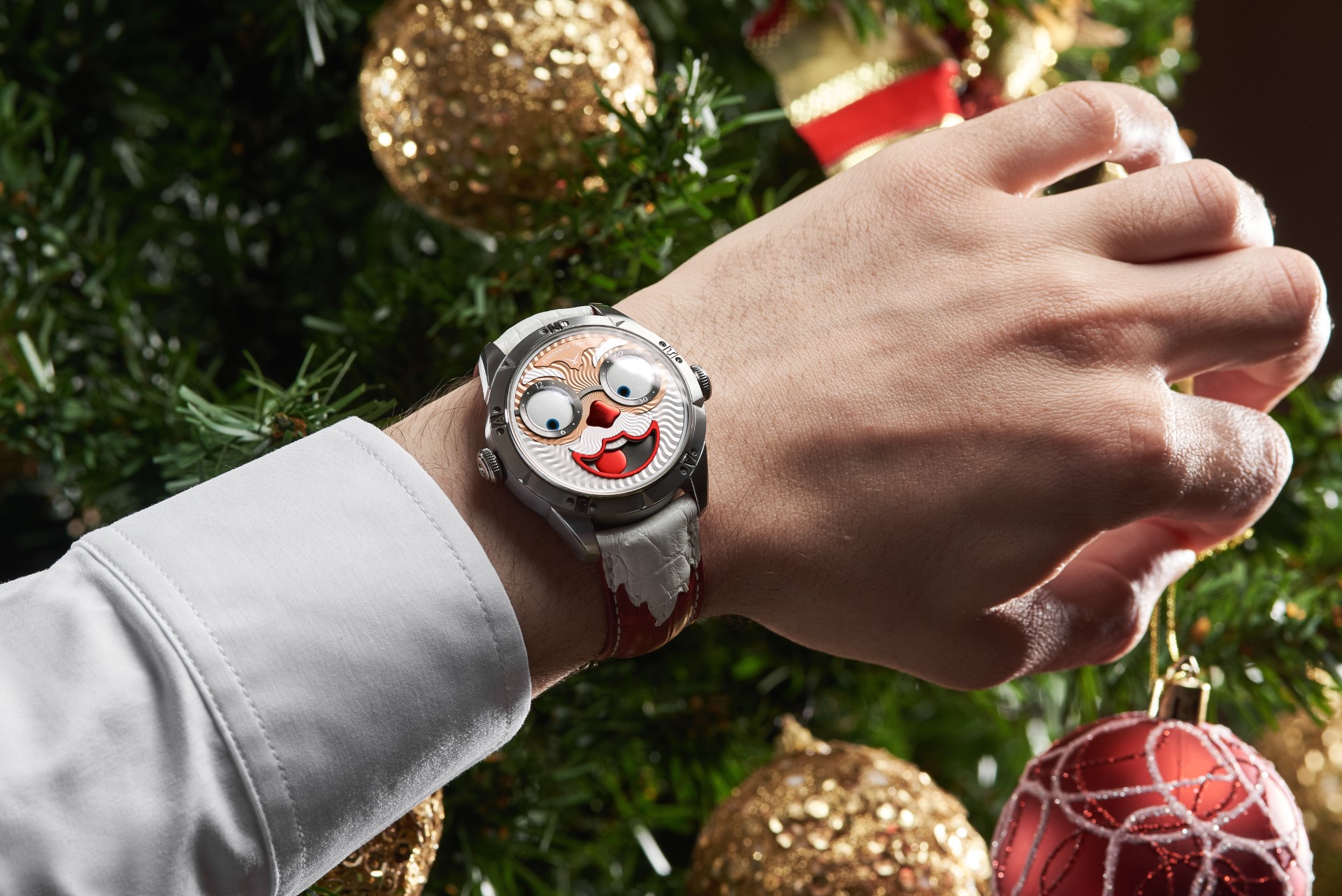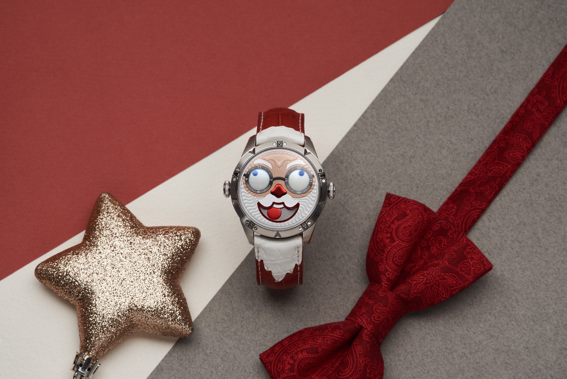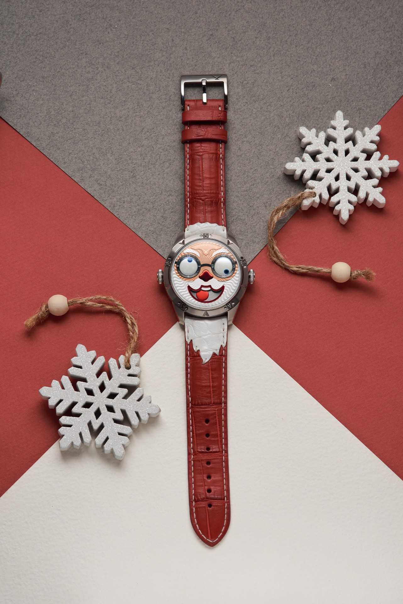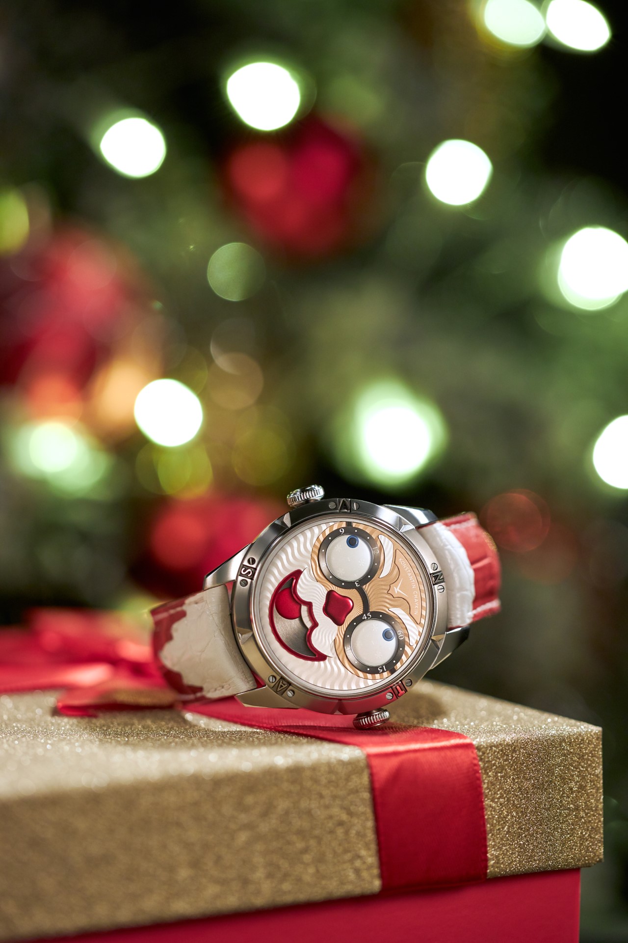 Hidden inside is a soft red leather case, in which Santa delivers his presents (though of course, Santa’s bag is a little bigger). This will come in handy if you need to take your copy of the Santa watch on a trip. It’s mandatory, if we’re talking about Santa, for red to be used in the strap specially created by Konstantin Chaykin for this watch. The new Santa Strap continues the tradition of collectible straps, established by the Russian master with the invention of the Joker Tie-strap (2018). The one-of-a-kind Santa Strap is decorated with white appliqués, giving the look of Santa’s beard and hair. This perfectly matches watches with the joker-indication module, though in a regular watch such a strap would look too pretentious.