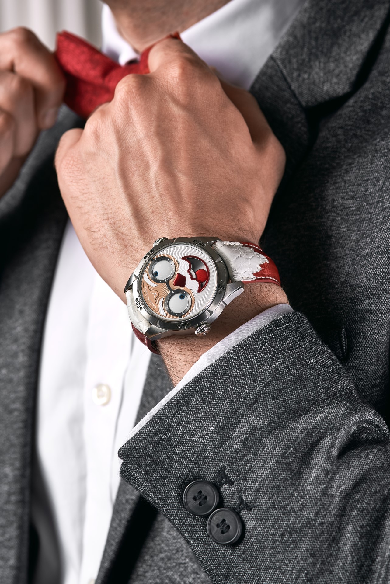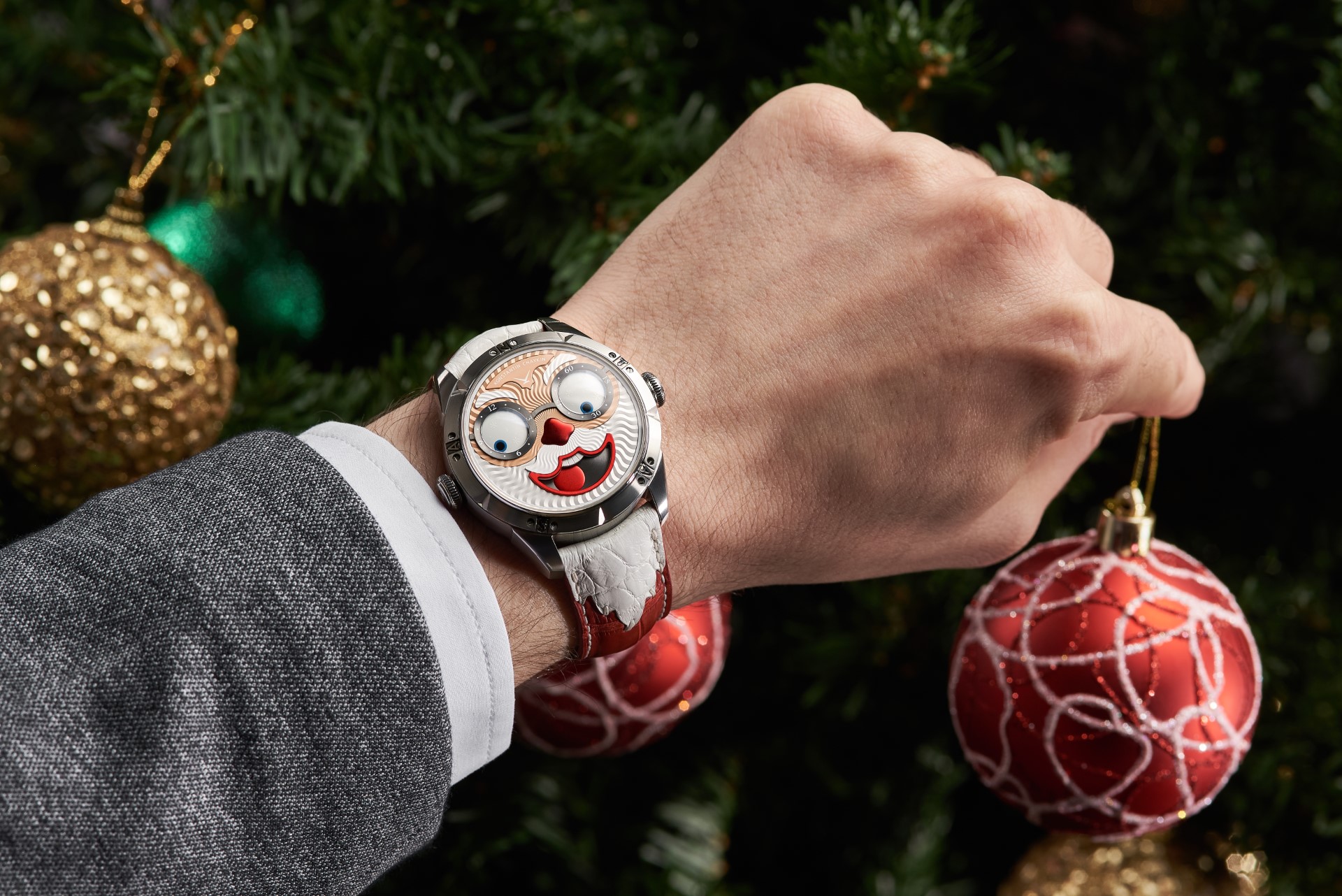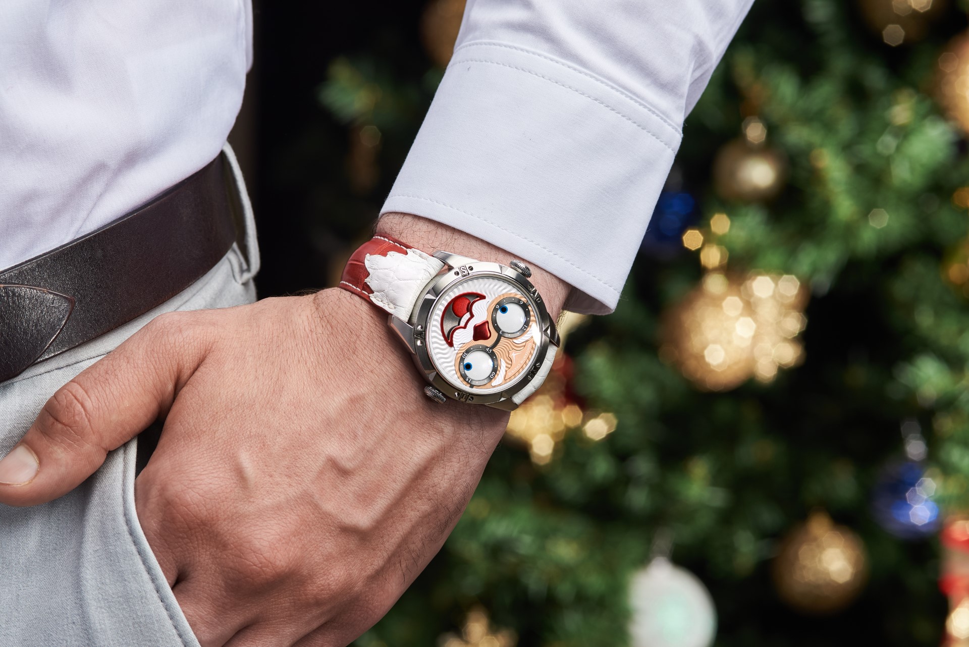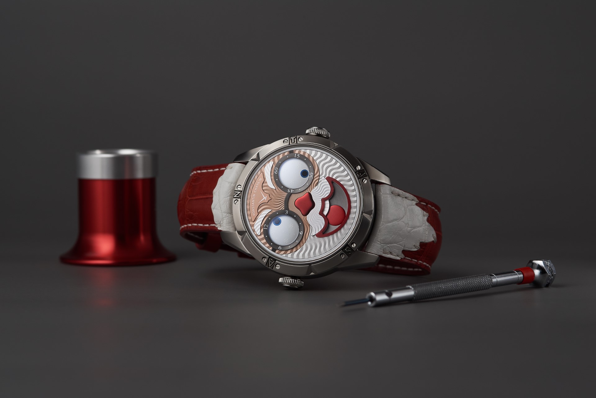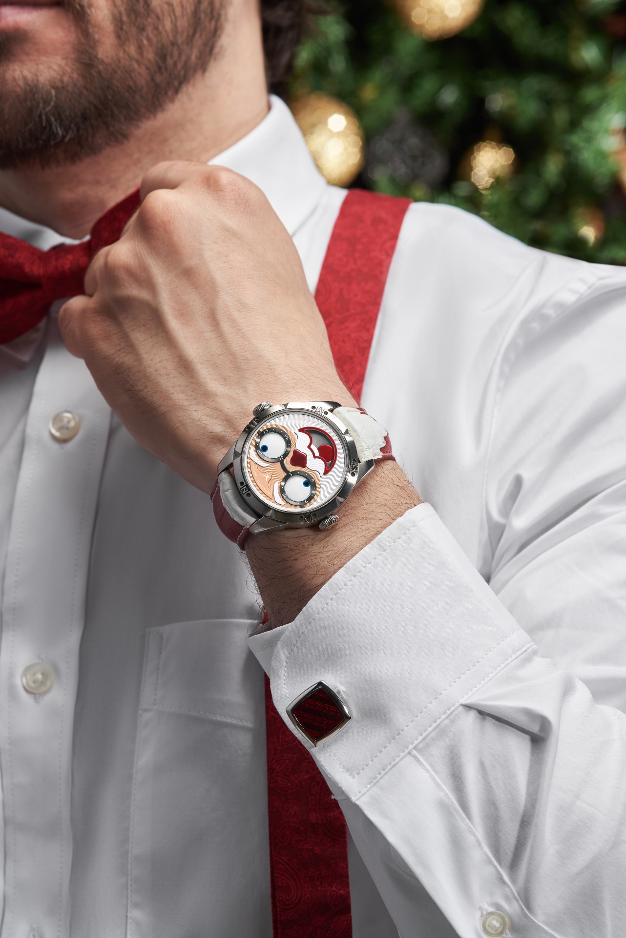 Hidden inside is a soft red leather case, in which Santa delivers his presents (though of course, Santa’s bag is a little bigger). This will come in handy if you need to take your copy of the Santa watch on a trip. It’s mandatory, if we’re talking about Santa, for red to be used in the strap specially created by Konstantin Chaykin for this watch. The new Santa Strap continues the tradition of collectible straps, established by the Russian master with the invention of the Joker Tie-strap (2018). The one-of-a-kind Santa Strap is decorated with white appliqués, giving the look of Santa’s beard and hair. This perfectly matches watches with the joker-indication module, though in a regular watch such a strap would look too pretentious.