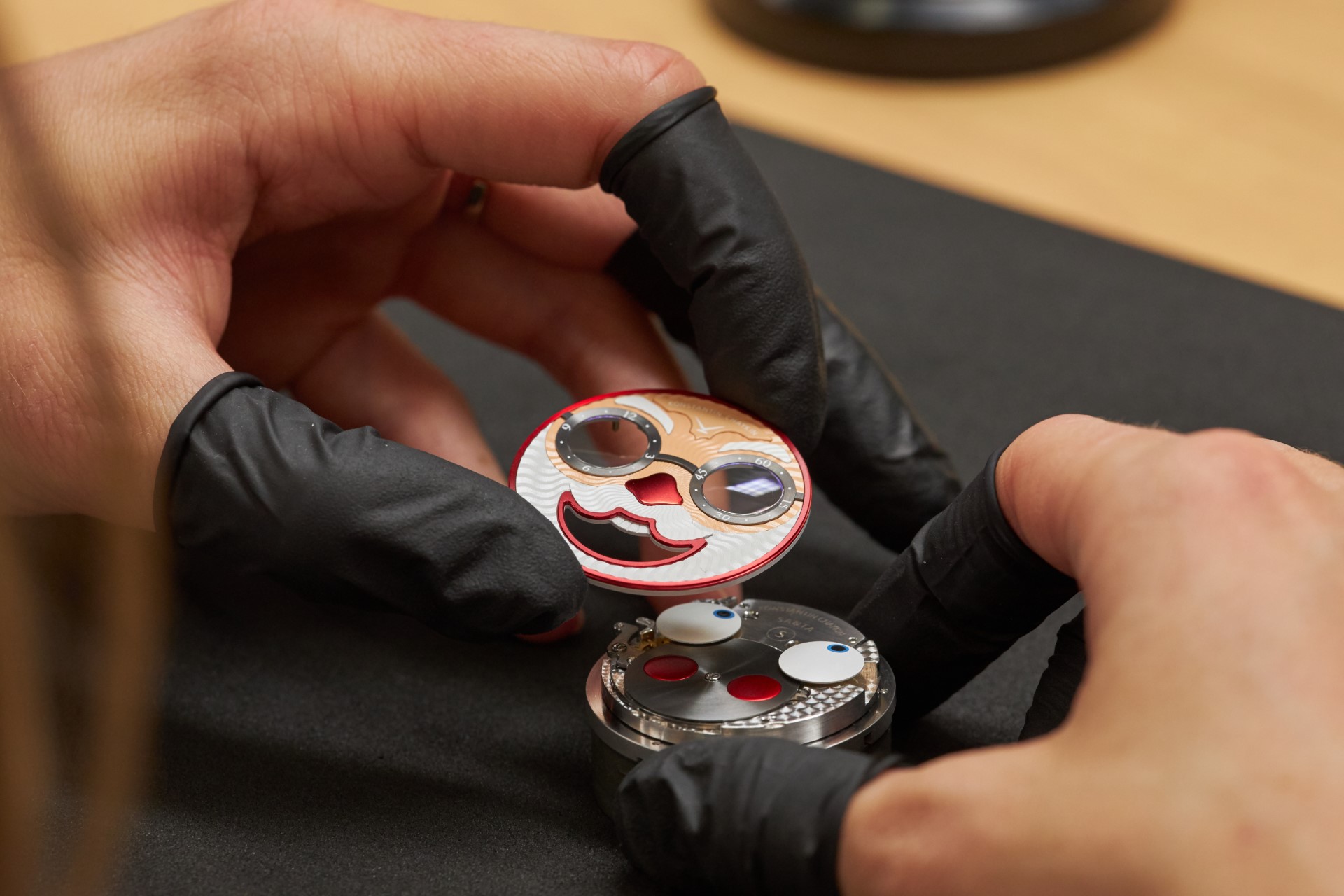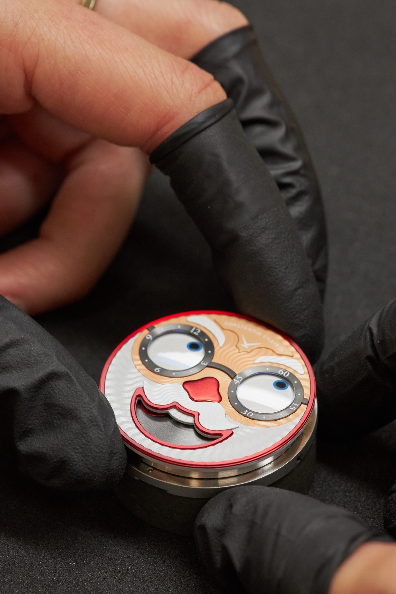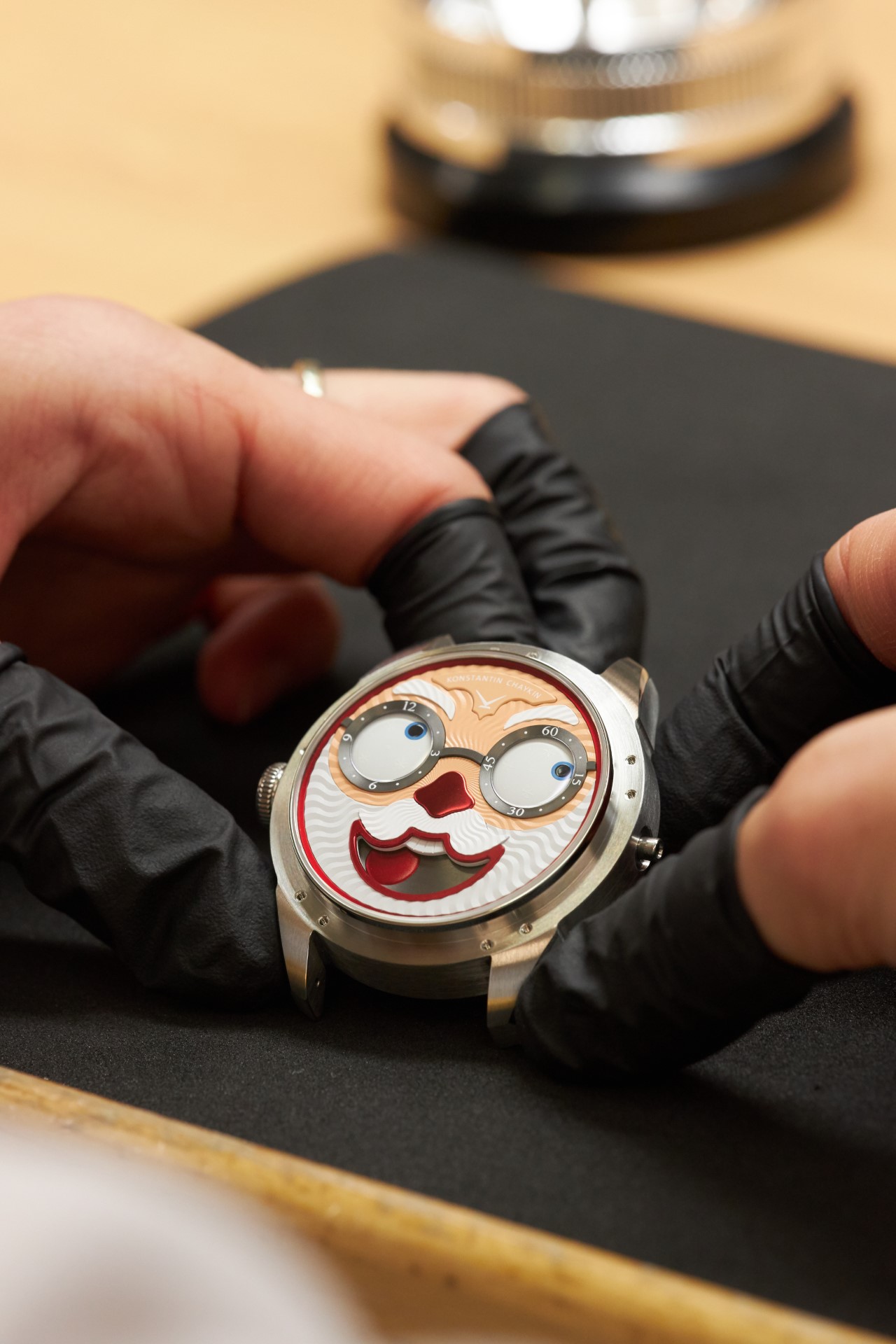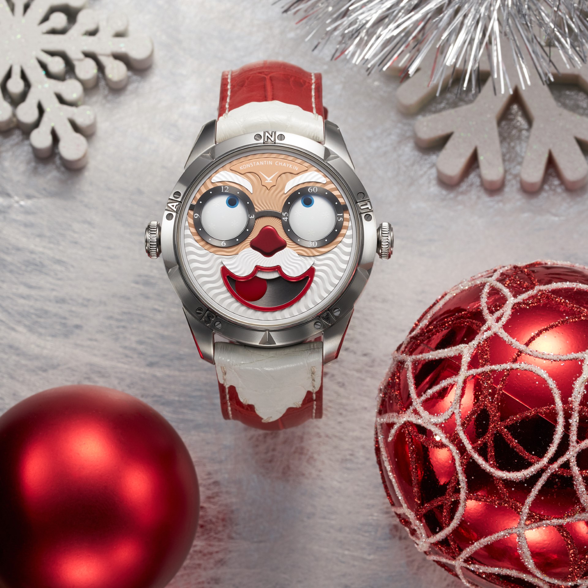 The very fact of the appearance of glasses as one of the main attributes of the Santa costume remains covered in a veil of mystery. Even the museum of the Coca Cola company, who have been using the image of Santa Claus in their advertising for almost a century – since 1931 – and are often thought to be the creators of the classic modern Santa look, do not help to give a definitive answer to the question – who gave Santa glasses? Nevertheless, now we know for sure who the first watchmaker to create glasses for a wristwatch dial and equip them with real sapphire lenses was – Konstantin Chaykin. Naturally, the glasses, despite their miniature size, were not cheap, especially lenses of unique geometry. But how can you refuse Santa at Christmas?