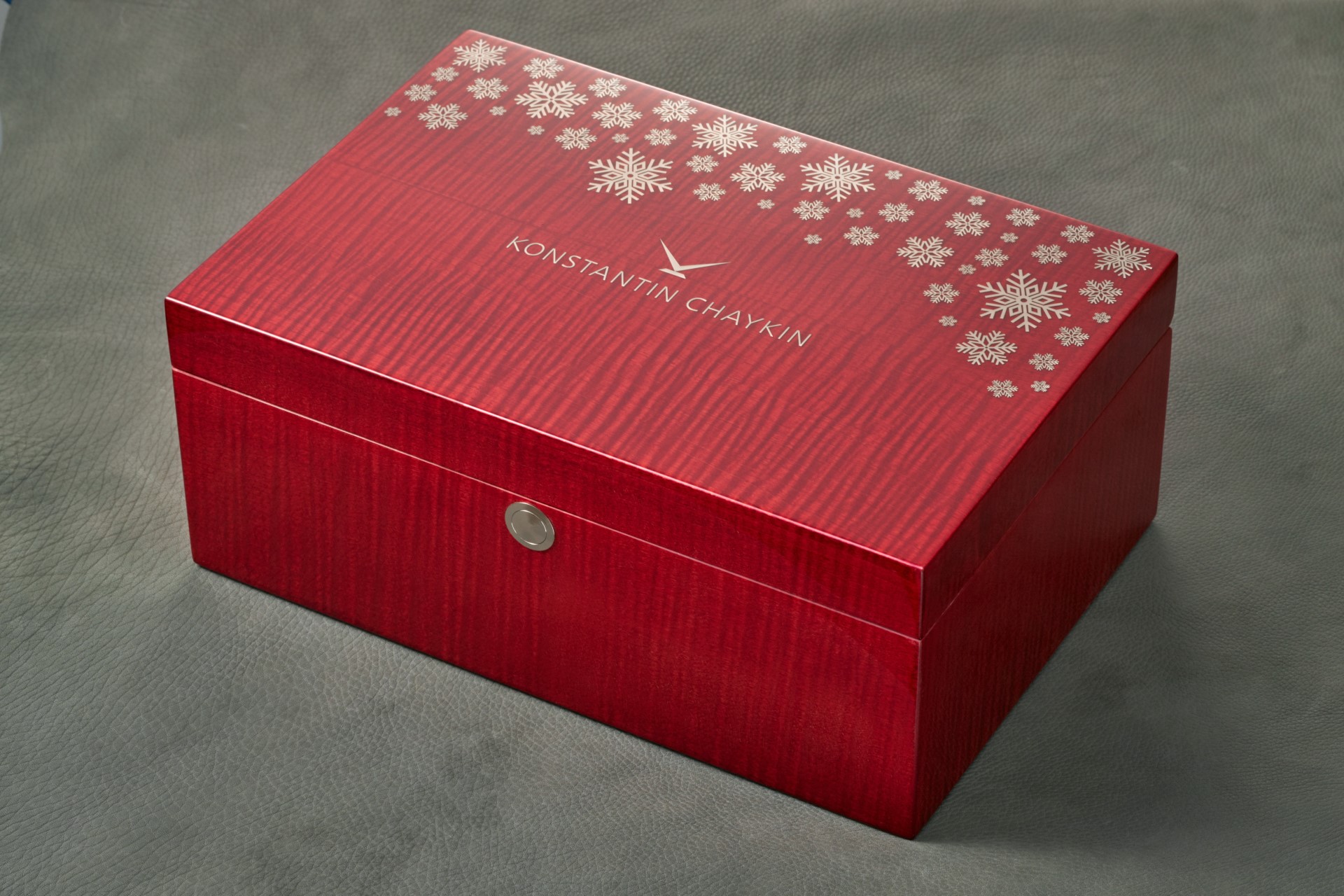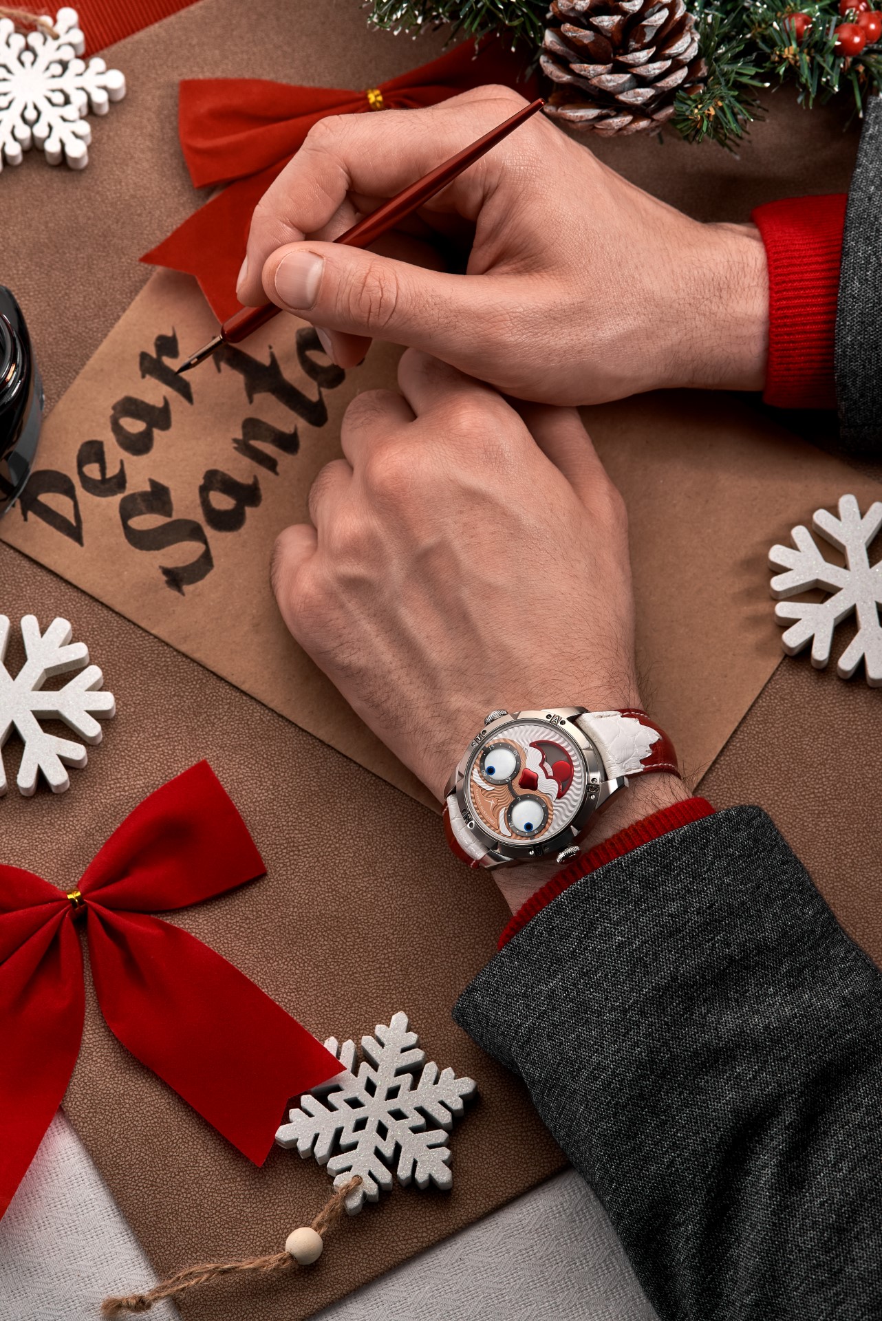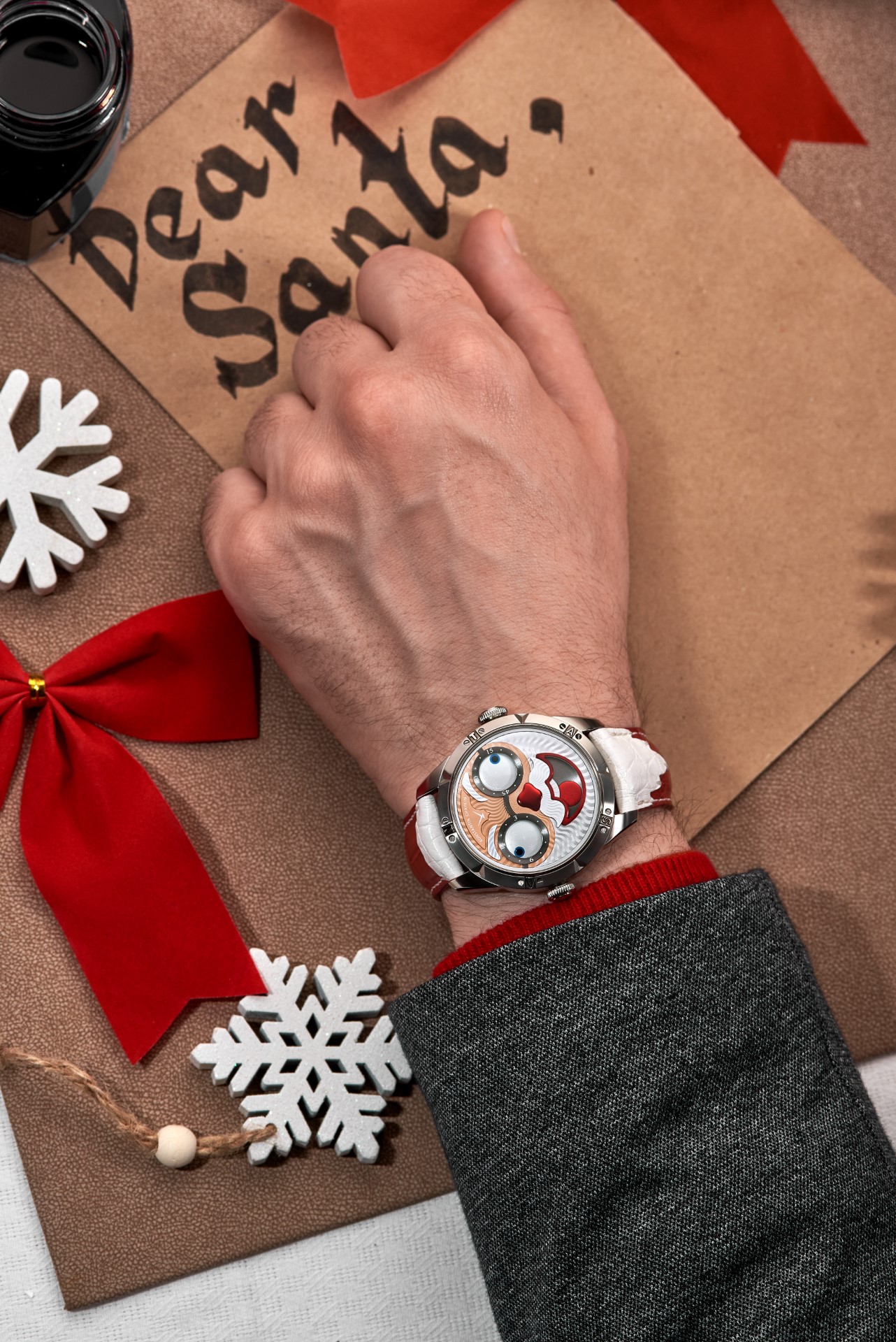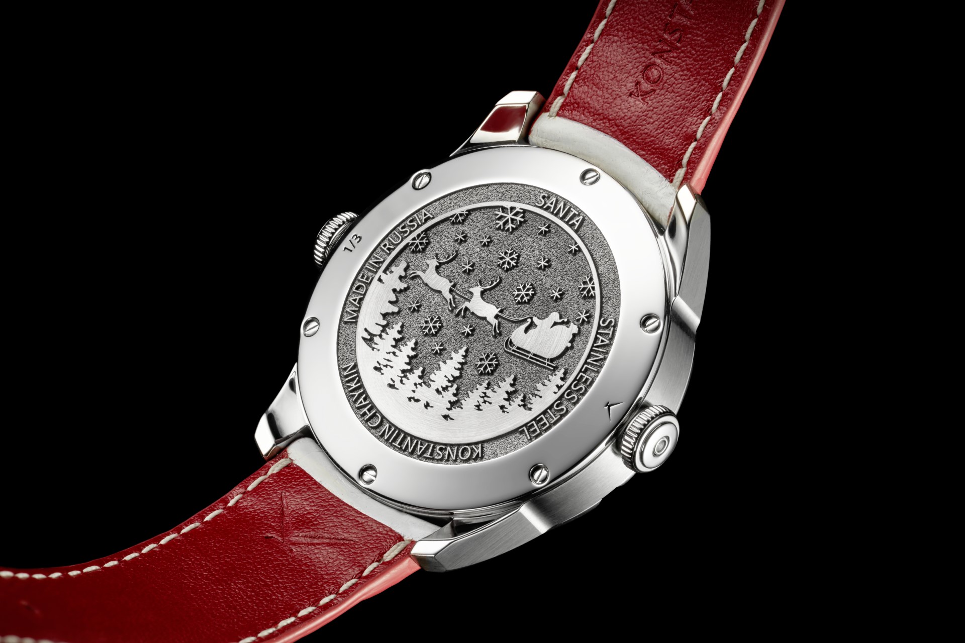 Some of the design features of the watch are obvious, while some require closer inspection. Among the more obvious elements of a watch made in honour of Santa are the bezel of the steel case, marked with the letters of the word ‘Santa’, and the steel caseback. This, as well as the appropriate inscriptions regarding the name of the watch, the name of the watchmaker who created it, the material of the case, the country where the watch was made, and the number of the piece in the limited edition – alas, only three in total! – also has a carefully relief-engraved Christmas image. Santa carries gifts on a sleigh pulled by reindeer, flying over the snow-covered trees of Lapland…or is it Oymyakon…? Cosy memories of childhood, of letters to Santa, of gifts under a festively-decorated Christmas tree, all become even warmer when looking at the red-lacquered box of the watch, a box also decorated with snowflakes.