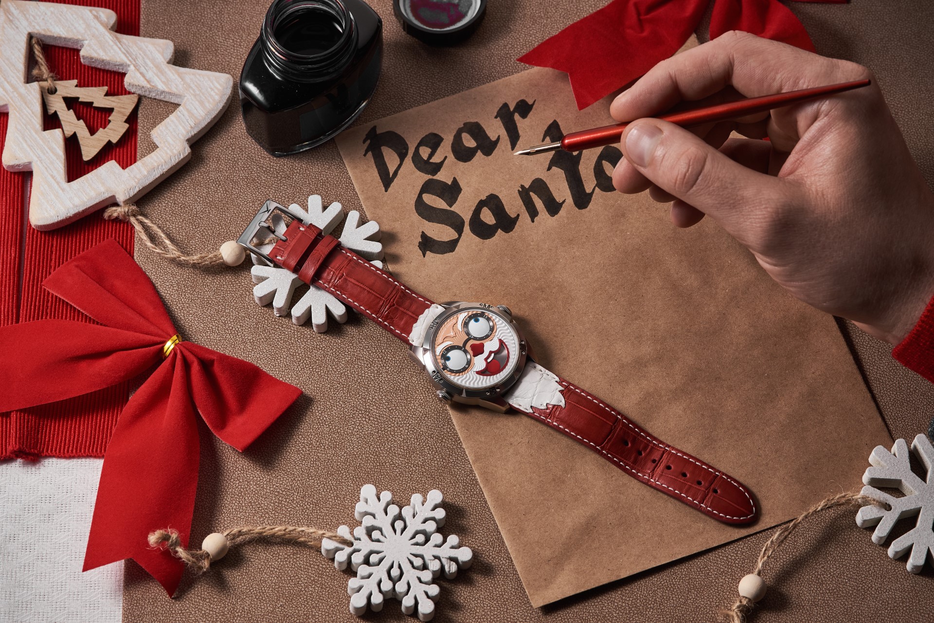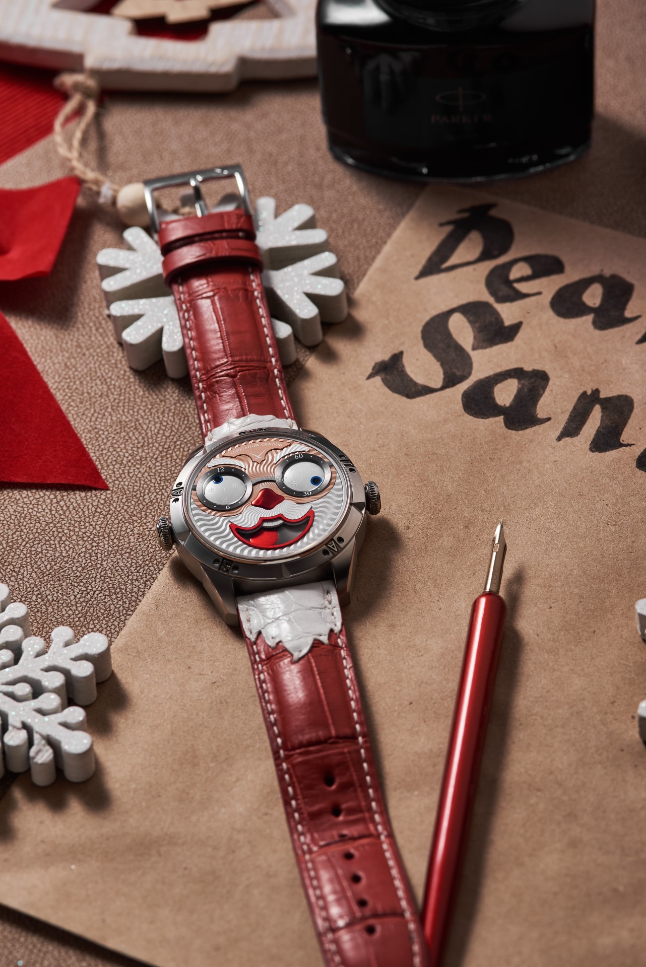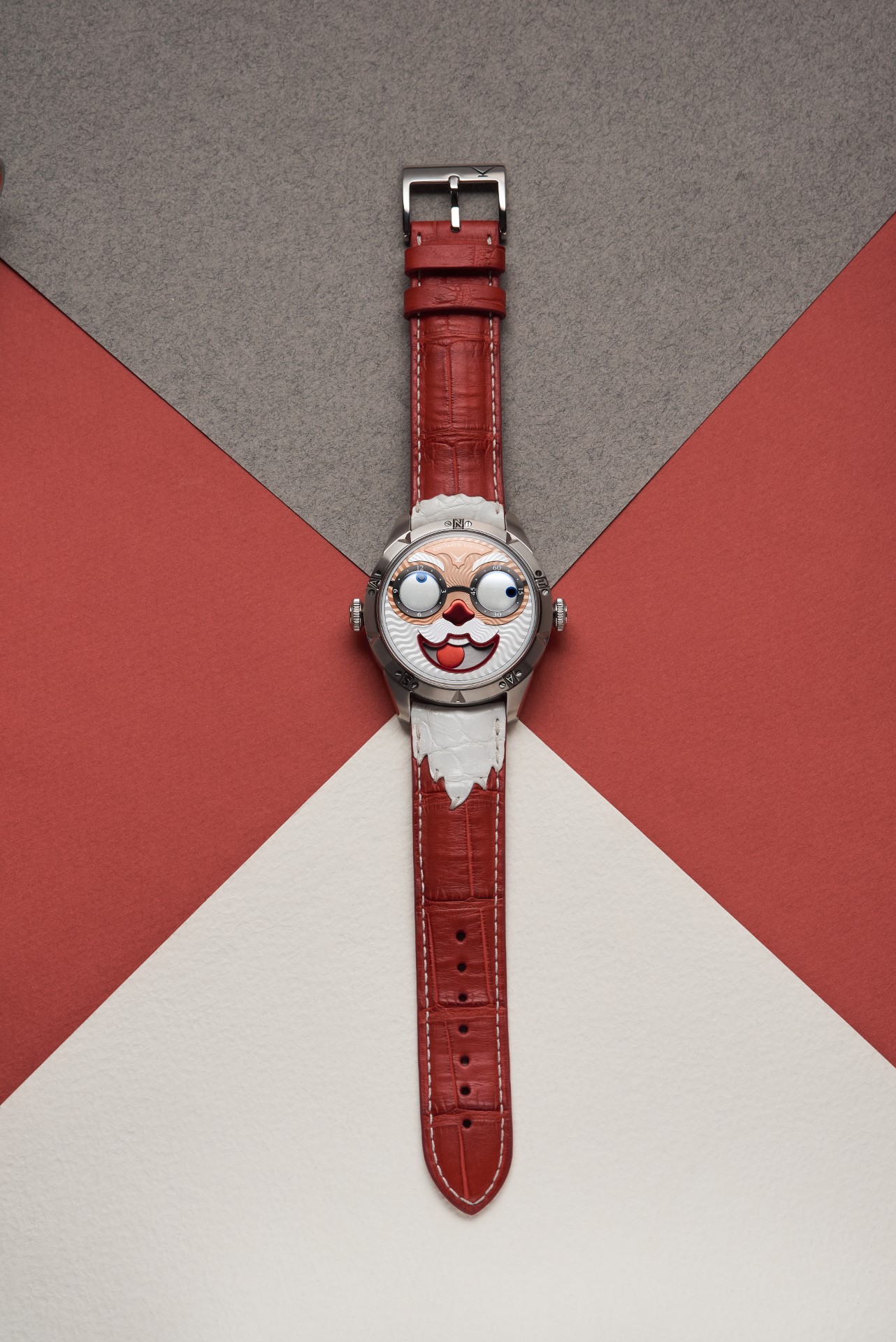- Exclusive collectable strap, red alligator leather with applied décor “Santa’s beard and hair”, white stitching