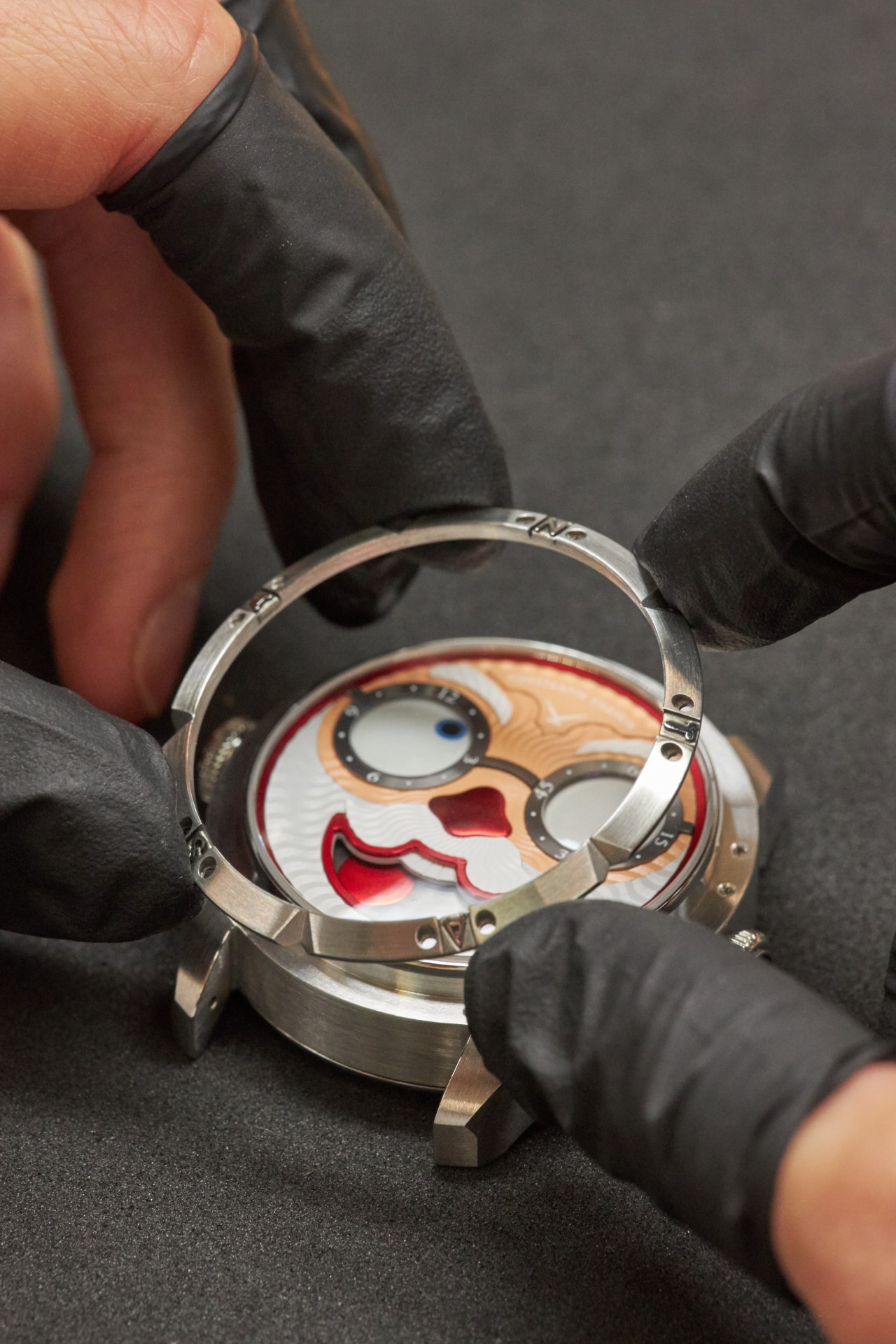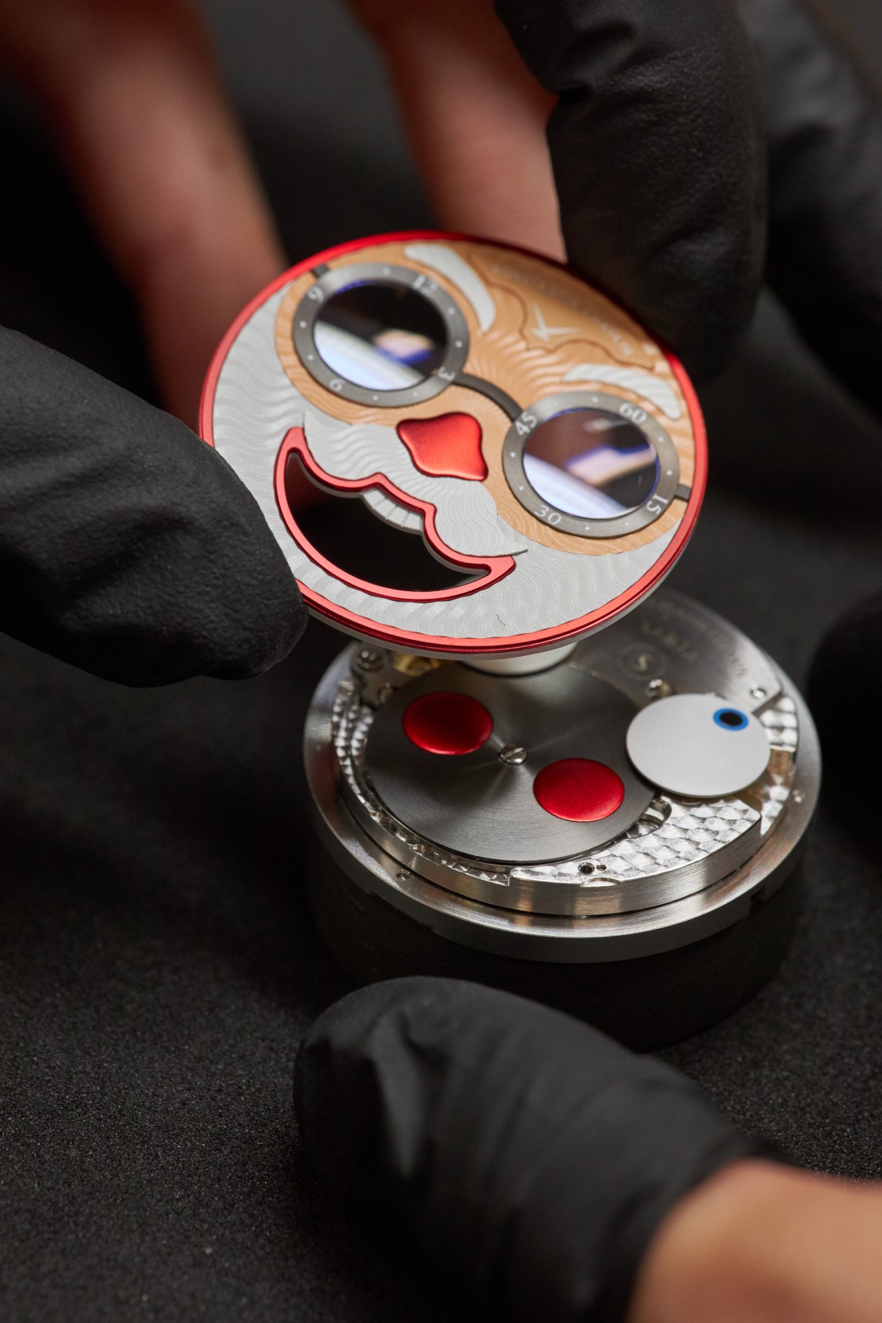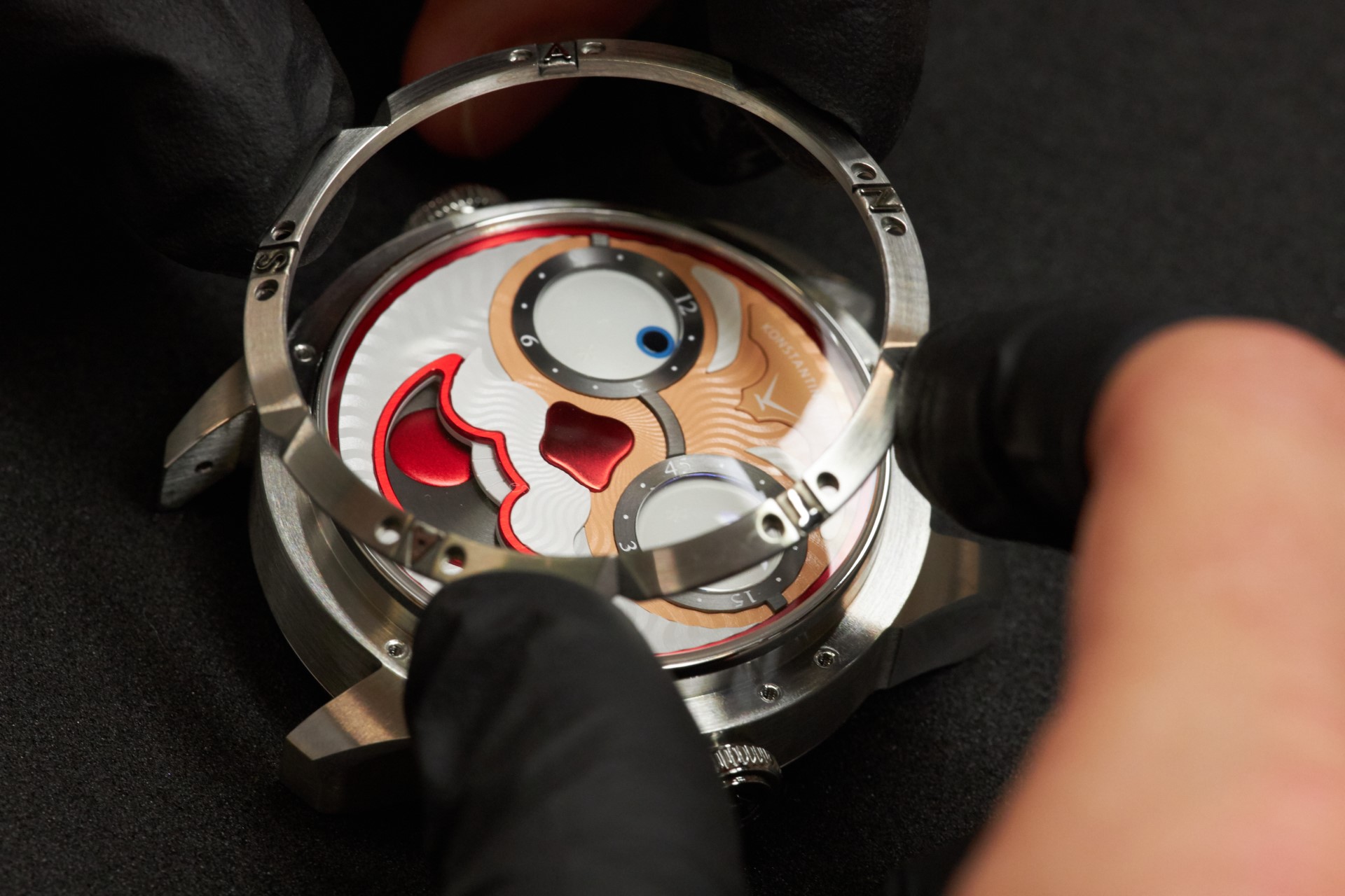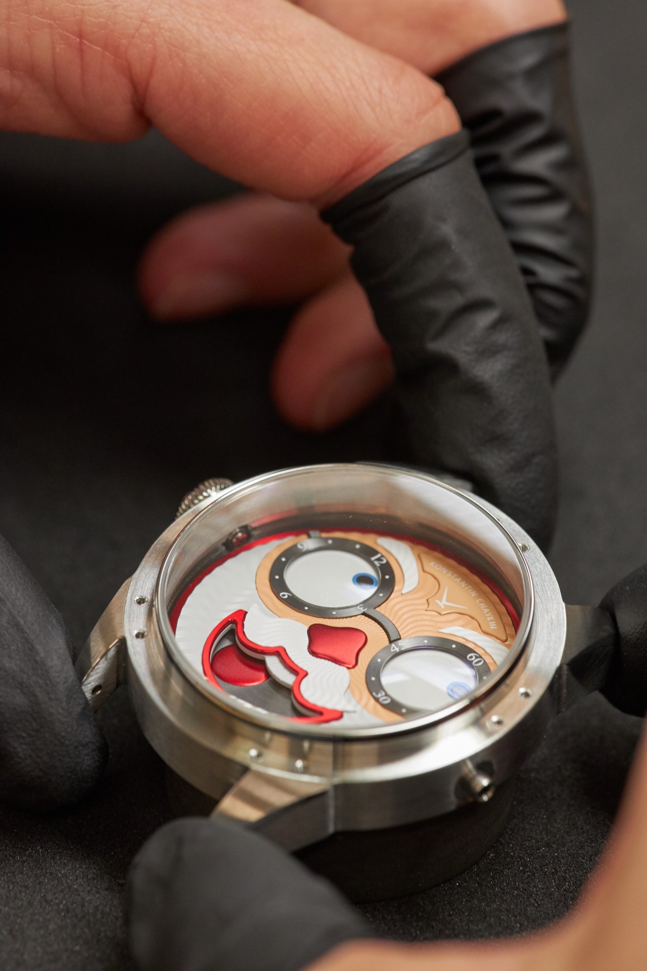 Whereas in the standard movement (caliber K.07-0) the convex discs of the hour and minute indicators were installed above the moonphase indicator disc, in the new caliber K.07-2 all three discs are in one line. Konstantin used shorter axles for the hour and minute indicators while also increasing the radius of the sphere (these discs always having a spherical surface). The Wristmons’ eyes have slightly decreased in size, visually compensated for by the sapphire lenses, as has the diameter of the lunar disc. The face-like dial had to be redesigned, which was inevitable anyway given that Chaykin creates a new design for each new character of the Wristmons collection.