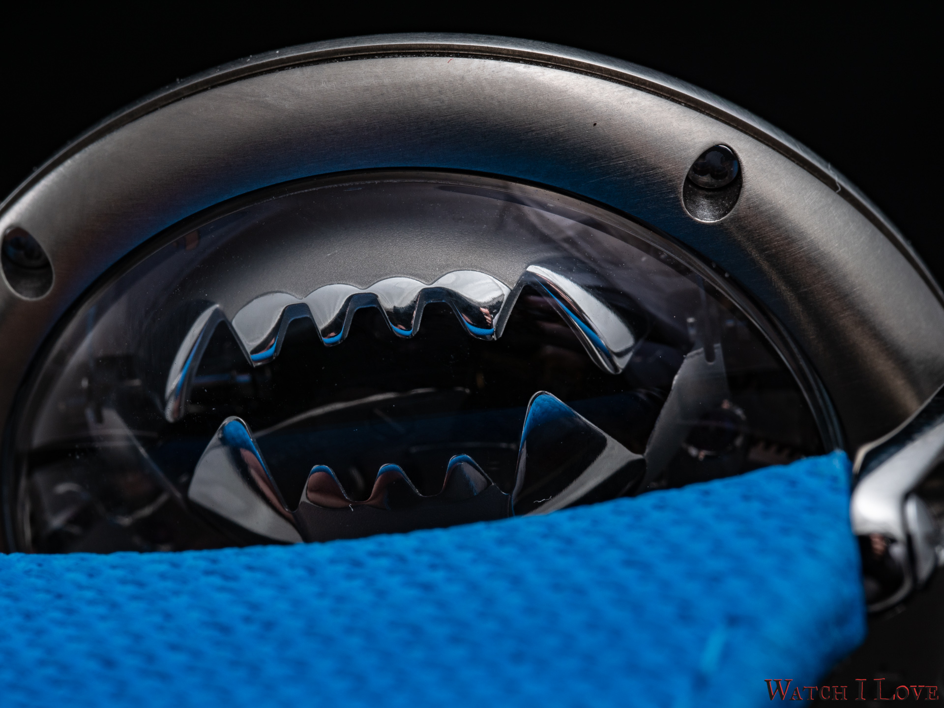 - Power reserve indicated in 3D by the opening and closing of the jaws (end of power reserve = closed jaws).