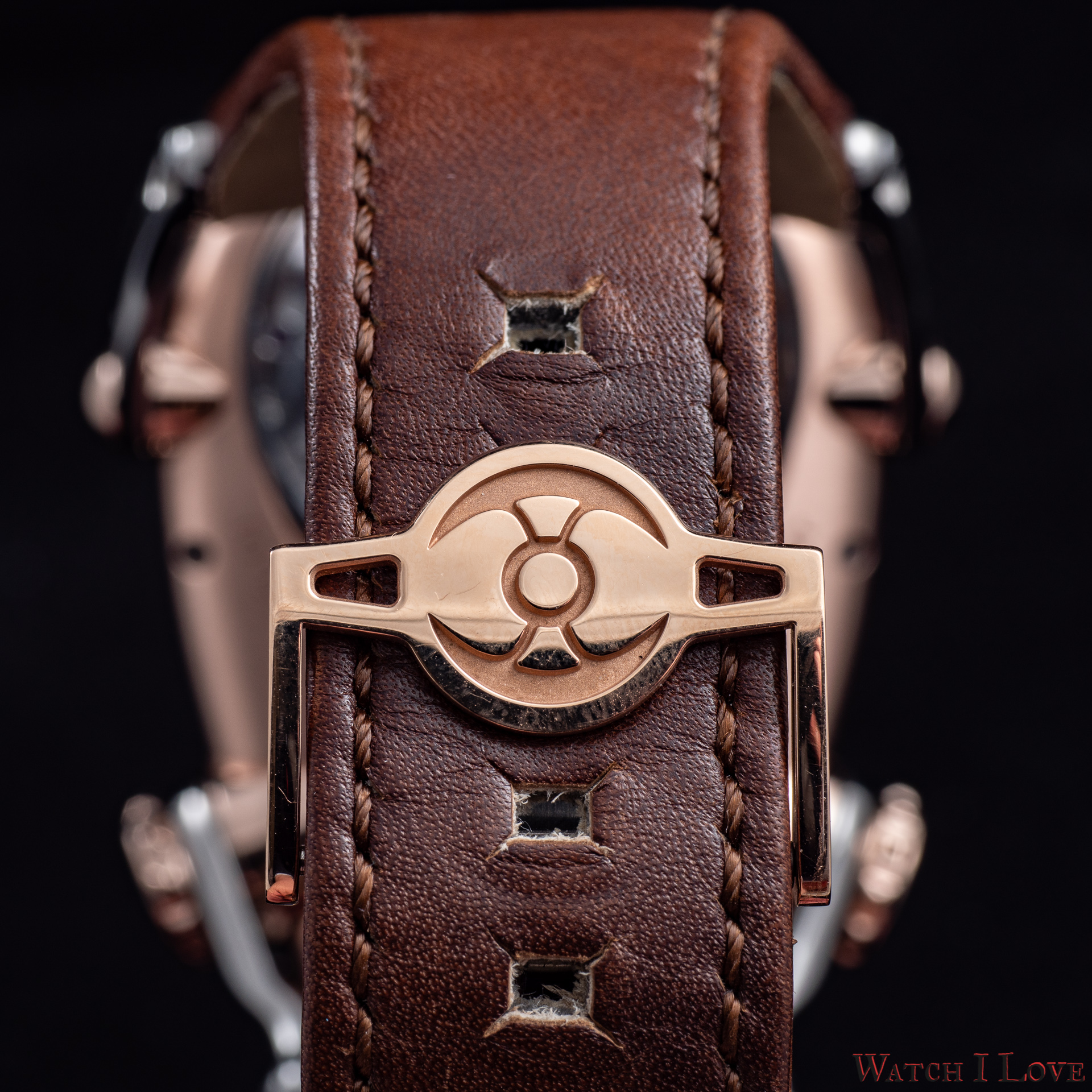 - RT version: hand-stitched brown calf-leather strap with custom-designed red gold folding buckle.