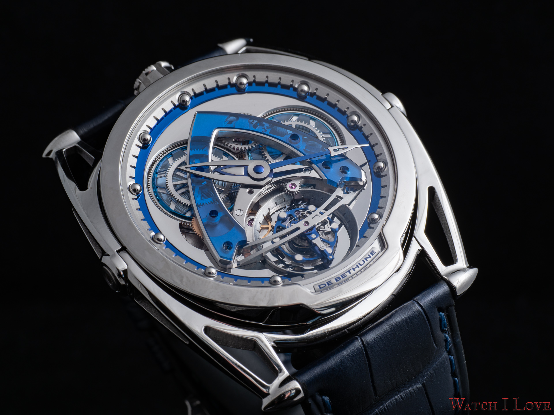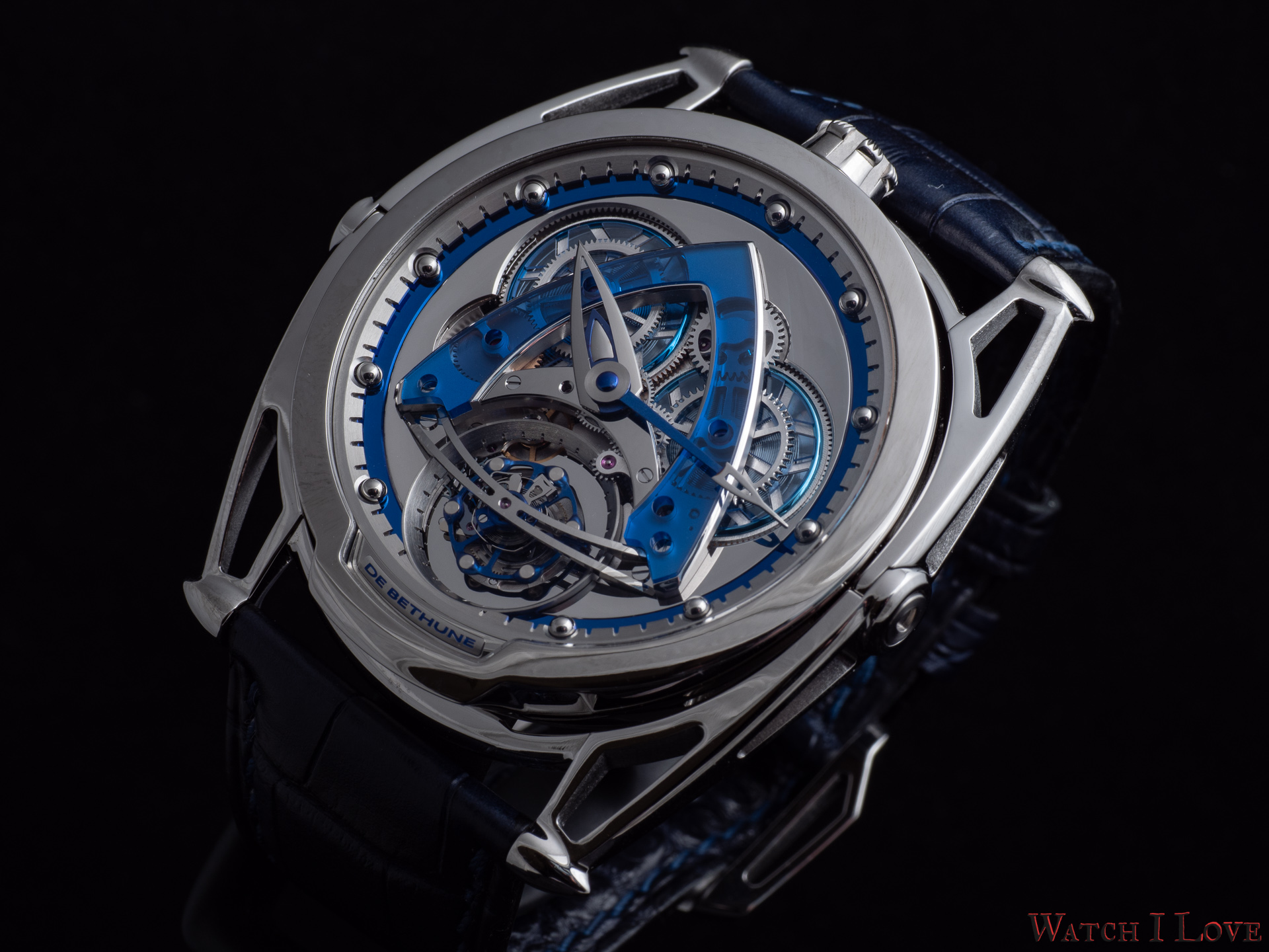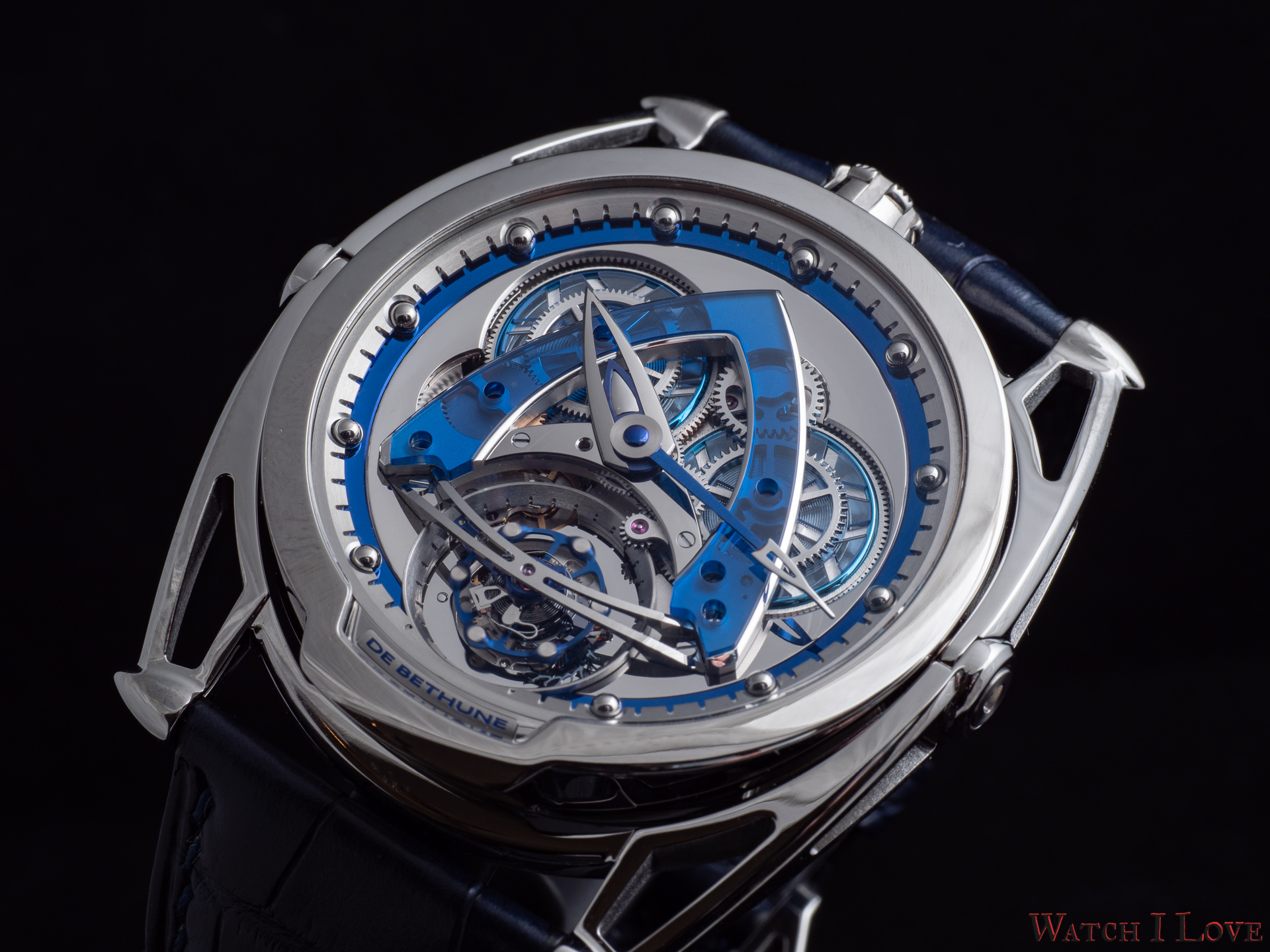 - Lugs: Polished grade 5 titanium floating lugs –De Bethune Patent (2006)