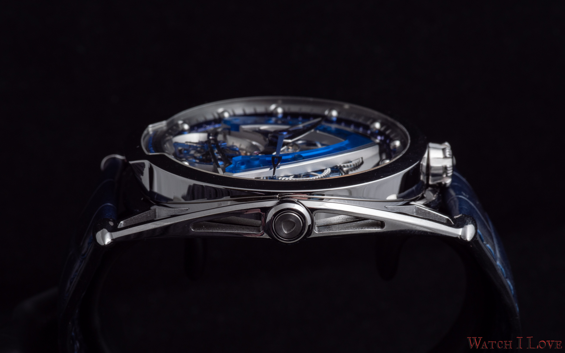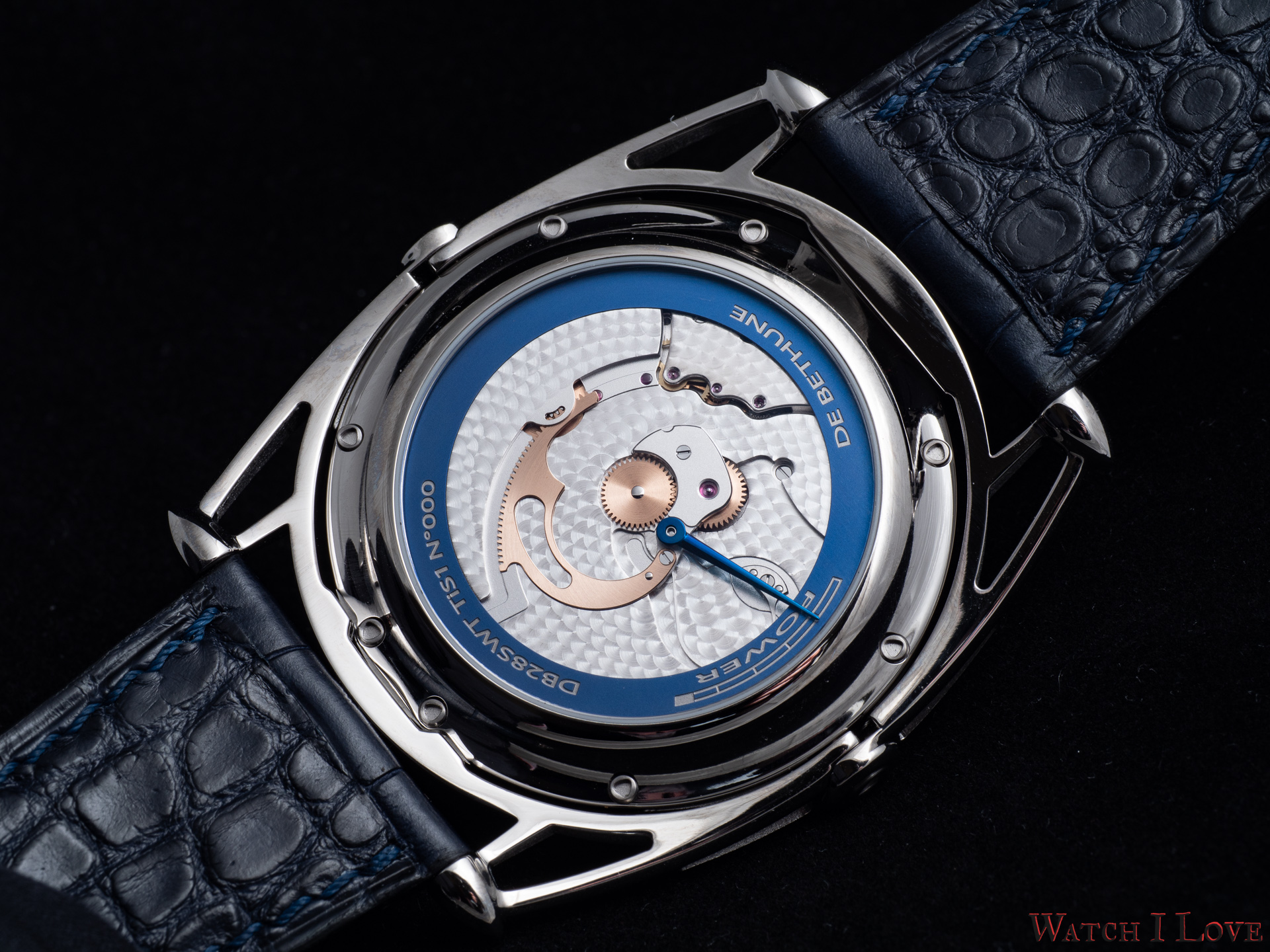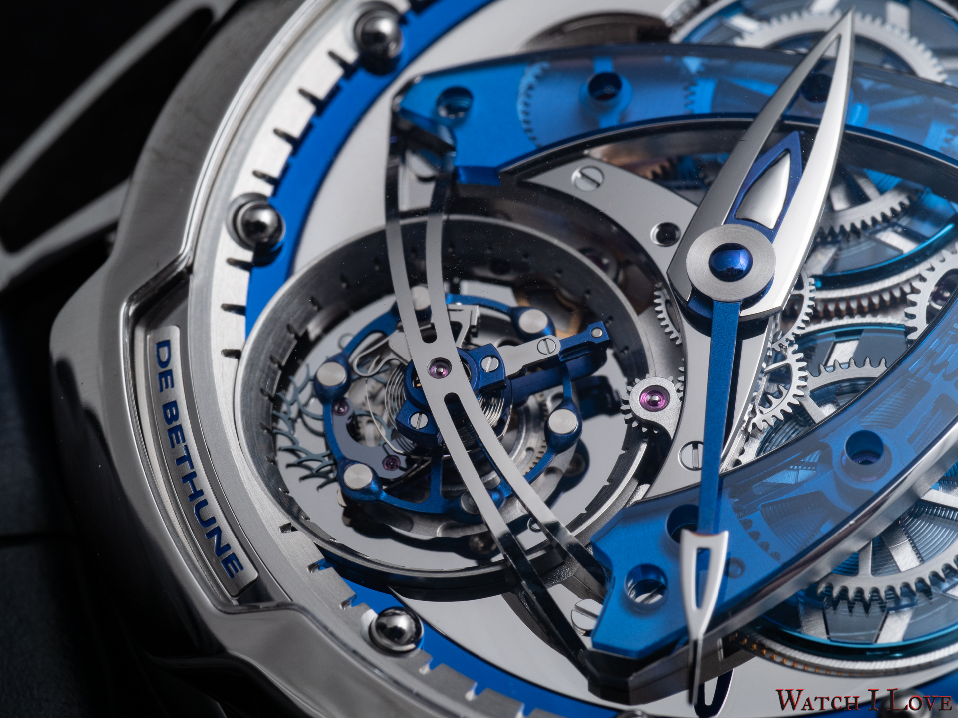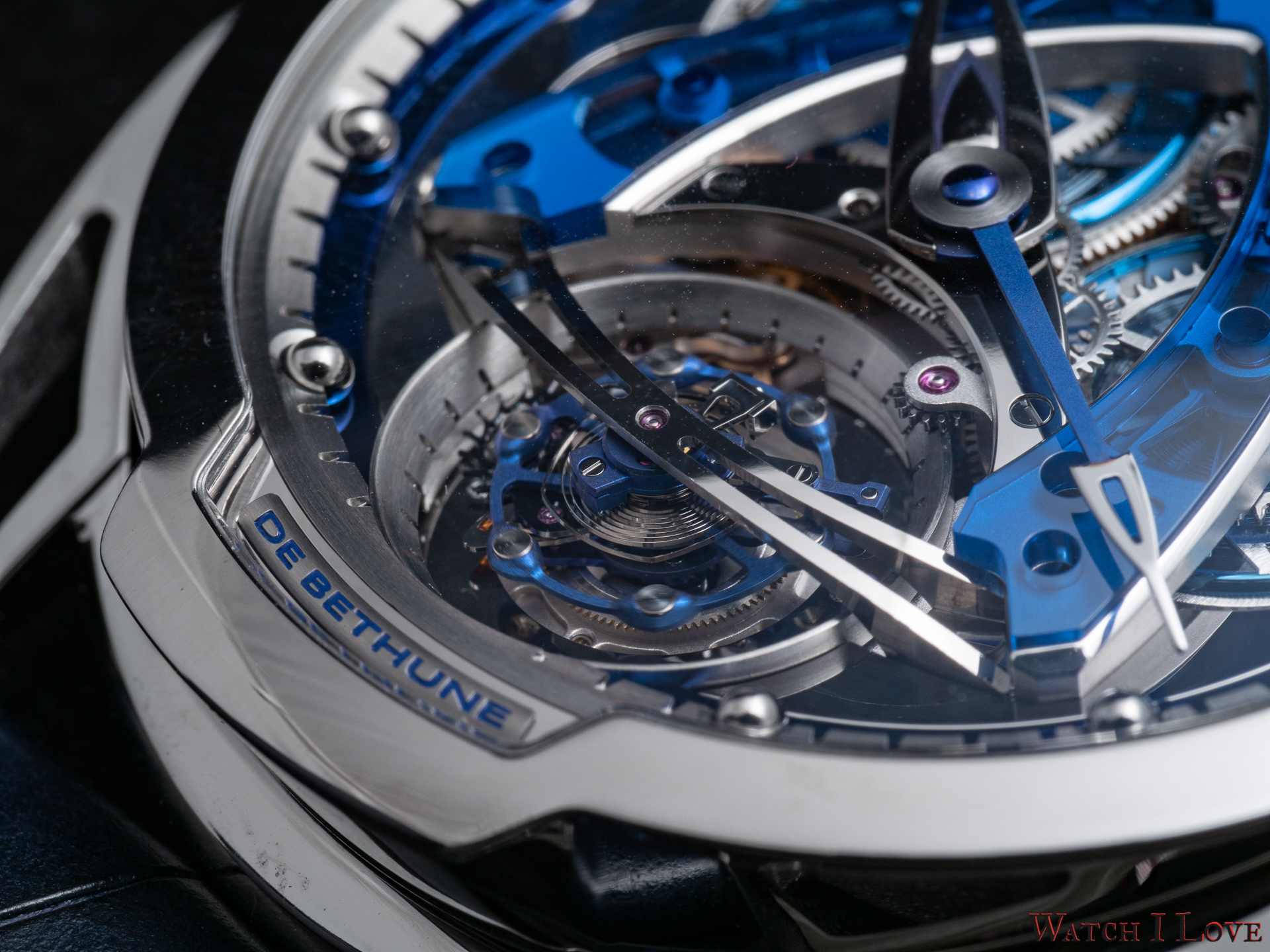 - Lugs: Polished grade 5 titanium floating lugs –De Bethune Patent (2006)