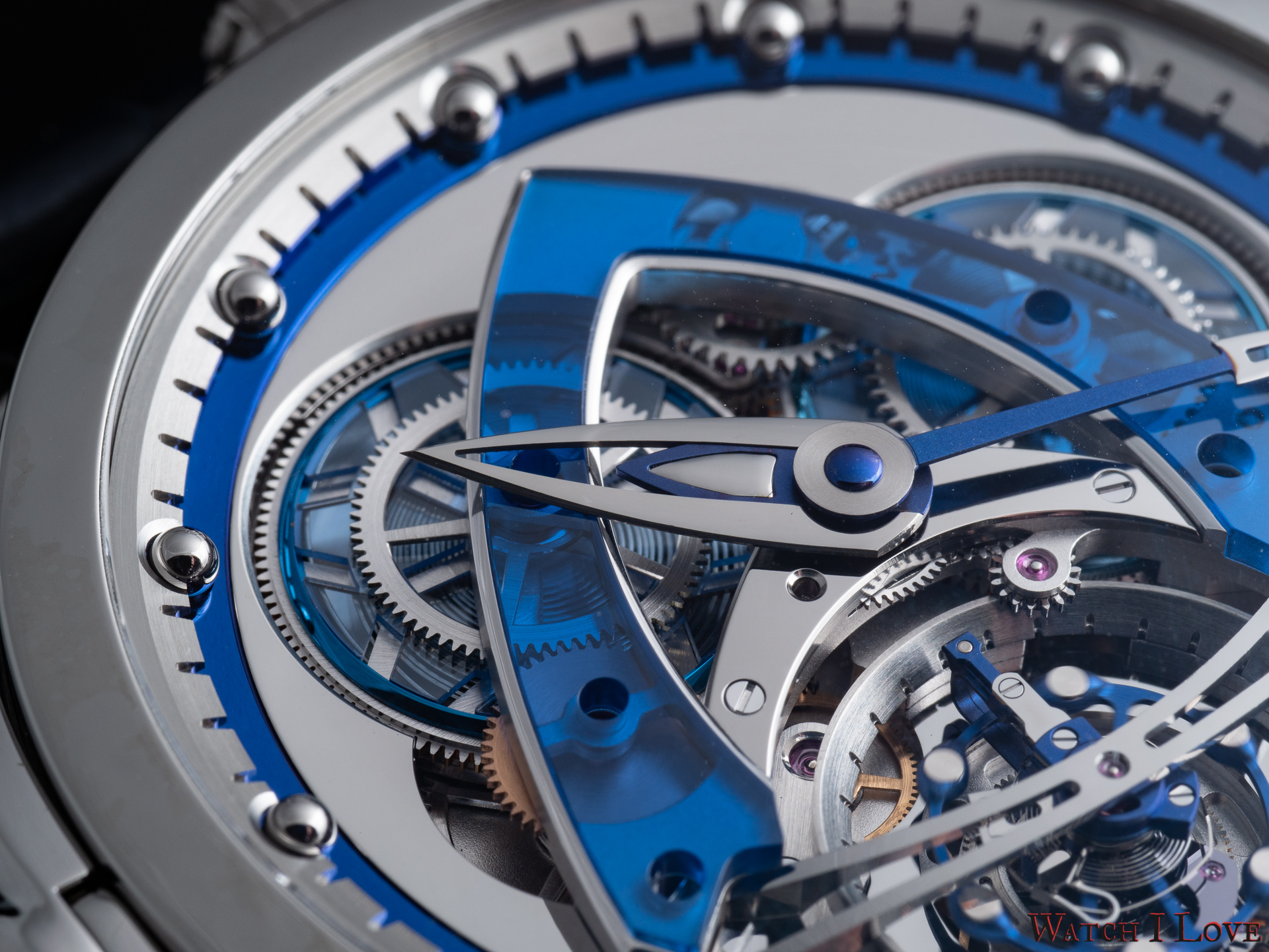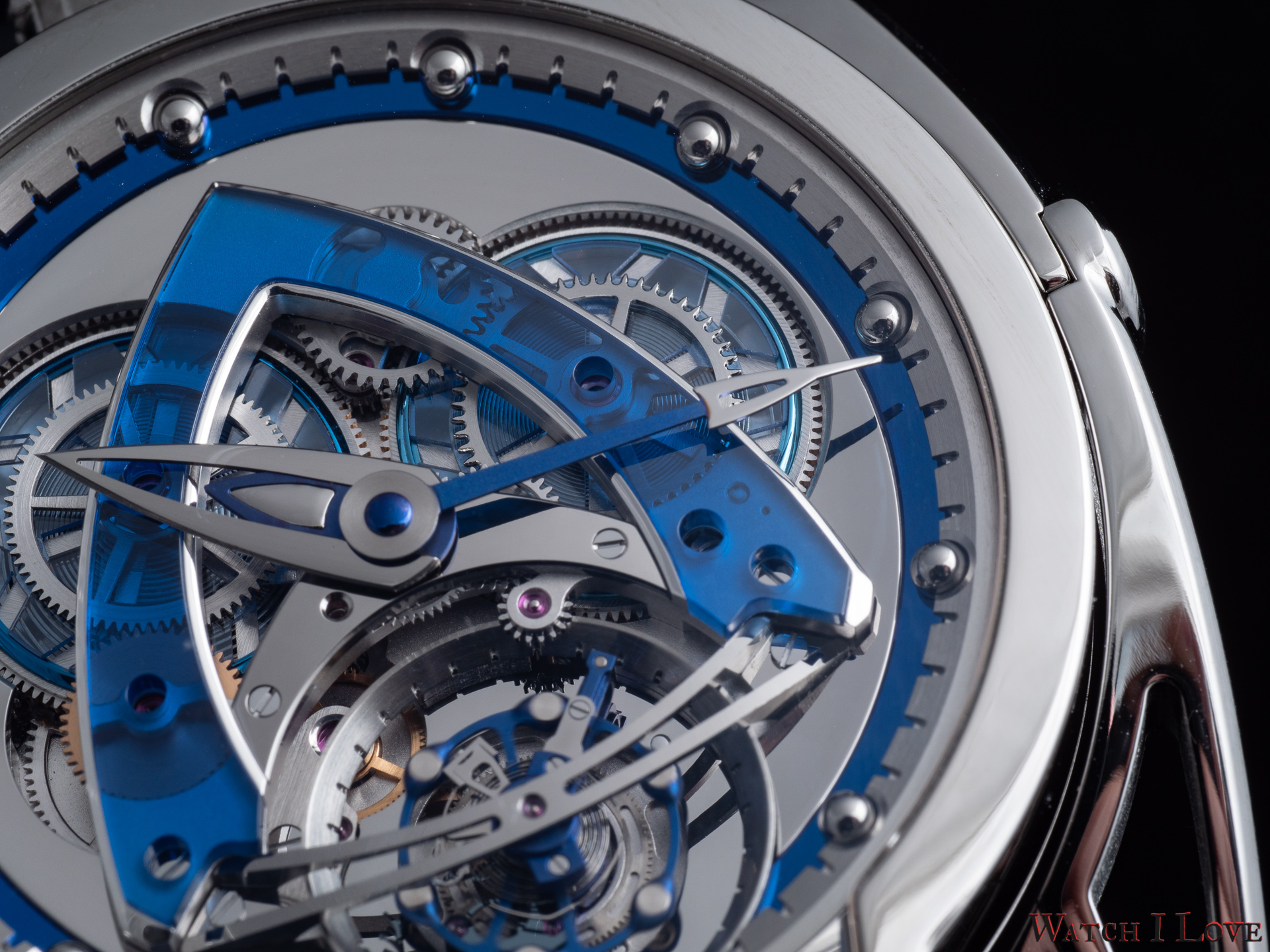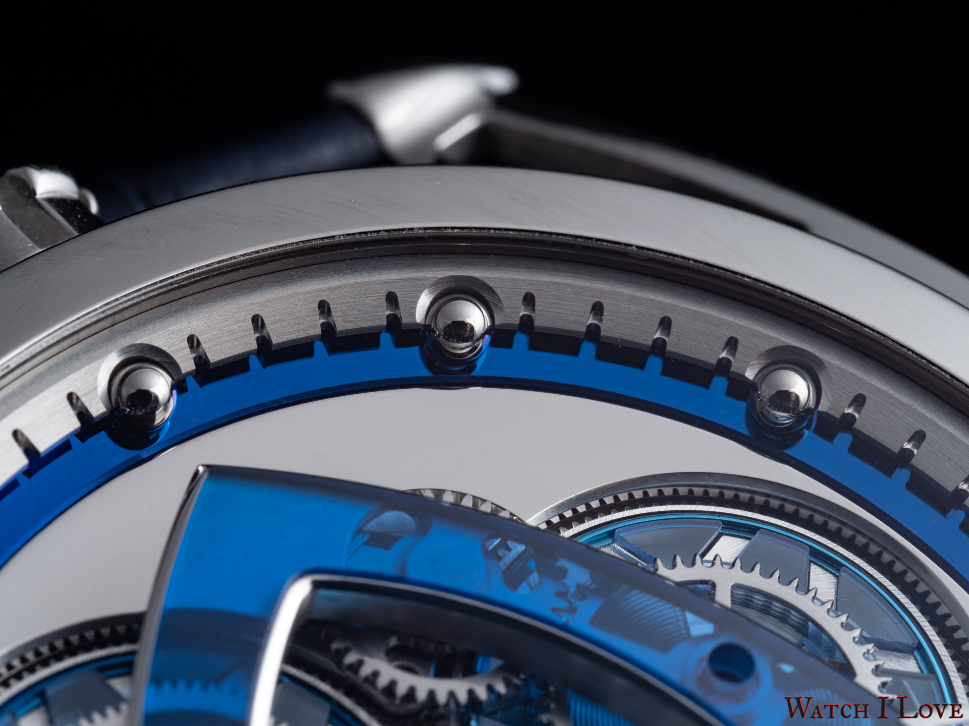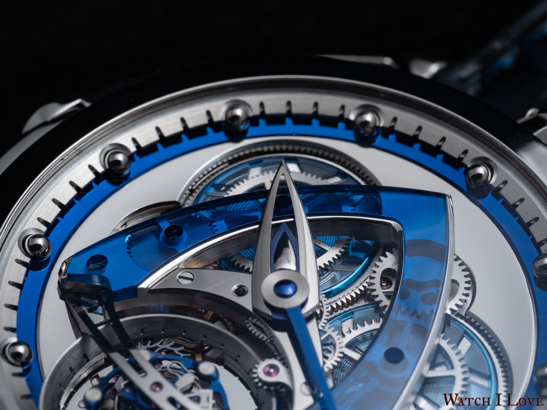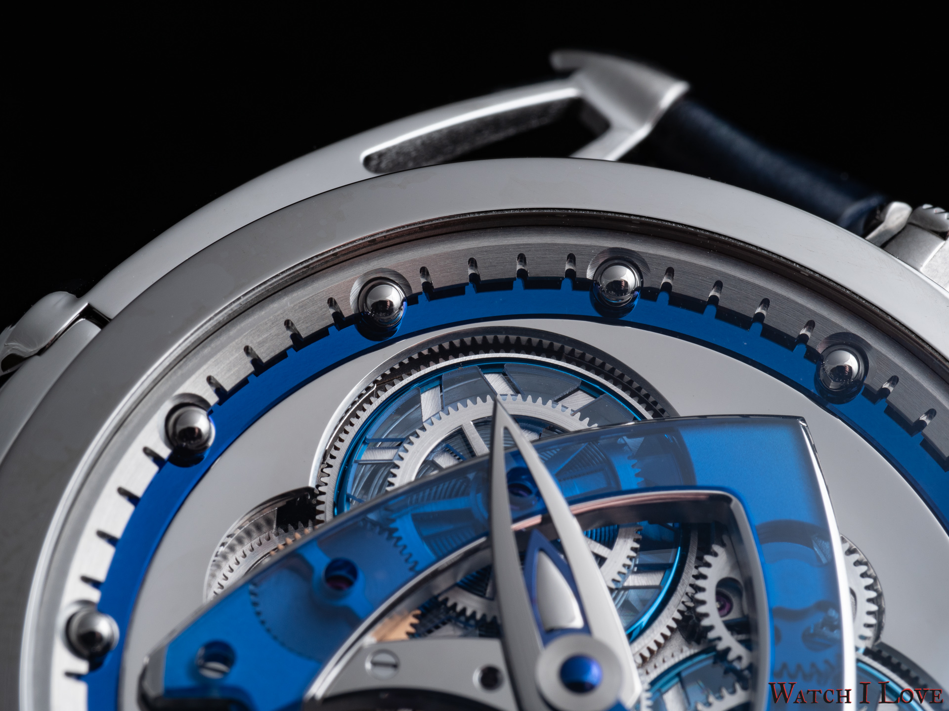 The minutes’ hands suffers from a similar choice of materials and finishes. Just the shaped was changed with a more slender form. We can see again the rocket/delta shape toward the end of the hand terminated with a bent tip. As indexes, the watch uses a ring with 60 teeth, where the in-between spaces serve as indexes (and as hours index holders). The blued metal ring increases contrast and legibility.