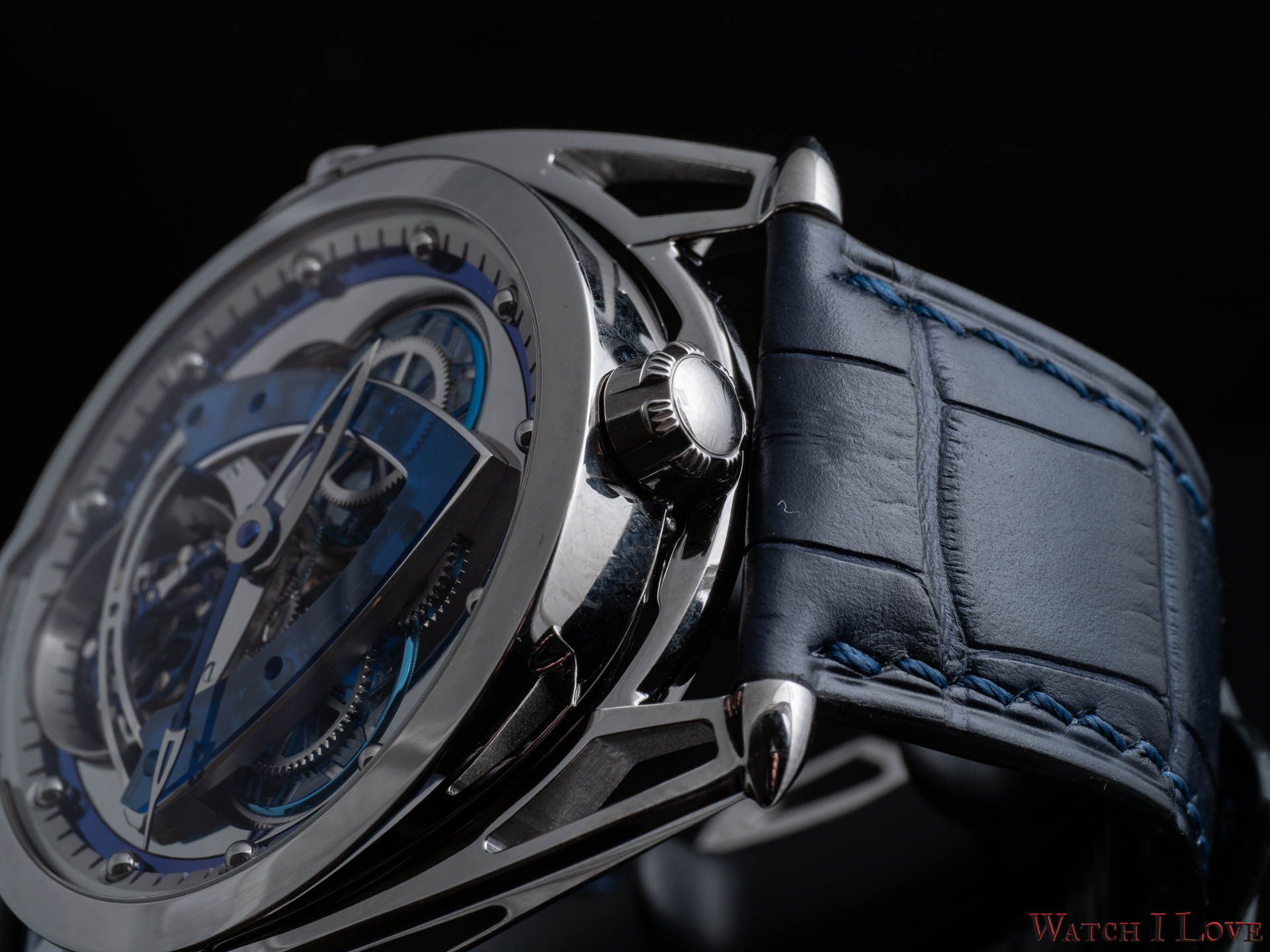 To complete the exterior good looking, De Bethune fitted the DB28 Steel Wheels Sapphire Tourbillon with a dark blue alligator strap and the signature skeletonised pin buckle. The combination is very organic and very De Bethune like… Again, the brand displays its expertise in working with titanium – perfectly polished titanium in a futuristic design.