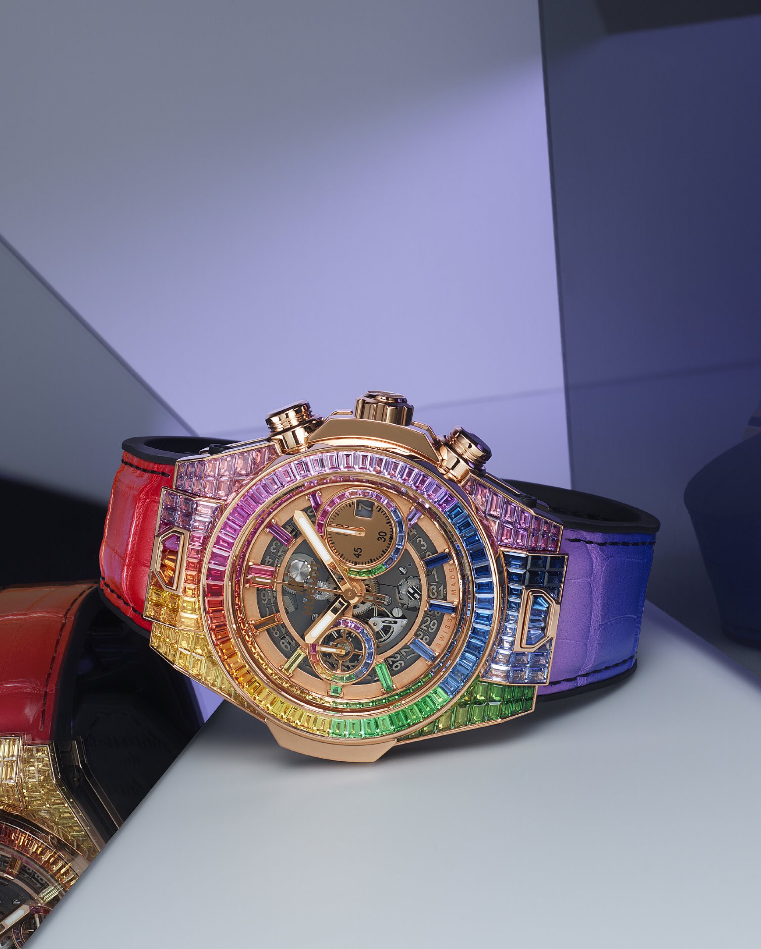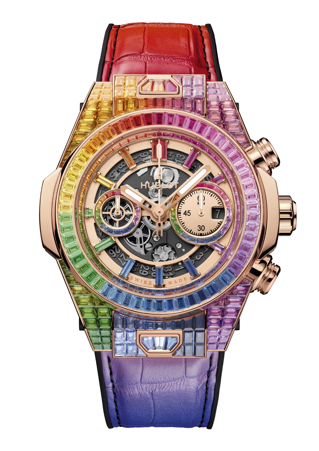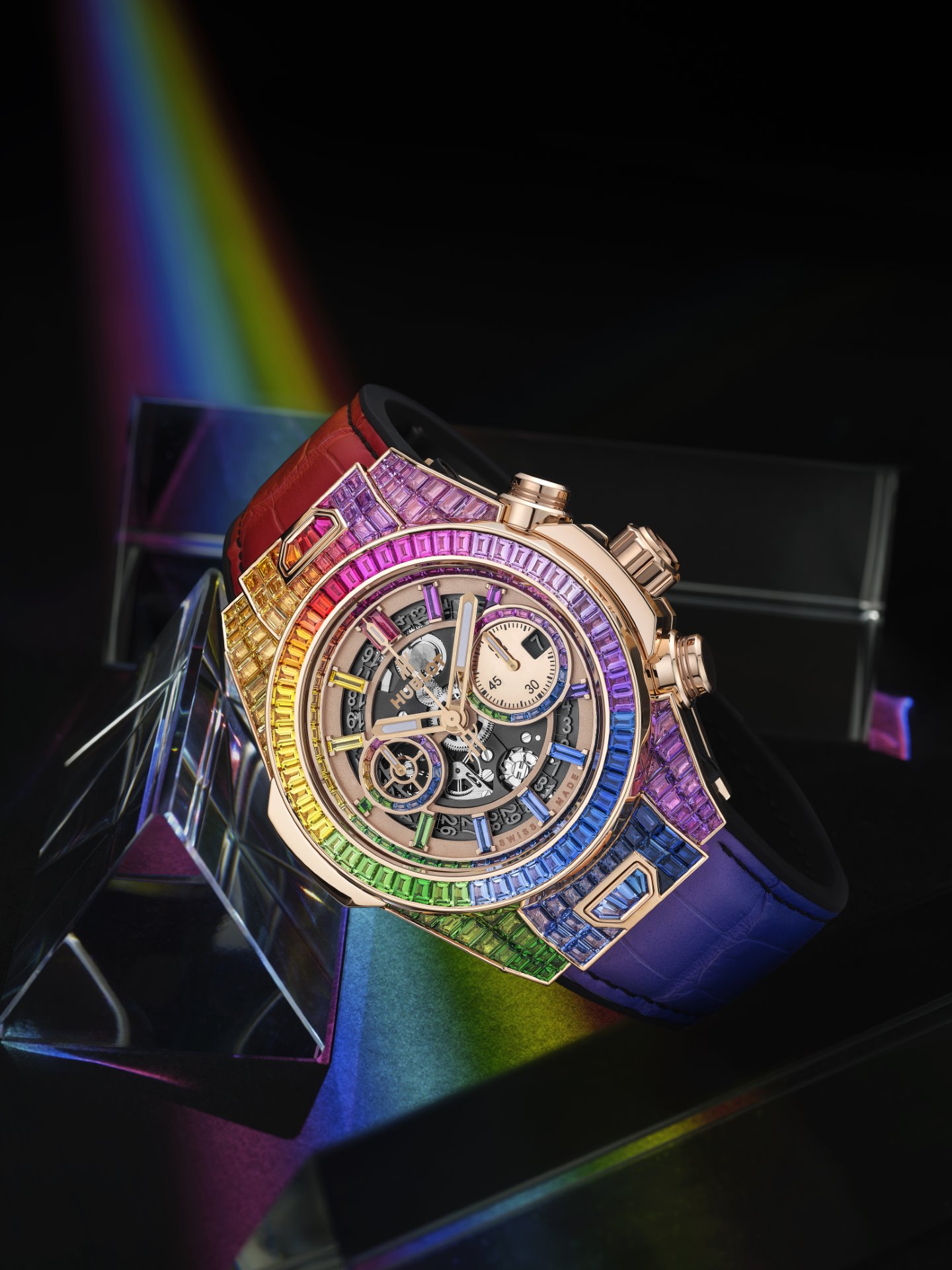 A symbol heralding optimism, wisdom and balance, the rainbow stretches across the entire 45-mm case; one hundred rubies, pink sapphires, amethysts, blue sapphires, blue topazes, tsavorites, and yellow and orange sapphires line up in a radiant chromatic composition. 112 baguette-cut gemstones edge its bezel in studied hues that echo the subtle shades of the 48 gemstones set on the dial and the indexes. The UNICO manufacture HUB1242 chronograph flyback mechanism with double clutch mechanism and column wheel appears in contrast. Putting the finishing touches to this jewellery piece, the celestial phenomenon unfolds across the alligator and natural rubber strap and illuminates the buckle clasp set with 30 other gemstones.