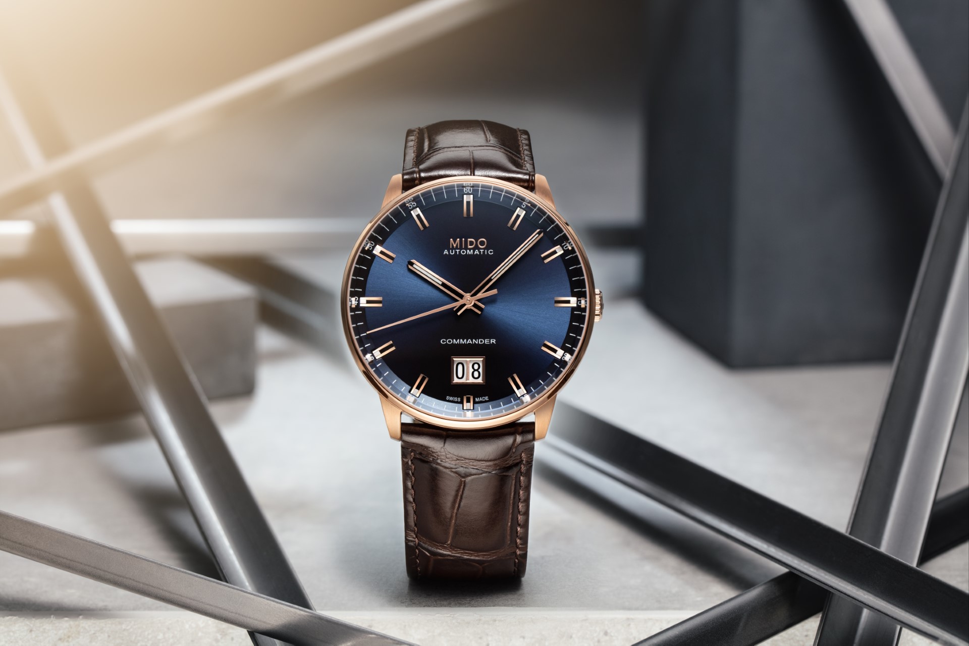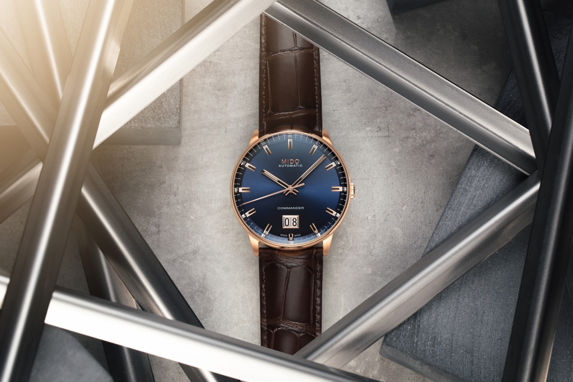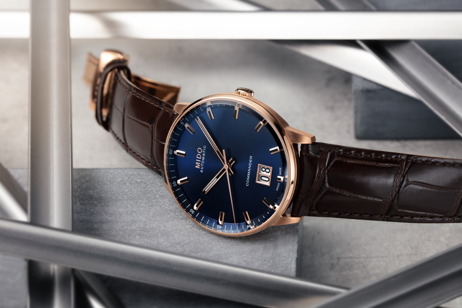 With its deep blue dial and refined rose-gold-coloured touches, the Mido Commander Big Date elegantly offers a new interpretation of the legendary aesthetic codes that define the Commander collection.