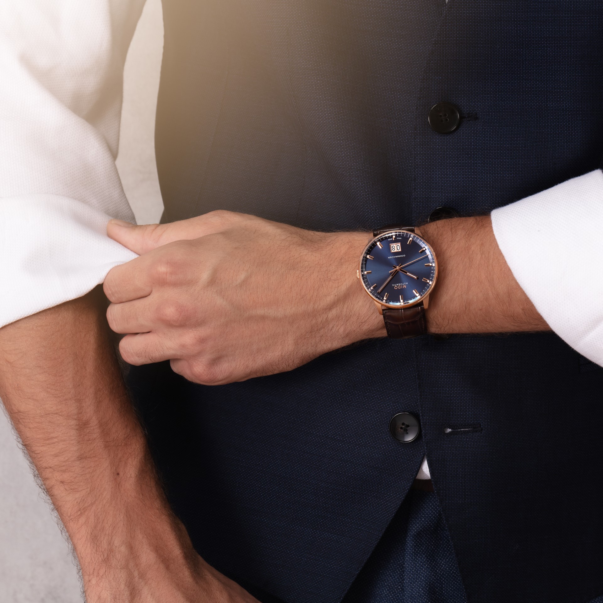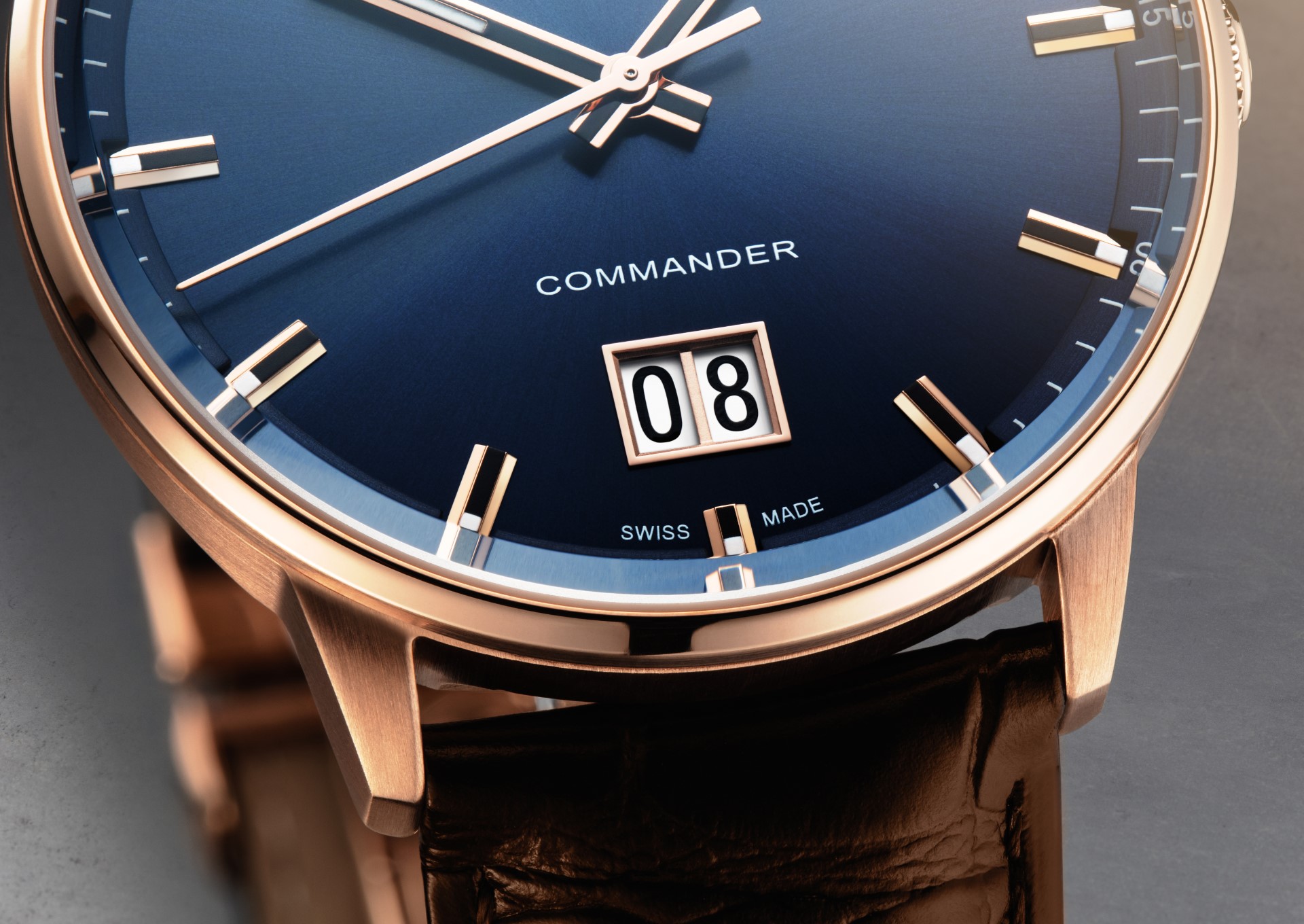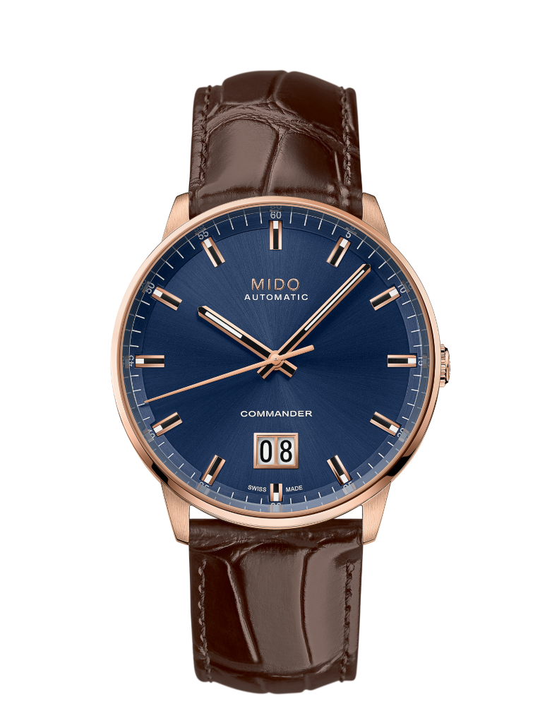 With its deep blue dial and refined rose-gold-coloured touches, the Mido Commander Big Date elegantly offers a new interpretation of the legendary aesthetic codes that define the Commander collection.