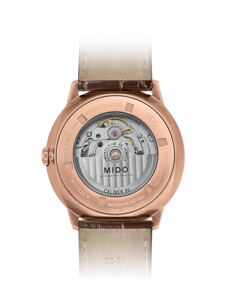 - Finely decorated Elaboré-grade movement, oscillating weight decorated with Geneva stripes and the Mido logo.