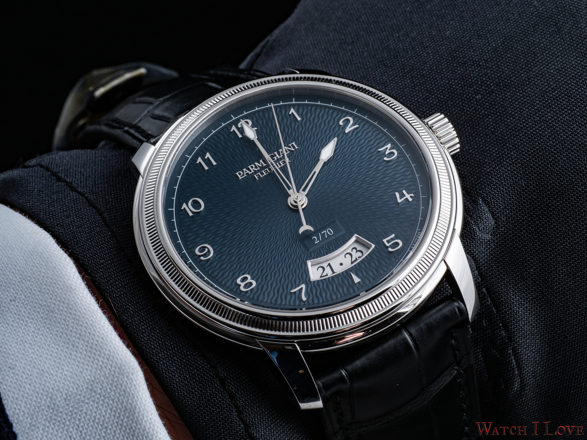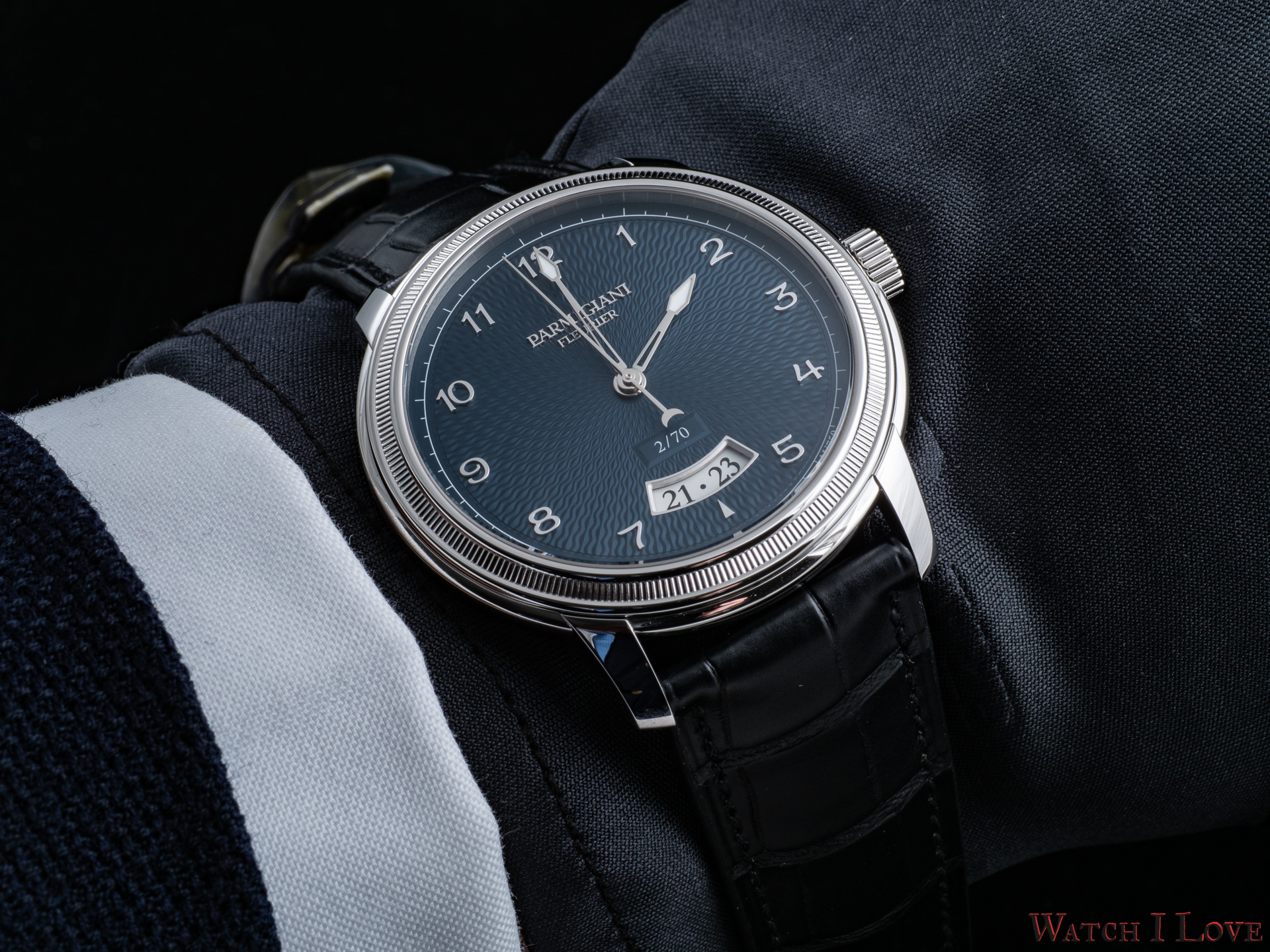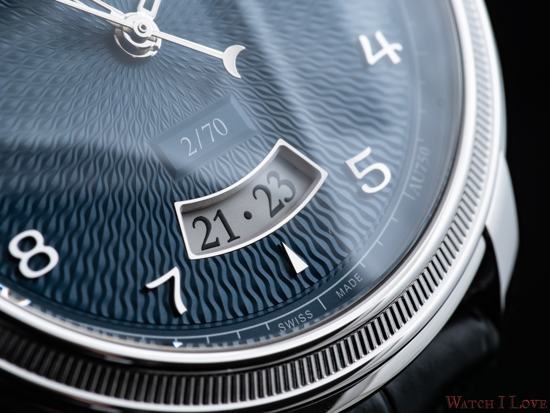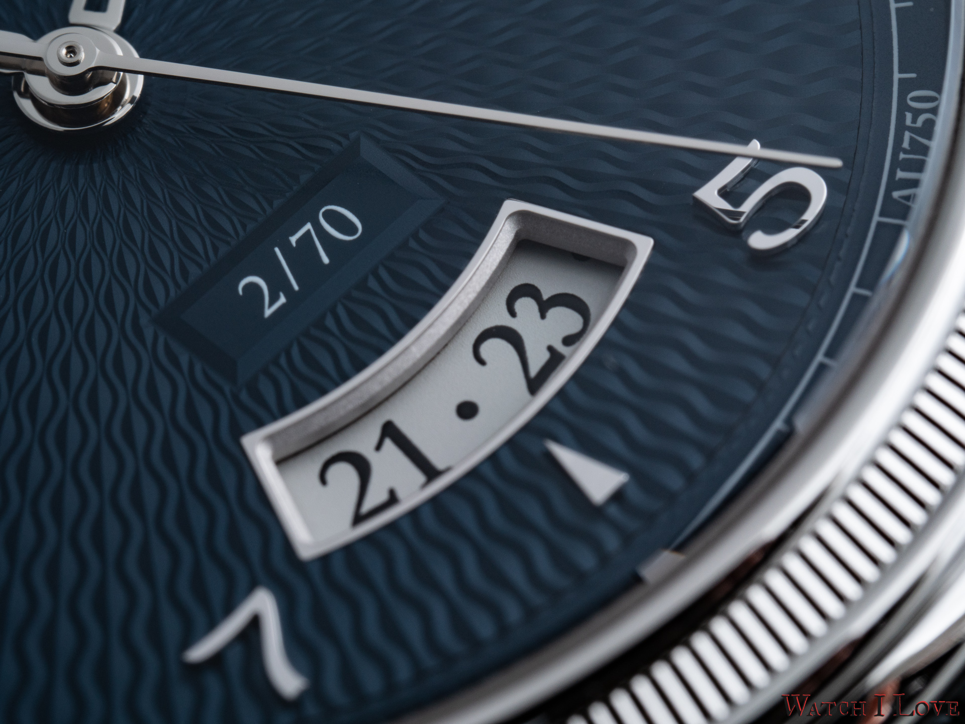 The date is revealed on the lower side of the dial via a curved aperture. Note the richness of details implied.