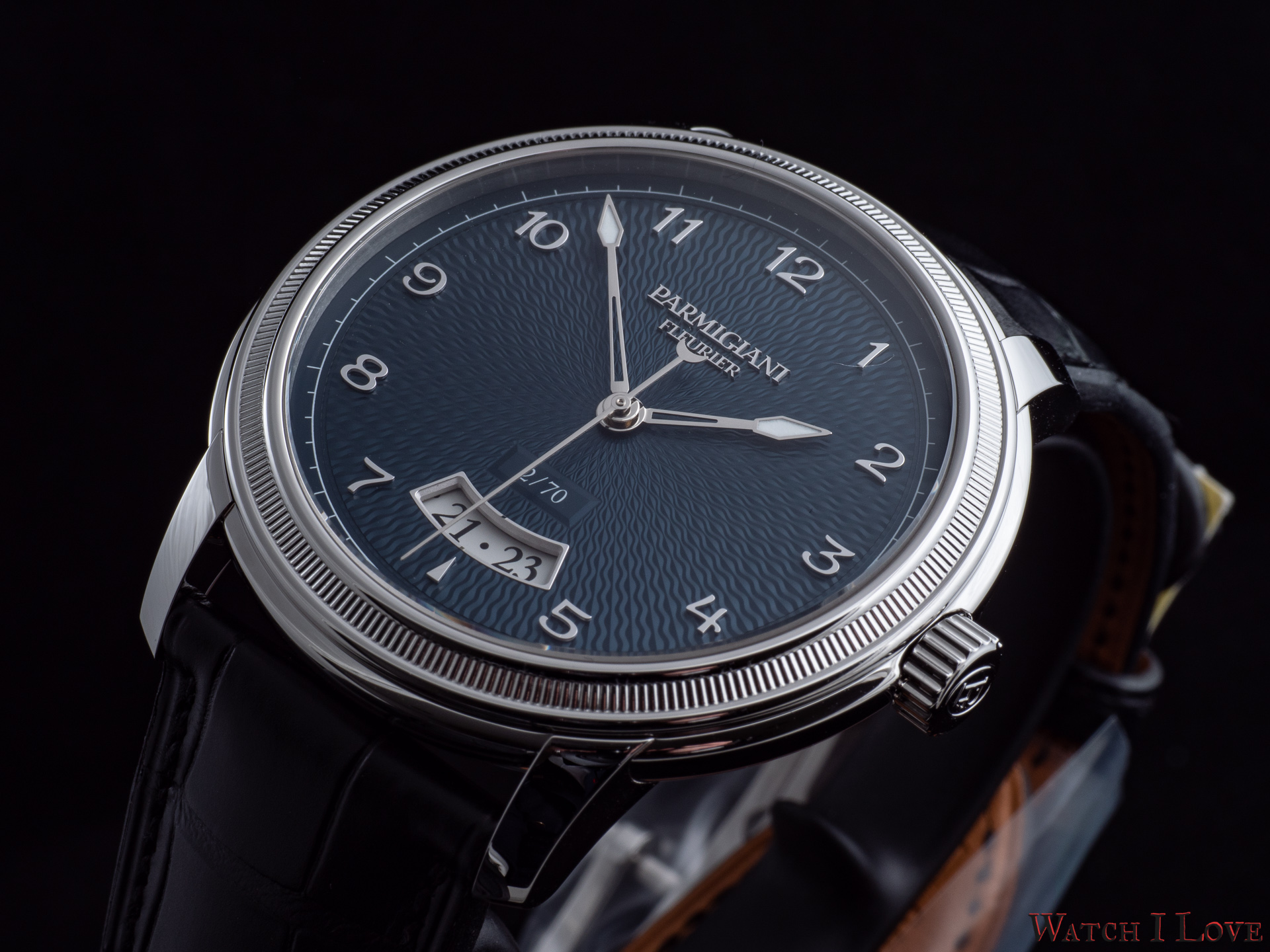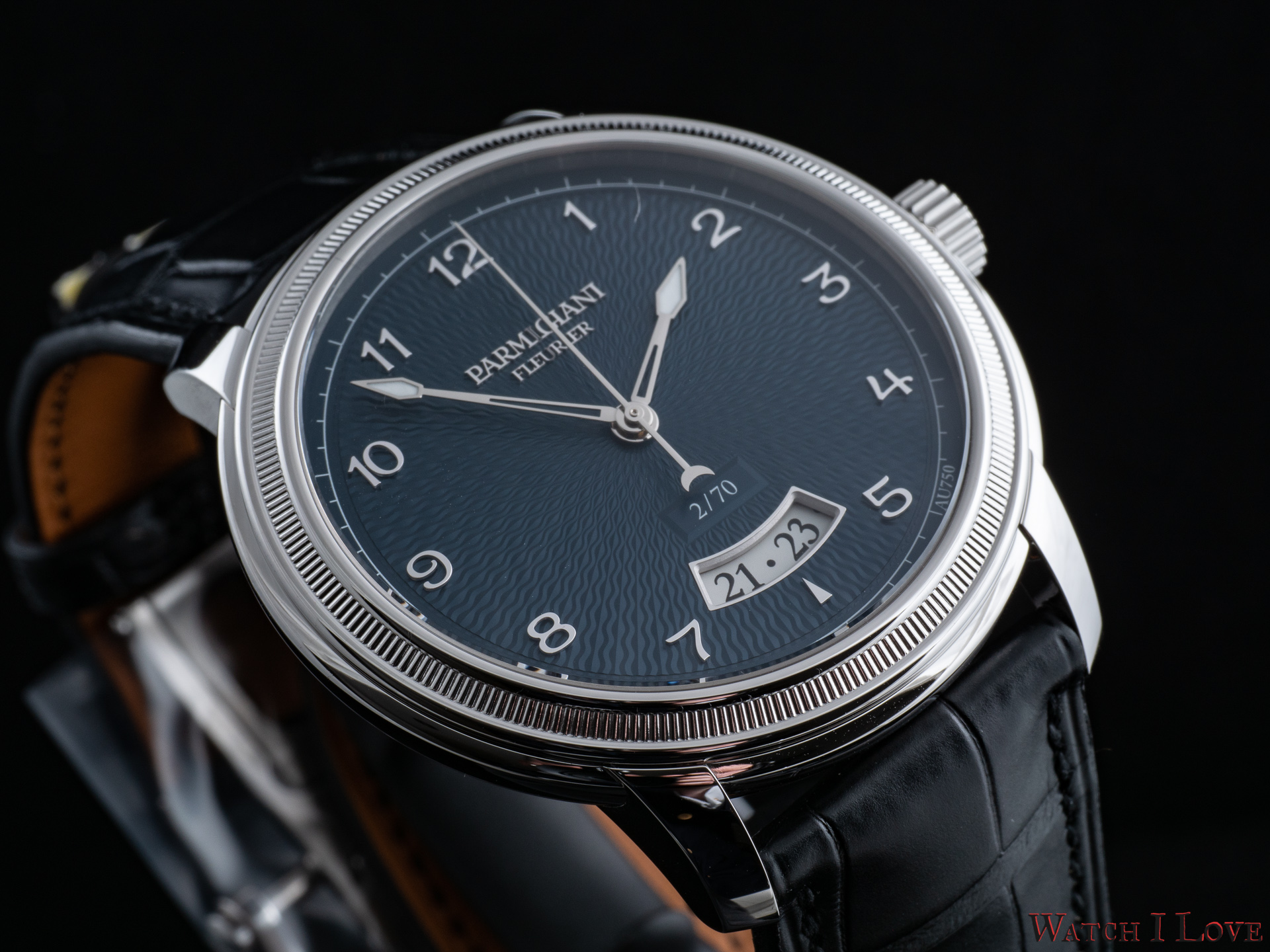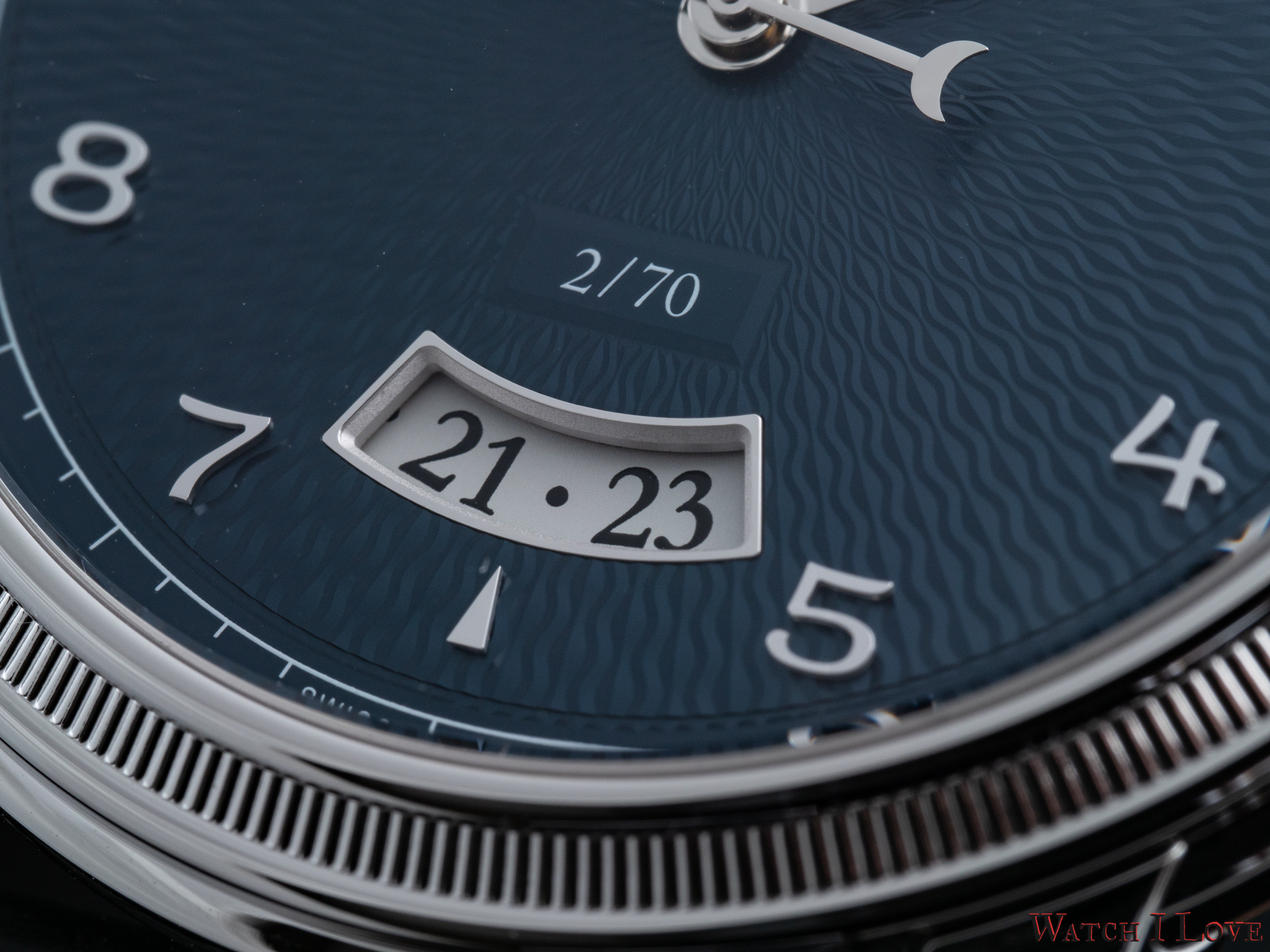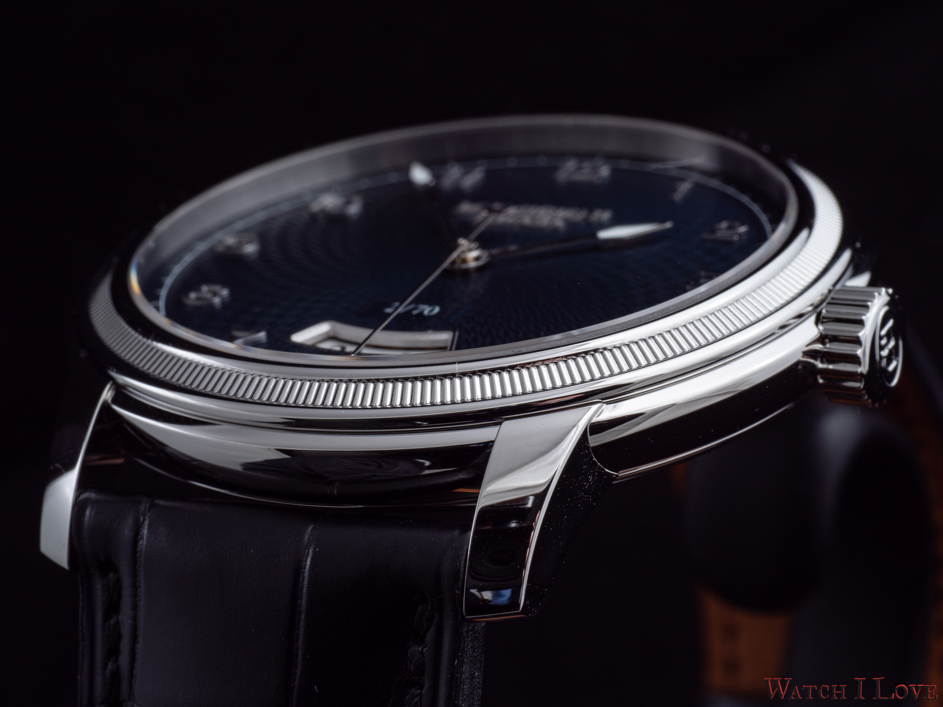 The date is revealed on the lower side of the dial via a curved aperture. Note the richness of details implied.